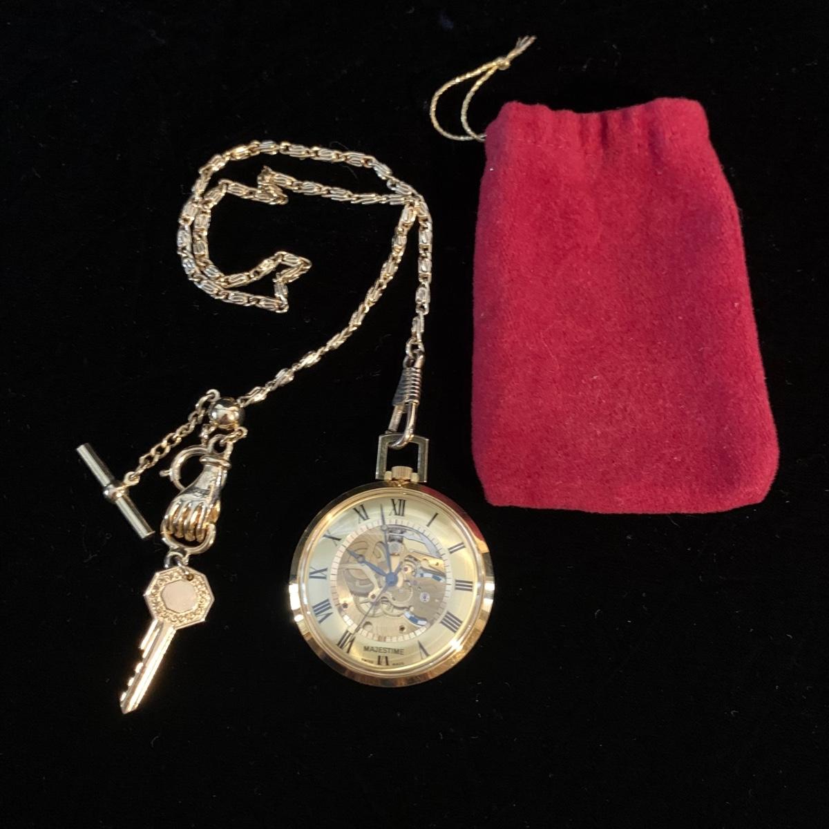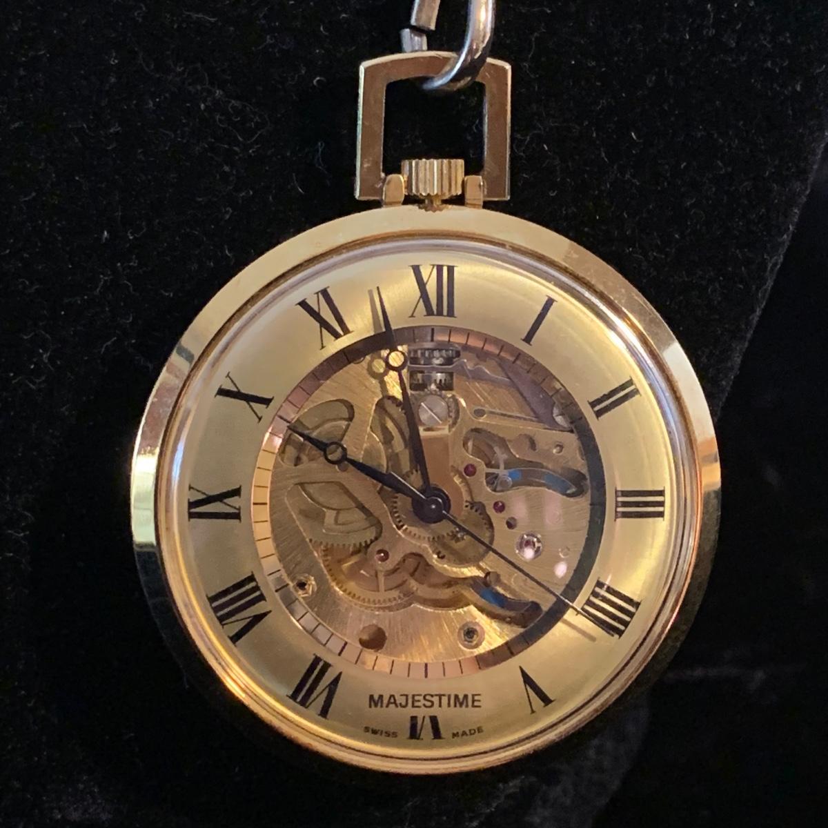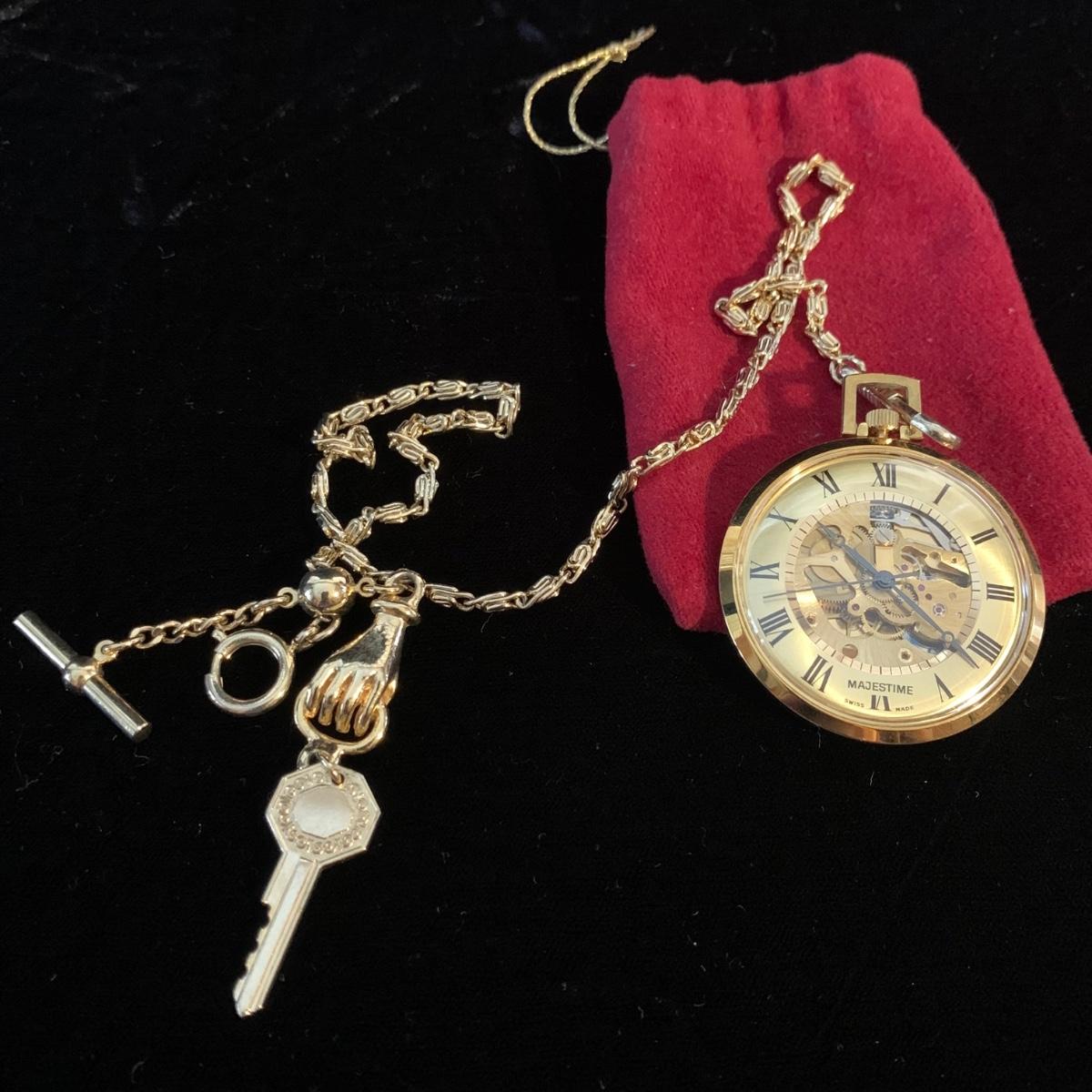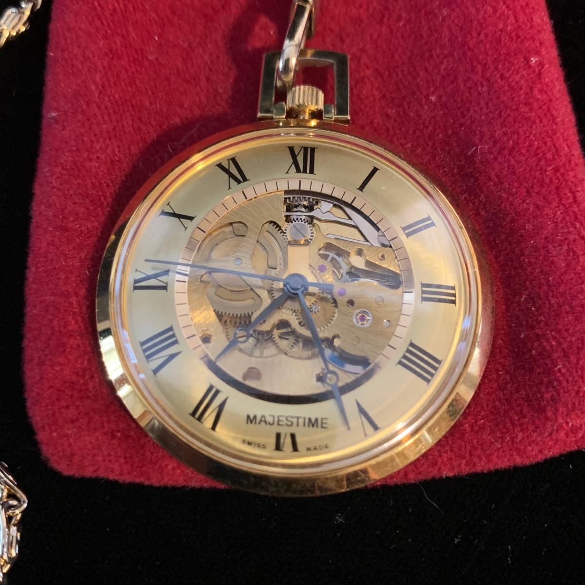 Swiss made Majestime pocket watch on a 15” chain. Pocket watch functions when wound, and seems to be in good condition. Comes with a small red velour bag.