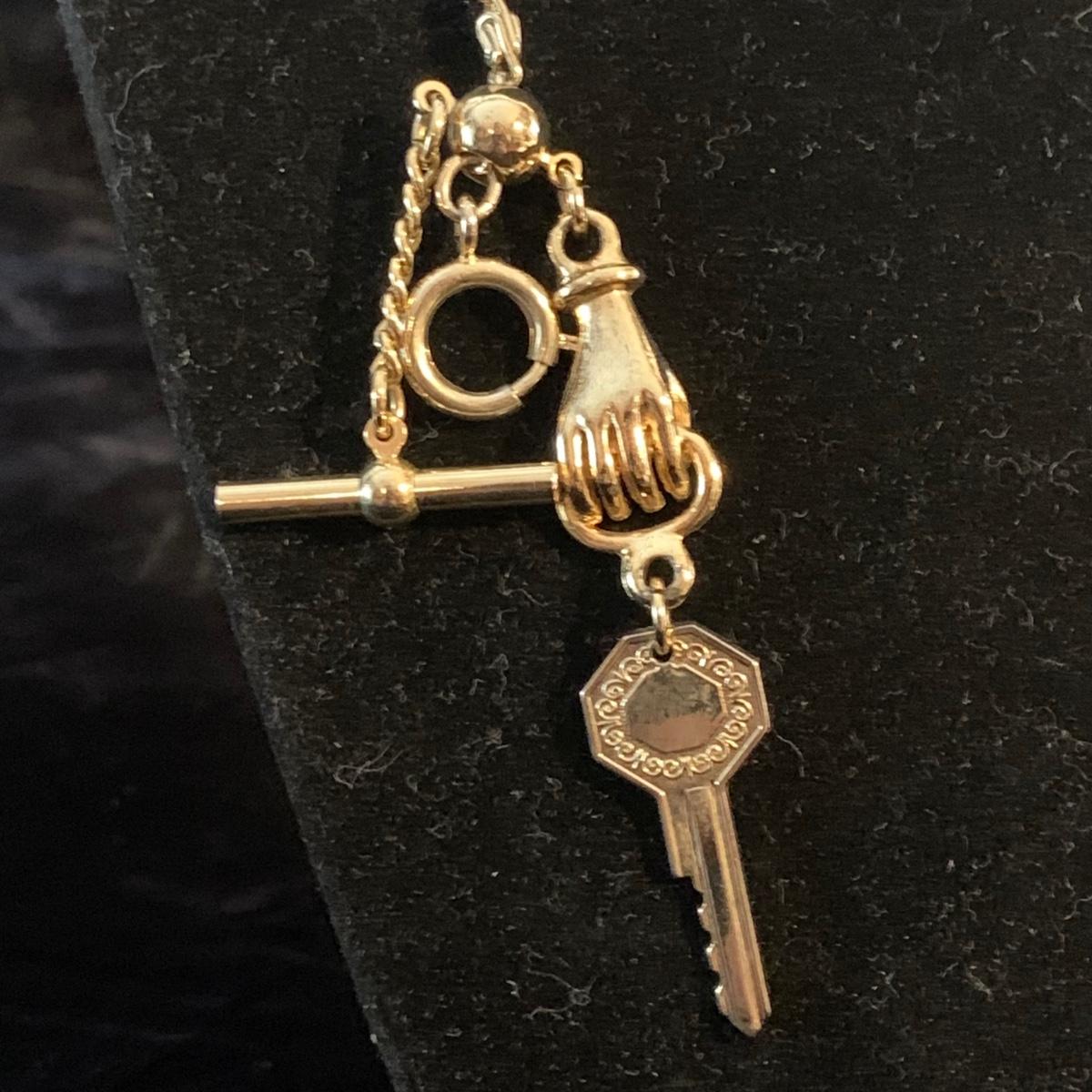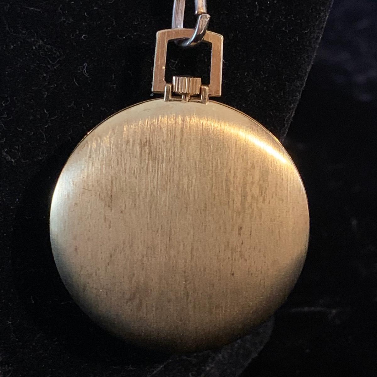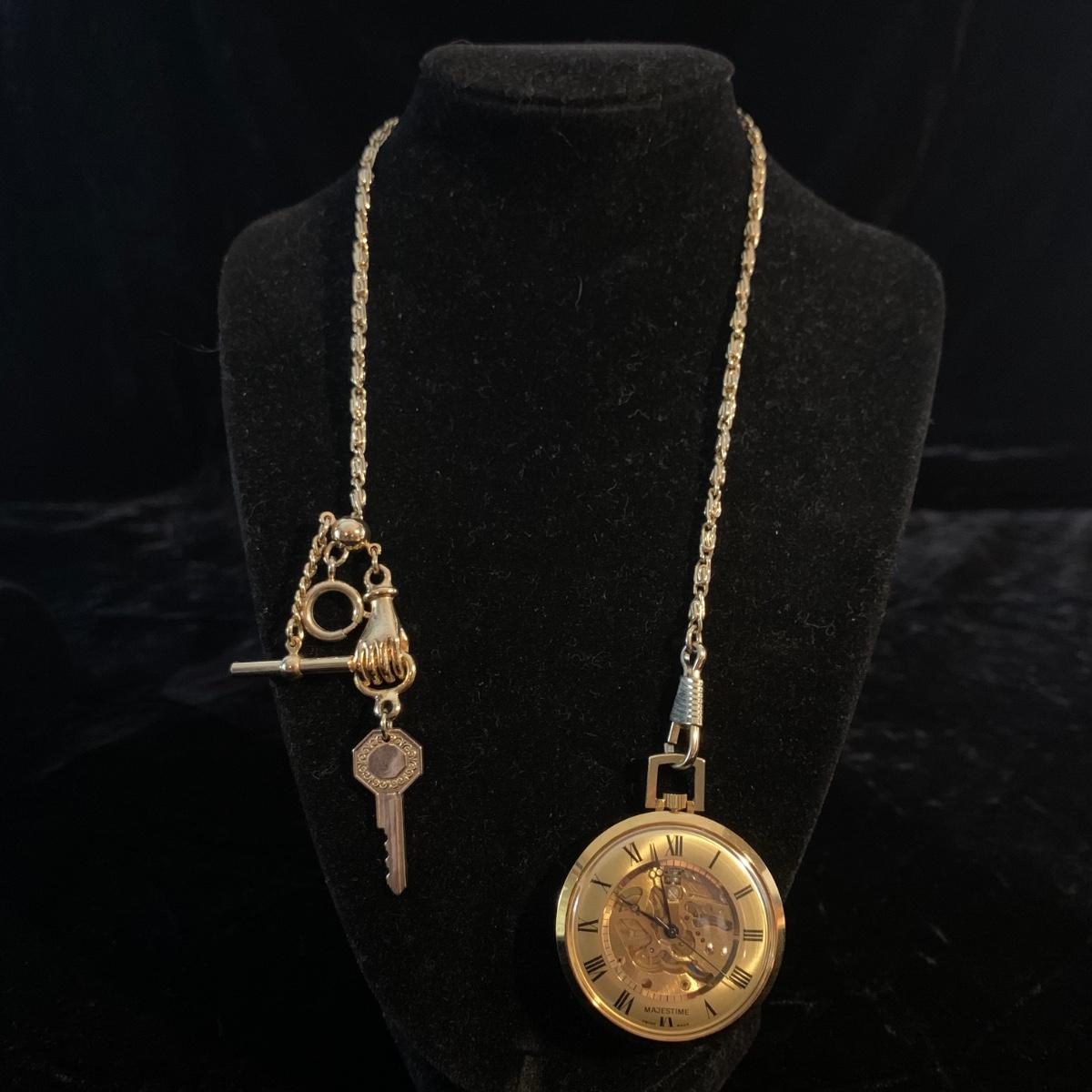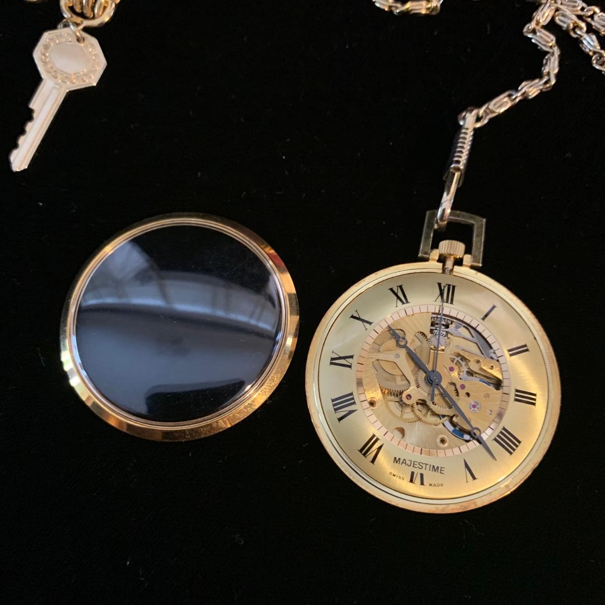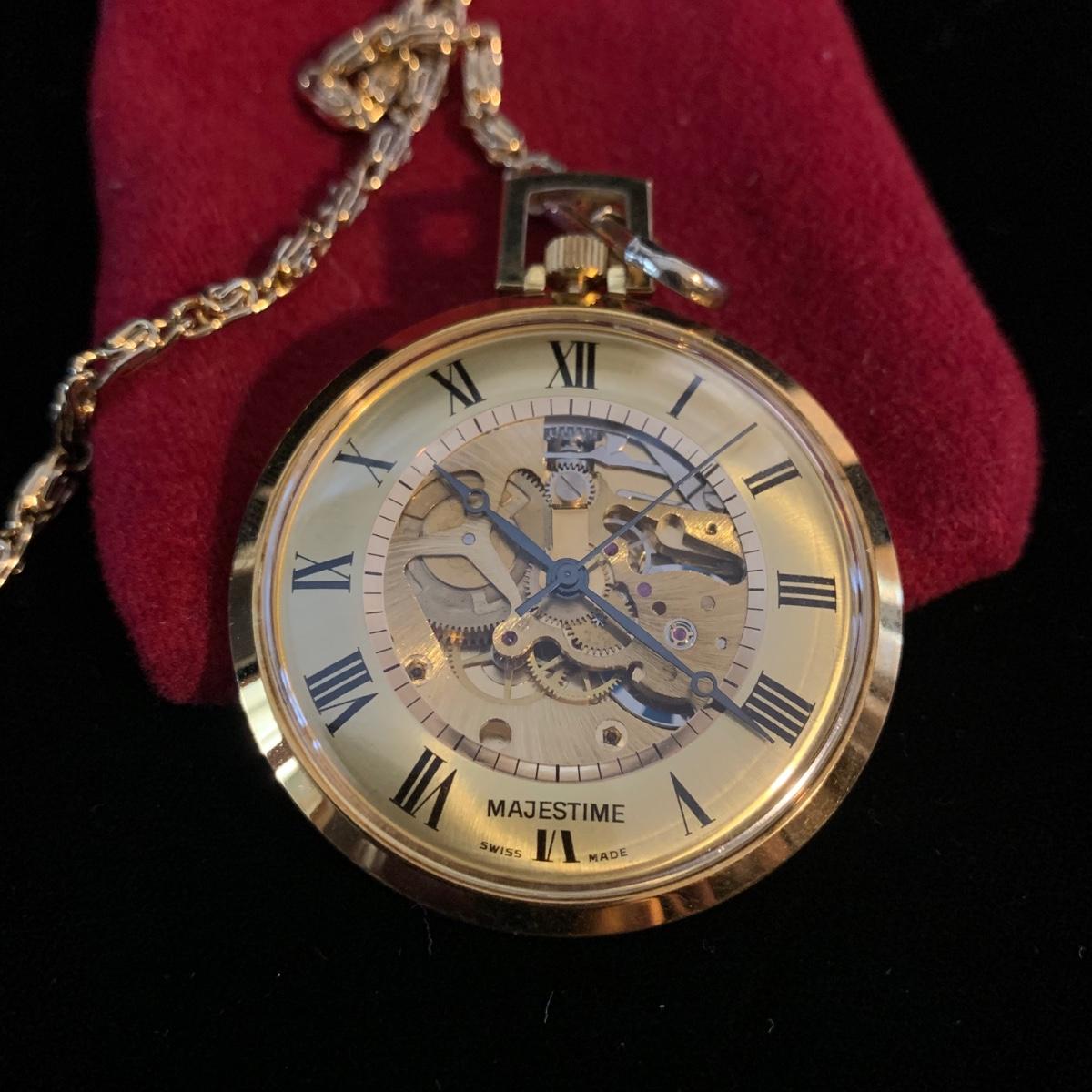 Swiss made Majestime pocket watch on a 15” chain. Pocket watch functions when wound, and seems to be in good condition. Comes with a small red velour bag.