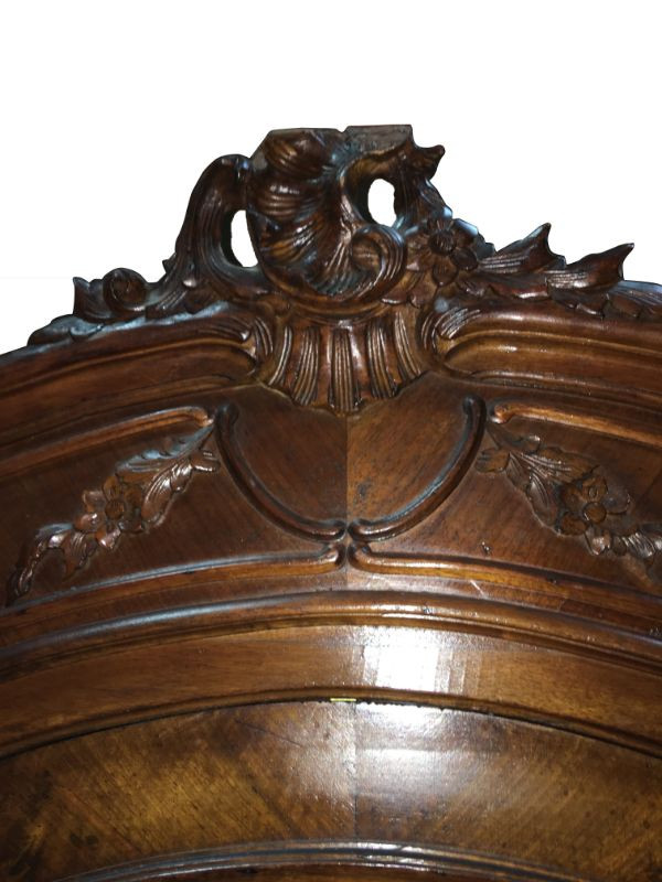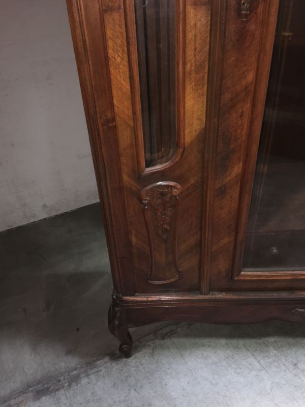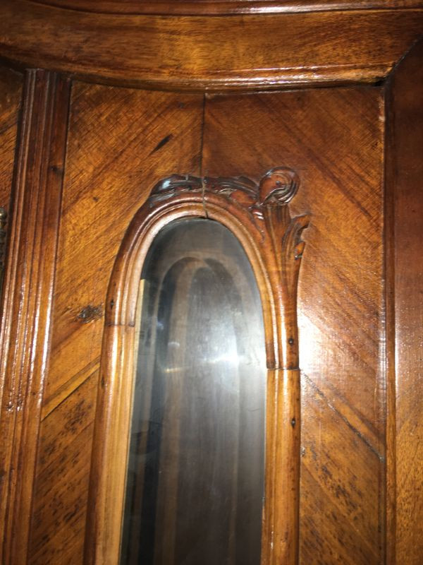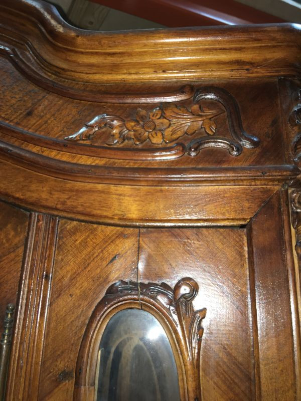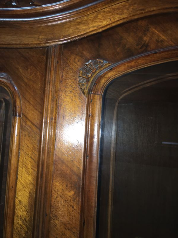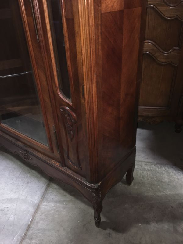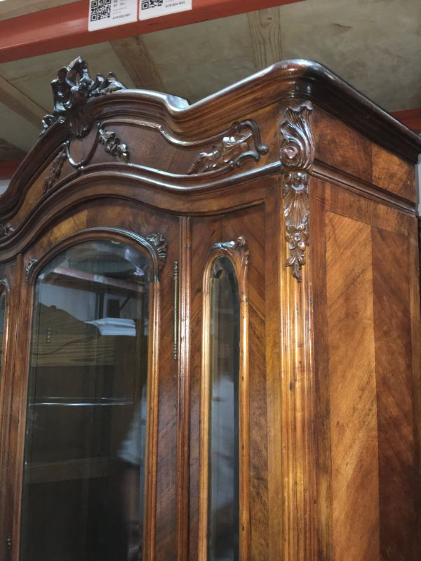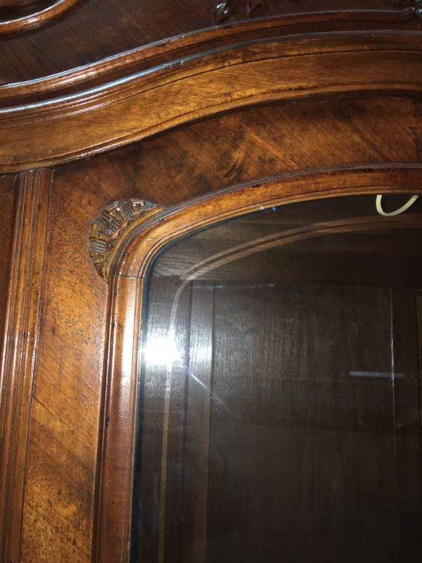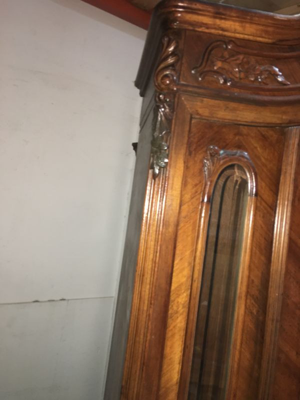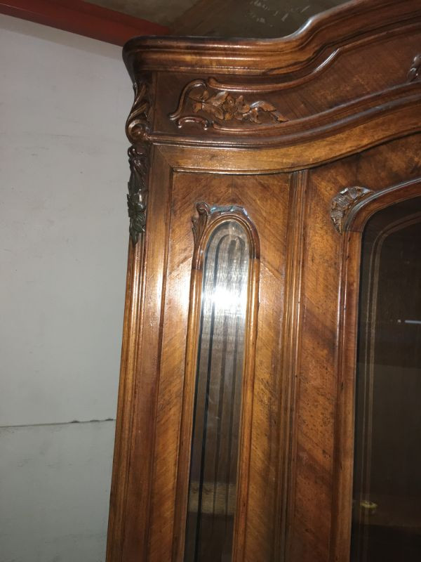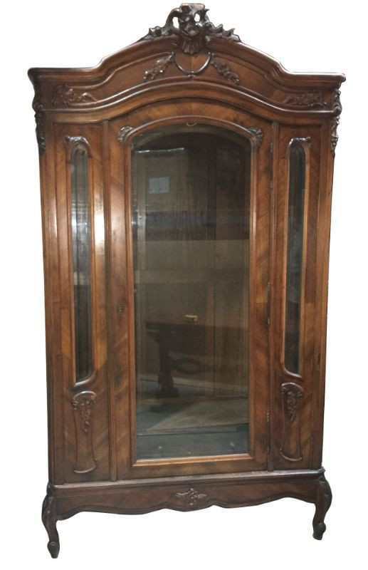 This is a gorgeous antique armoire made probably of walnut which given it is age I would say is in very good conditions. Beautifully hand carved along the front and the top of the sides, beveled glass top and bottom in the middle and all around the glass sides. There is a beautiful carving on the top of the armoire which is missing the upper part, maybe about 1" to 1.5". Also, there is no lock and key and inside the armoire as you can see in the pictures, there is a drawer at the bottom and a shelf. So, it requires minimum work but we have wrapped some glass shelves which can be viewed at the time of the pick-up and if they are part of the armoire you can take them. It has a light top the of interior which works. Probably added later.
