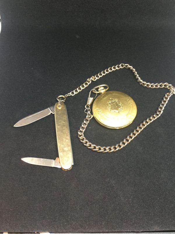 The chain of this pocket watch has a built in knife. The watch is in good condition and has an engraving on the inside of the front cover that says "With Love Deb".