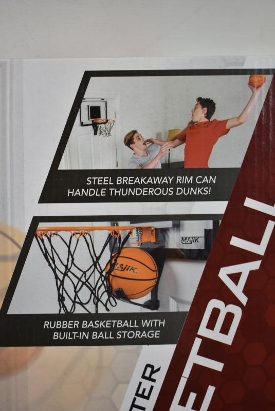 Majik Buzzer Beater Basketball; Pro-Style Backboard and Breakaway Rim Hangs on Door. Missing Air Pump Needle. Otherwise NEw & Complete
