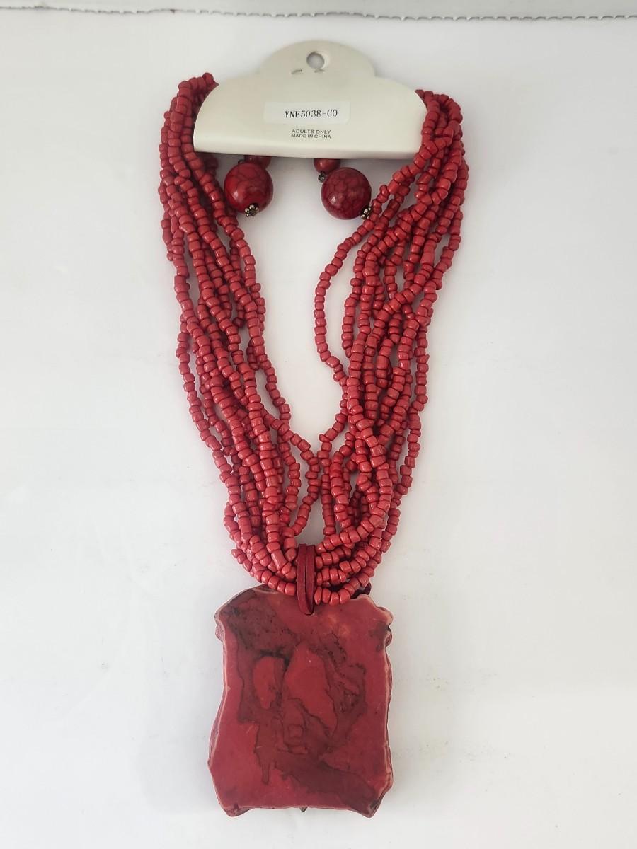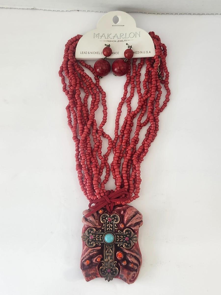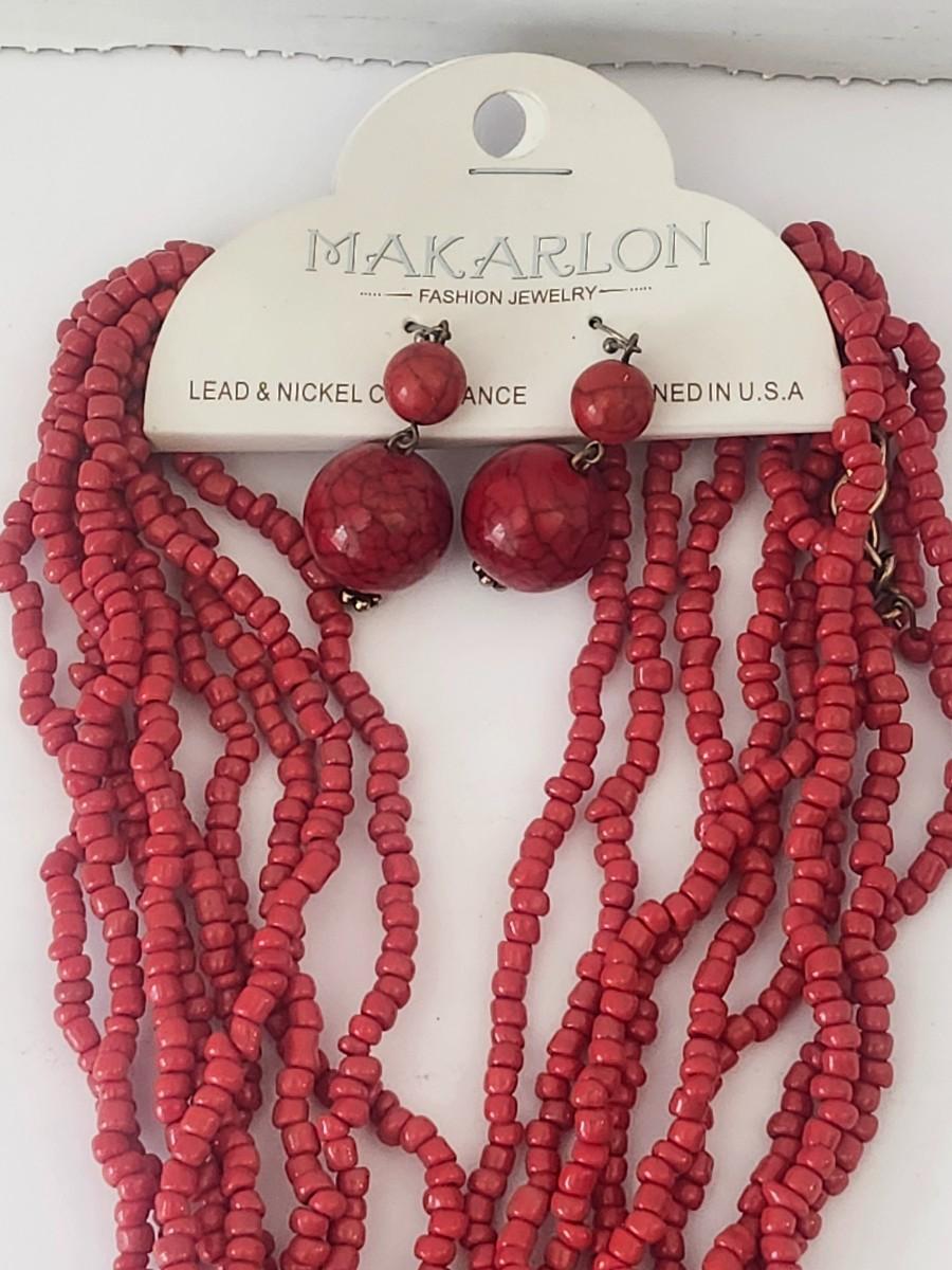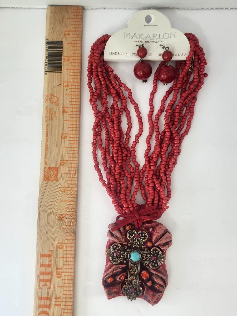 Striking Makarlon fashion jewelry set featuring a dramatic multi strand red beaded necklace paired with matching drop earrings. The necklace showcases layered strands of small red beads gathered at a sculptural pendant with an ornate cross design, accented by turquoise color and warm amber tone details for rich contrast. Earrings feature coordinating red bead drops that echo the necklace’s texture and color palette. Finished with original Makarlon card noting lead and nickel compliance and Made in USA labeling. A vibrant, statement making set with strong visual impact and a bold, artistic presence.