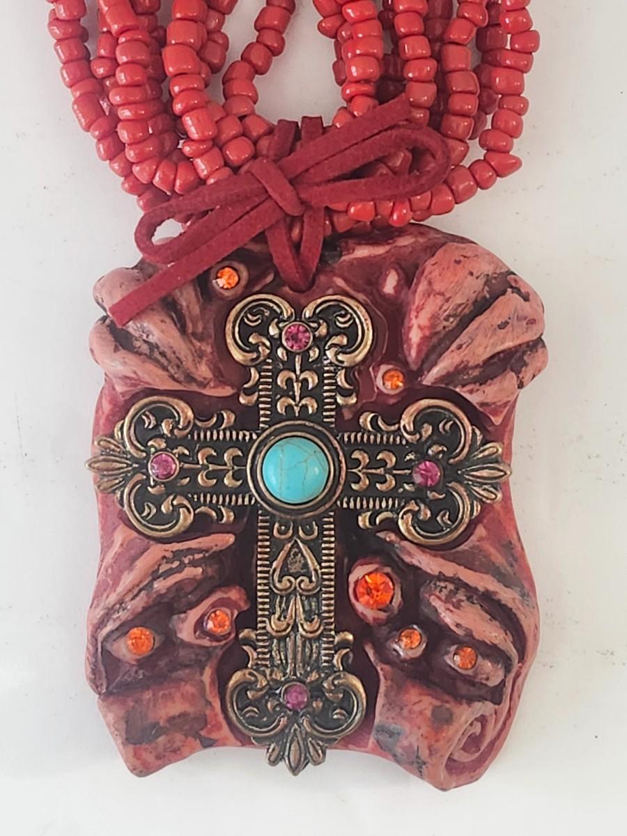 Makarlon Bold Red Multi Strand Beaded Necklace With Ornate Cross Pendant and Matching Earrings