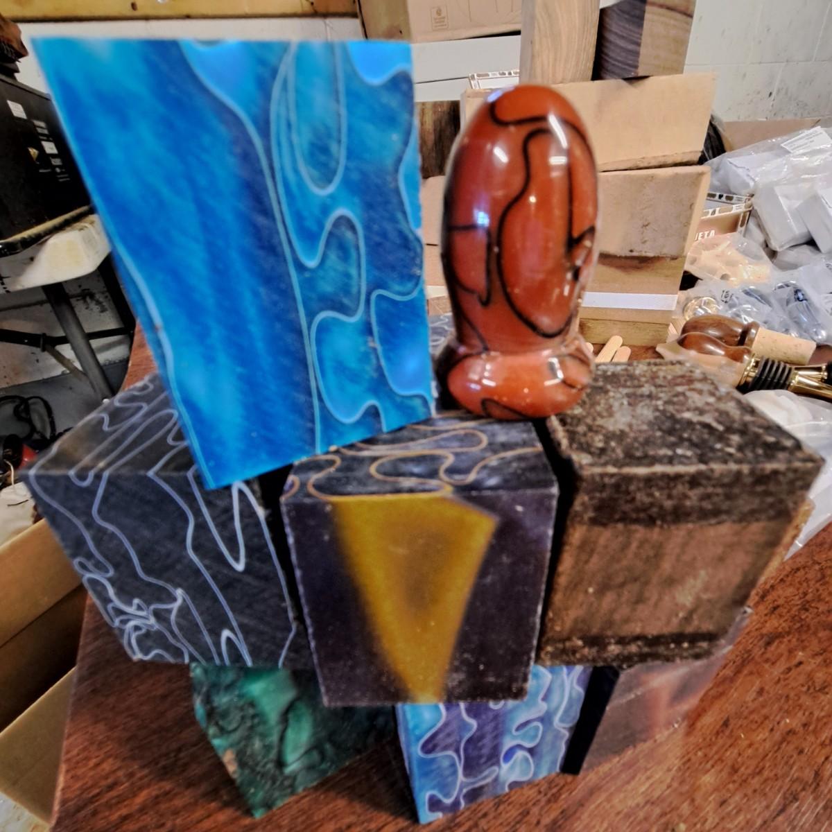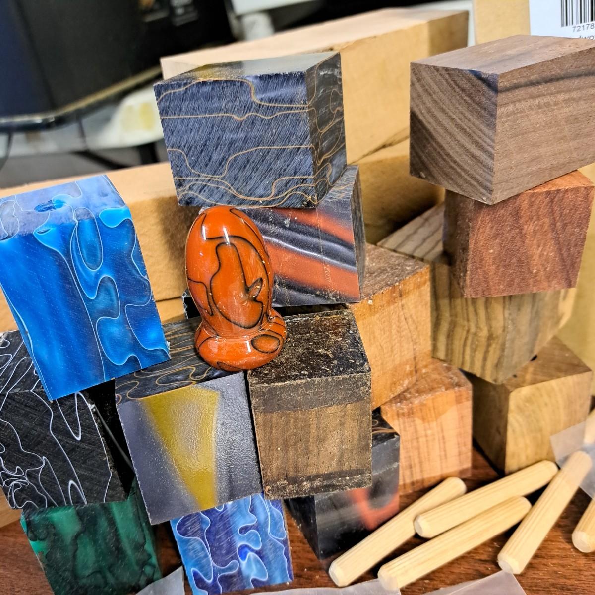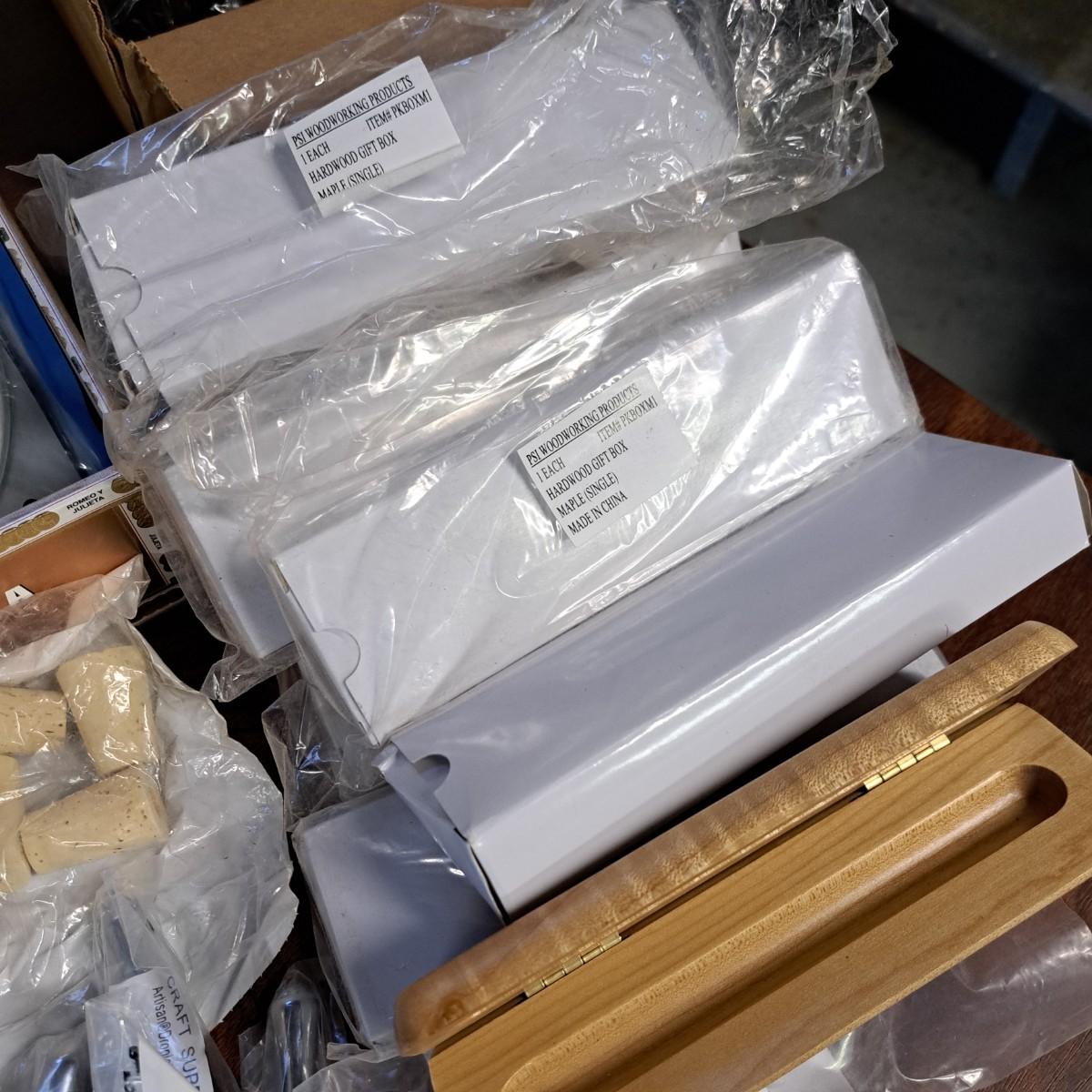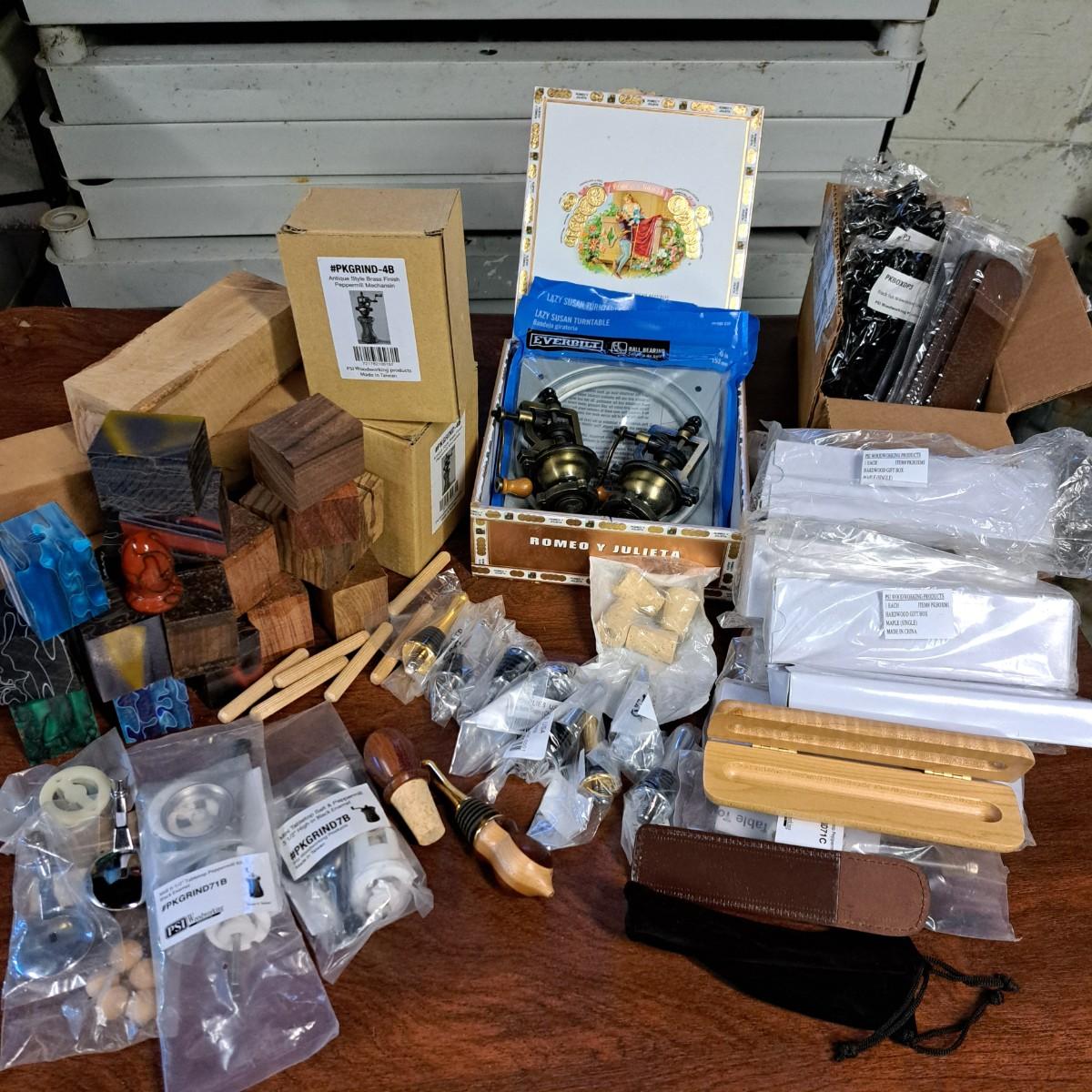 And more ... to create nifty items with this cool crafters lot. Lot includes a variety of materials (*no tools) to get you started making a number of hand-crafted items: salt and pepper mills, 12 laminated corian and wood cubes for making bottle stoppers including at least eight cast metal stoppers, leather pouches, felt pen cases, 10 maple wood pen cases and two lazy Susan turntables to start your own hand-crafted projects! Local pickup only.