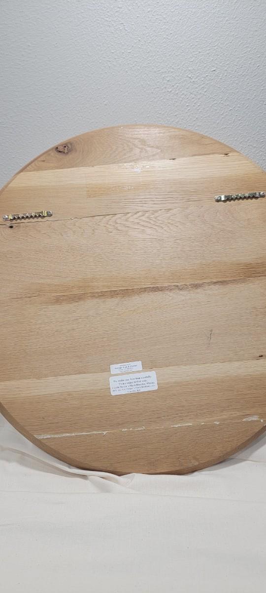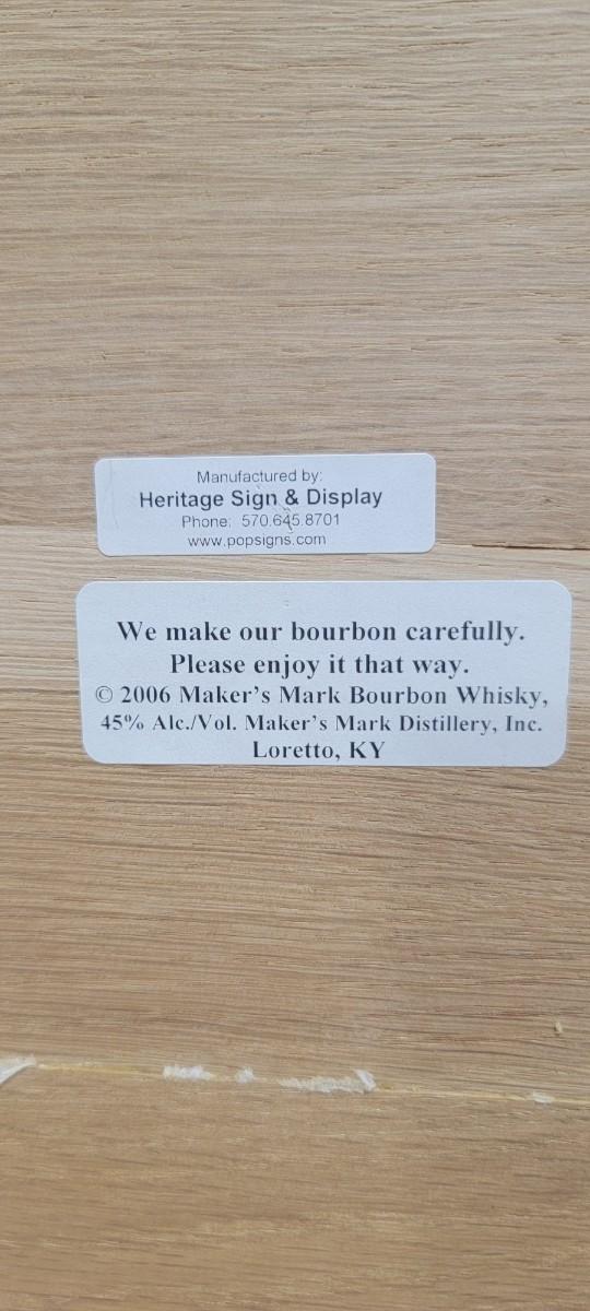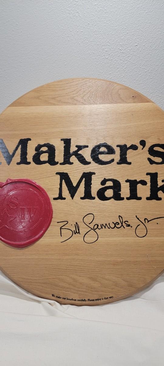 21" D Member's Mark Bourbon whiskey barrel head sign with red Sealand Bill Samuel's Jr signature. 2006 Manufacturer Heritage Sign & Display