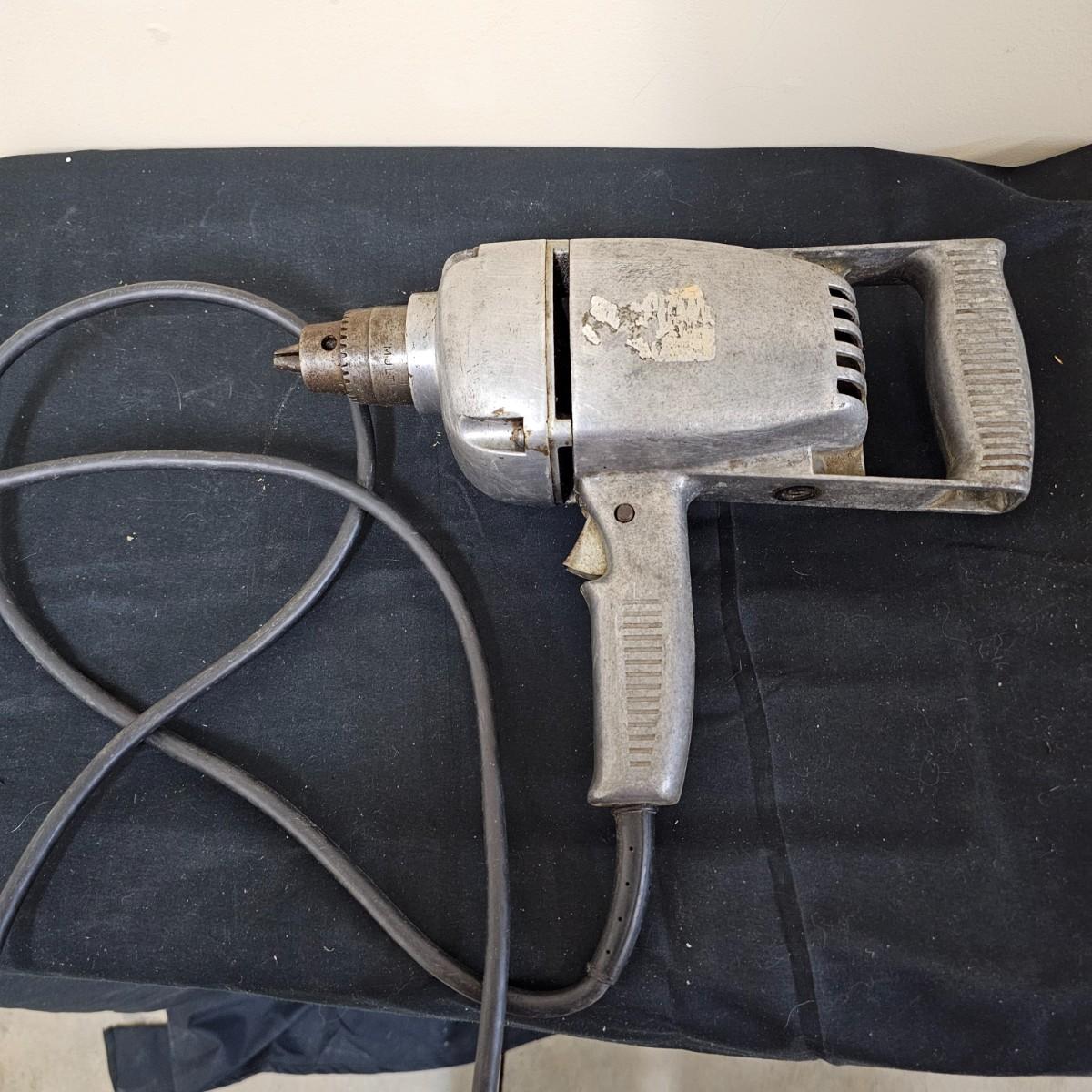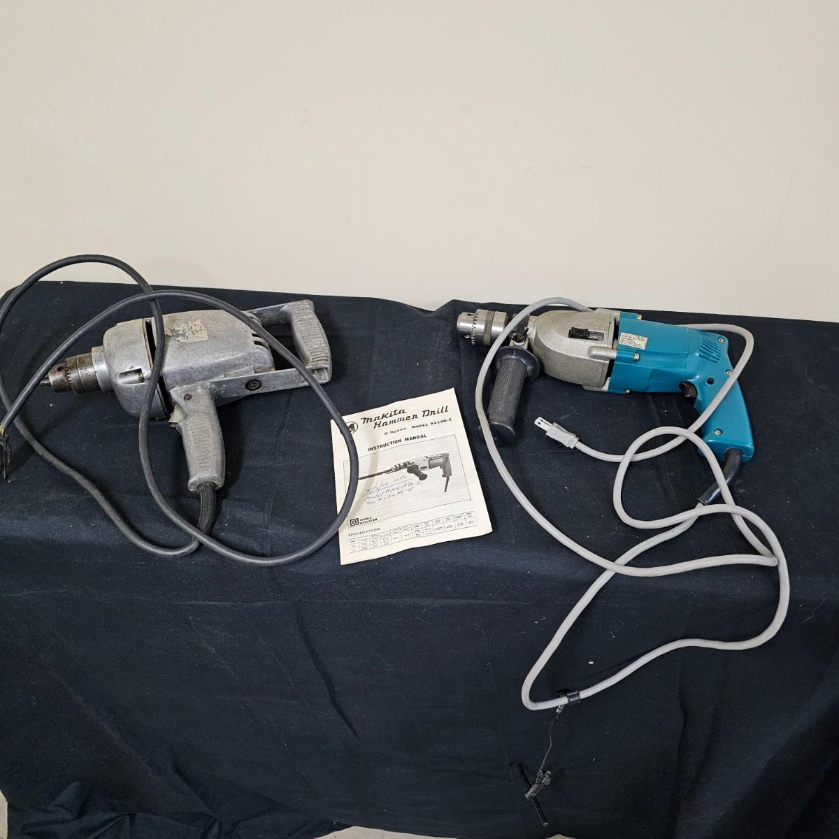 Older Makita hammer drill with two speed power, manual and chuck key. Measures 14" x 3" x 8"H. Does not have depth gauge bar. Other item is a metal body 1/2" heavy duty drill. Measures 13" x 4" x 9.5"H. Does not have chuck key but can use the Makita key. See photos for details. Local pickup only.