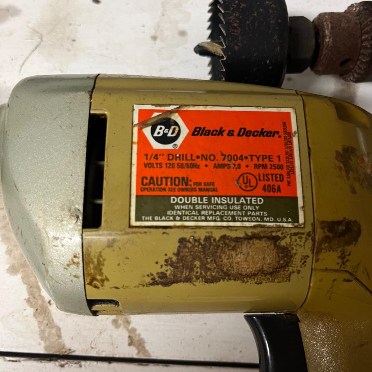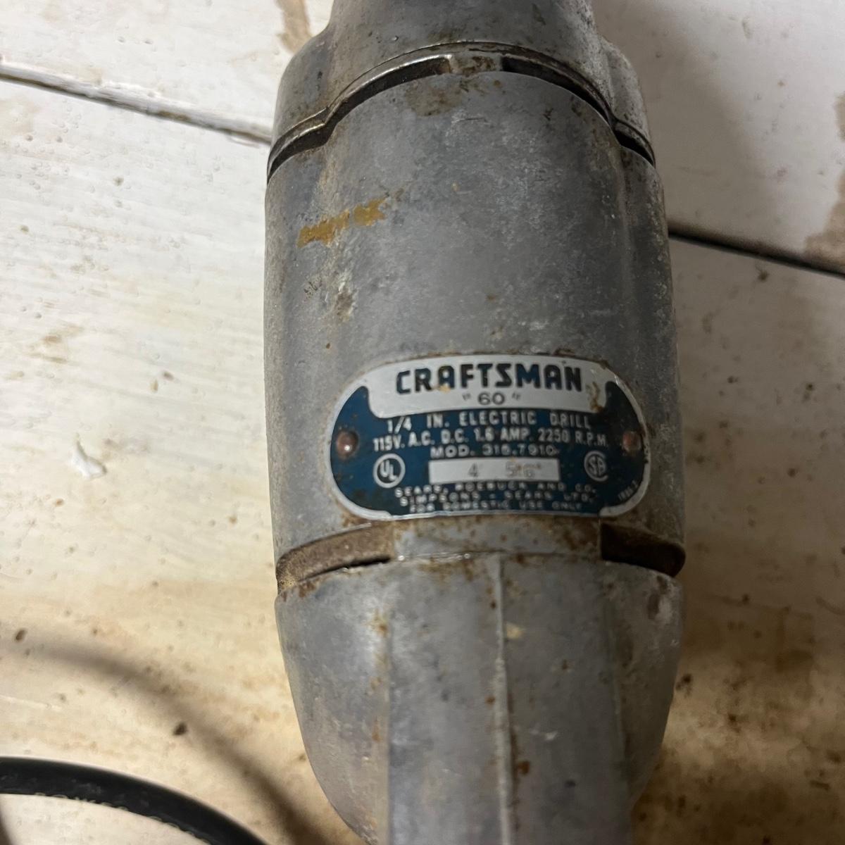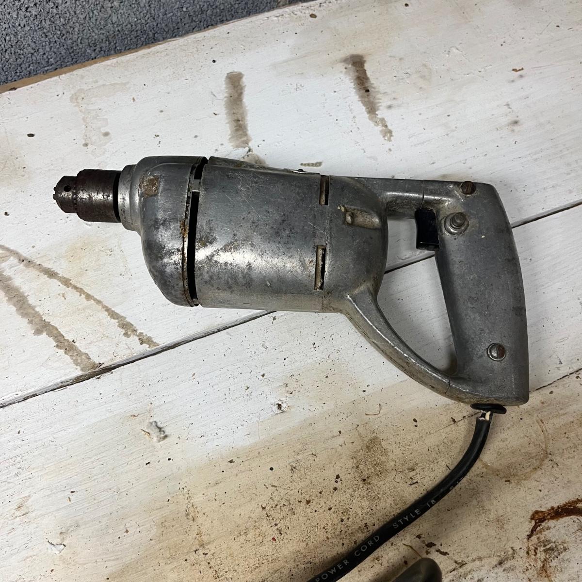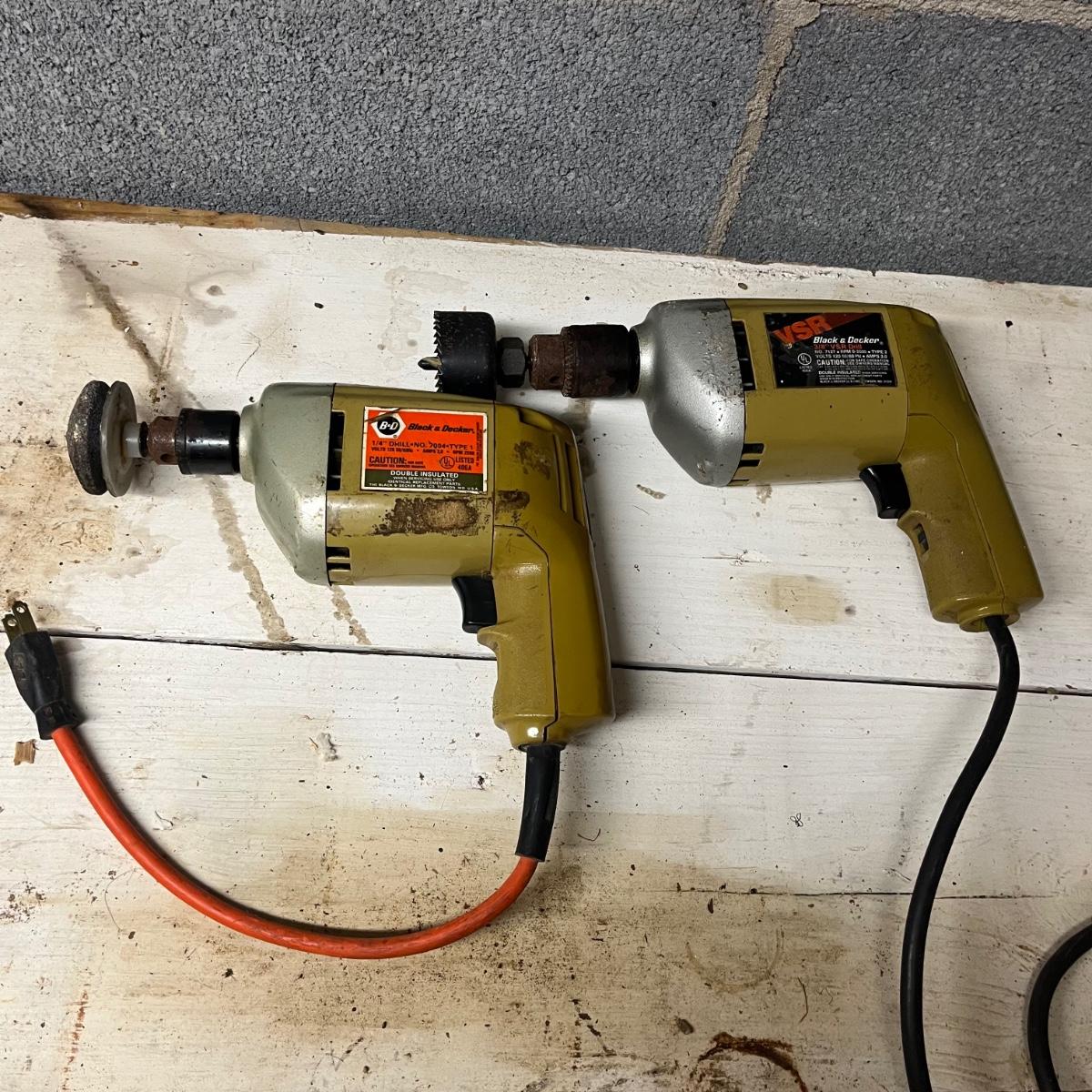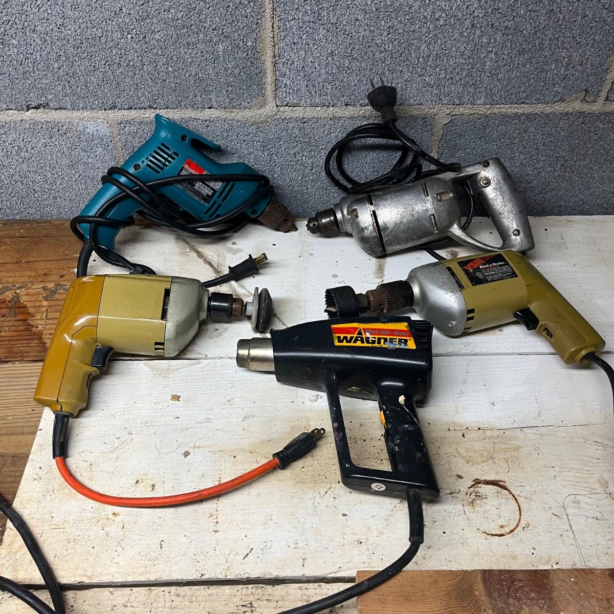 Lot includes a Black and Decker 1/4” and 3/8” drill, Makita 3/8” drill and a Sears Craftsman 1/4” drill. Also includes Wagner heat gun. All drills and heat gun powered on when tested.