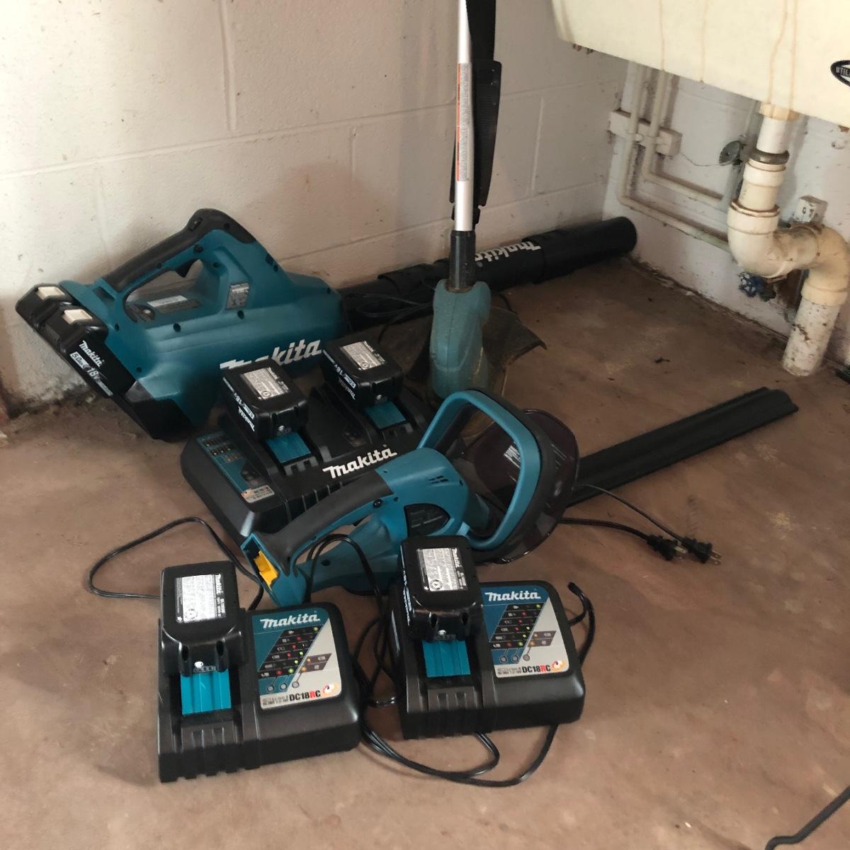 Lot includes Makita blower model # XBU02 with dual battery charger, Makita cordless hedge trimmer XHU02 with charger and a Makita cordless string trimmer model# XRU02 with charger. All machines and chargers worked when tested. There is a total of six 18V batteries.