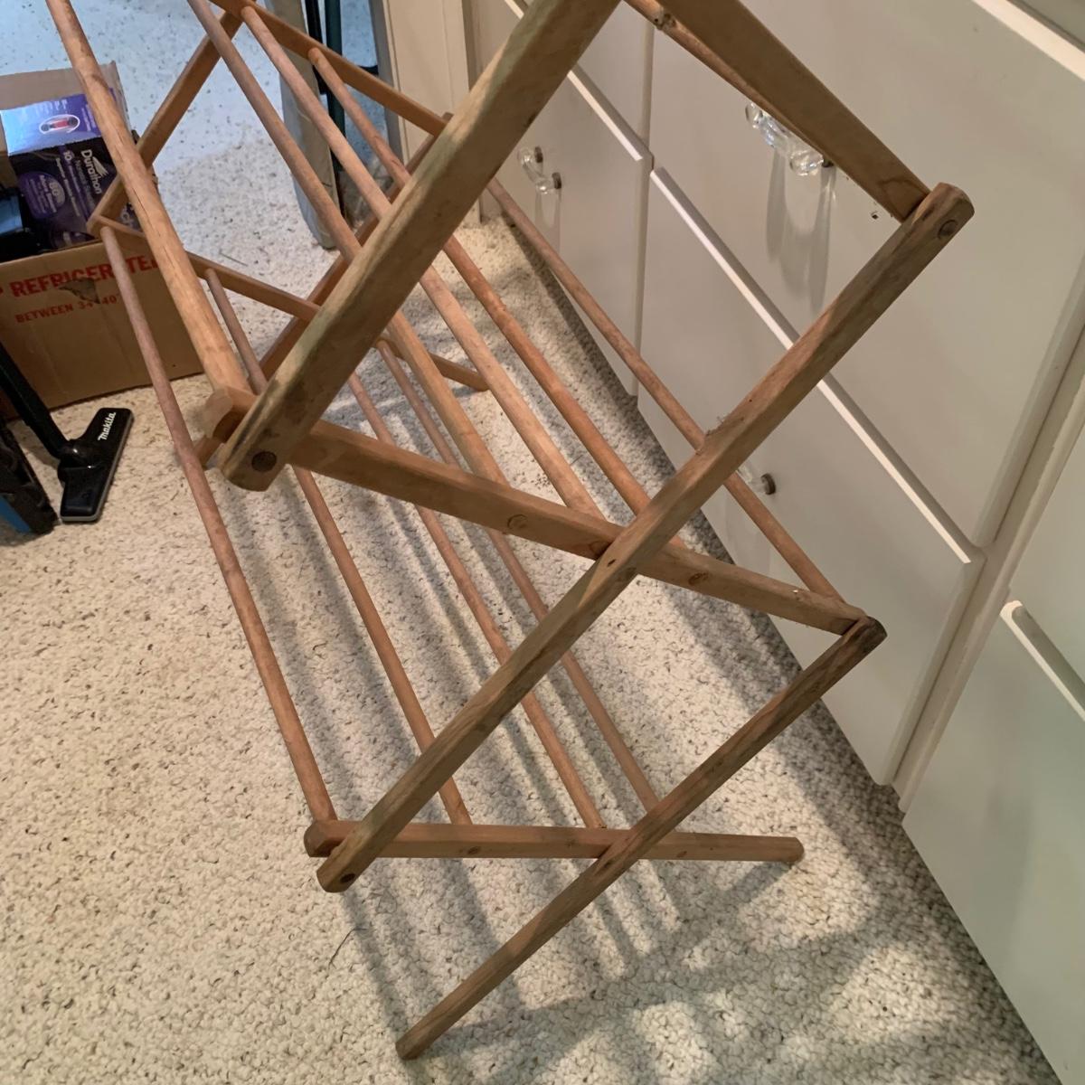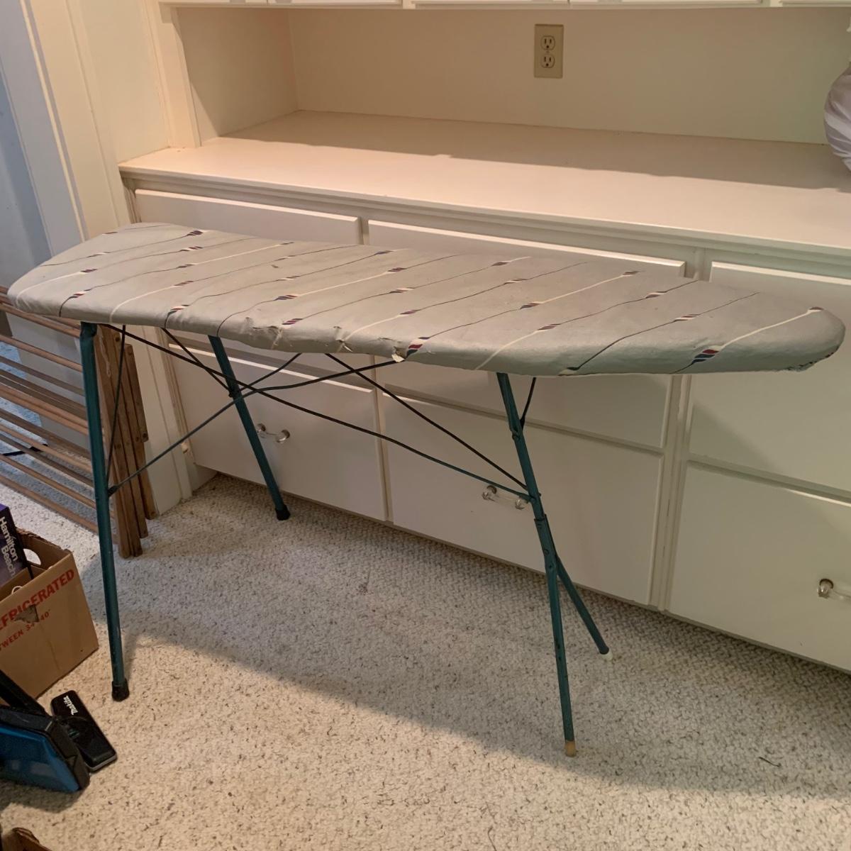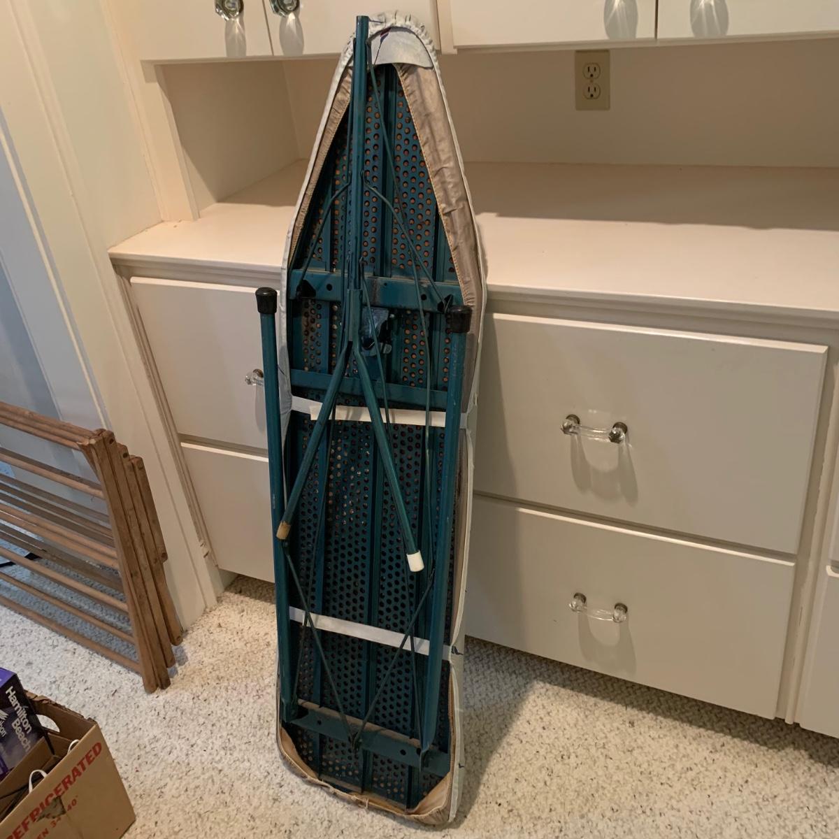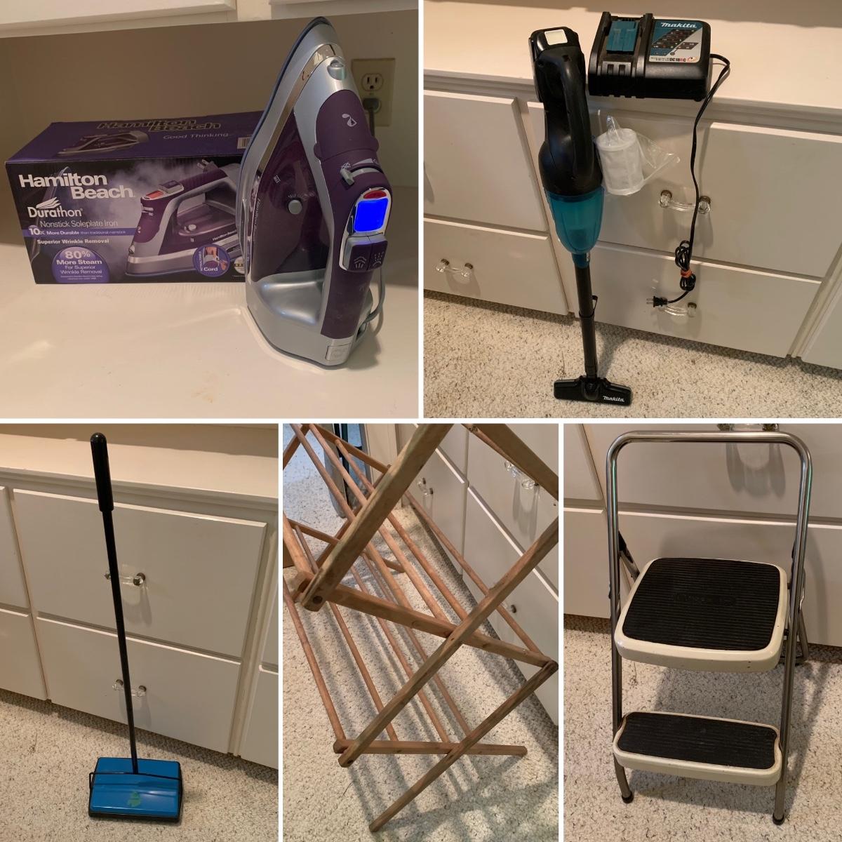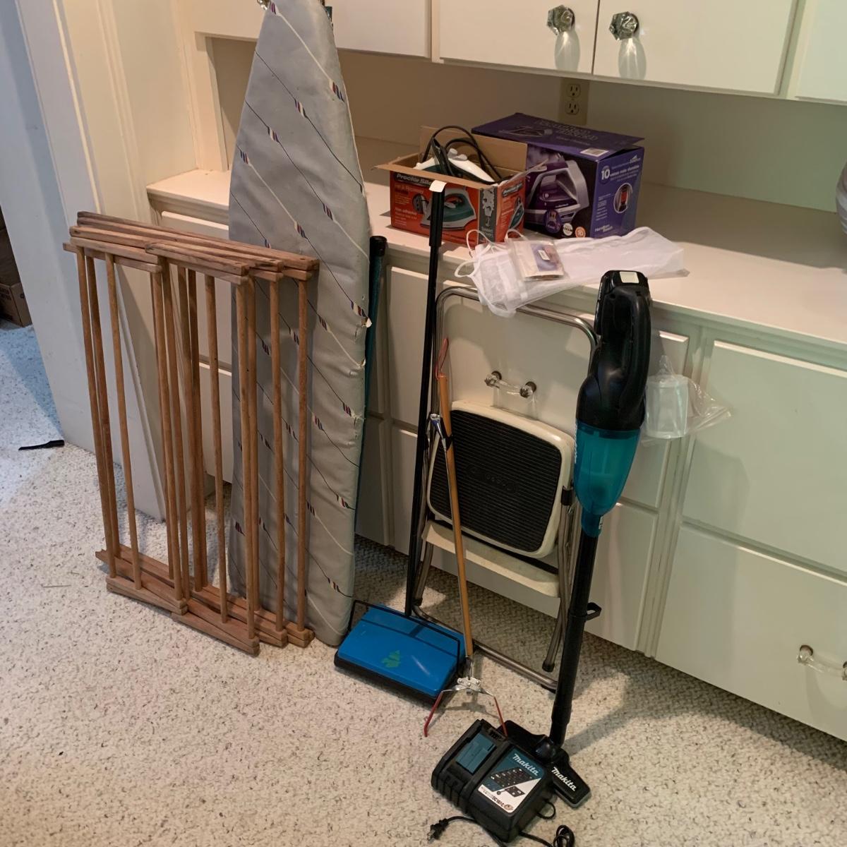 A variety of laundry and household supplies. Included in this lot are: a Makita cordless vacuum with charger, two irons, a Cosco step stool, a grabber, Bissell Sweep Up, metal-base ironing board, wooden drying rack, sweater comb, and mesh bag. All electronic items powered on when plugged in. When set up, the drying rack measures approximately 35.5” x 16” x 52”H. The padding on the ironing board is a bit worn and will need replacing.