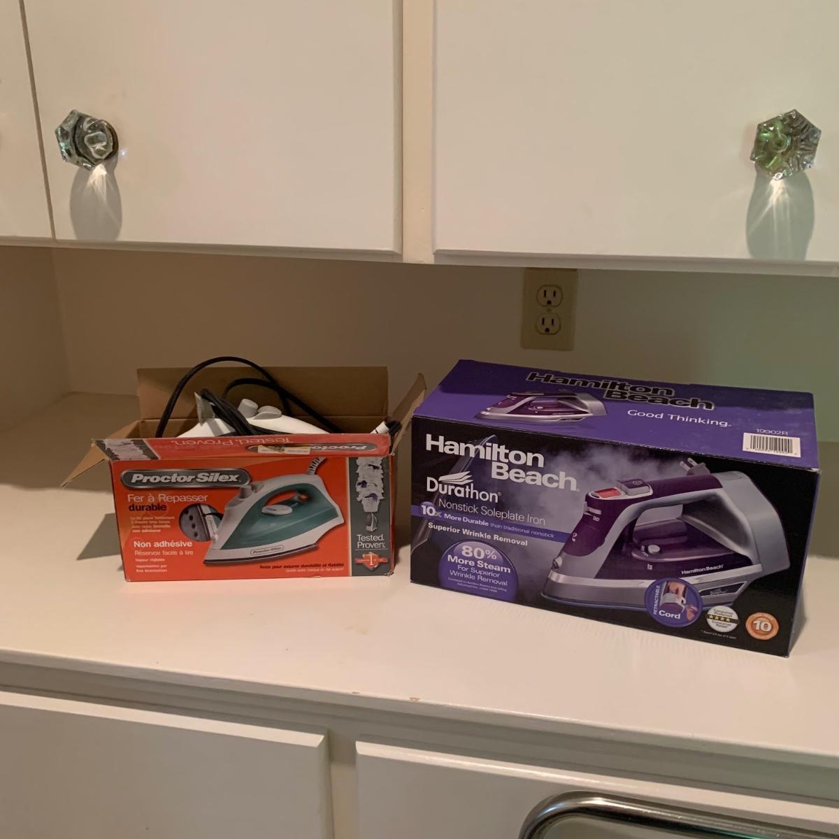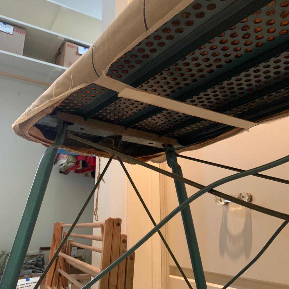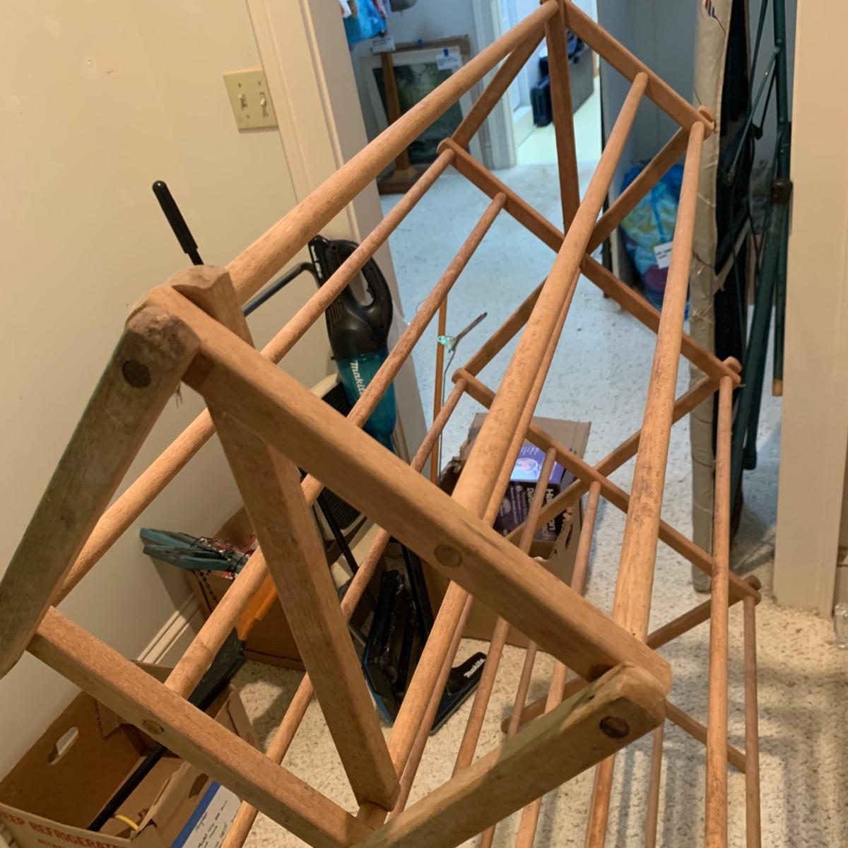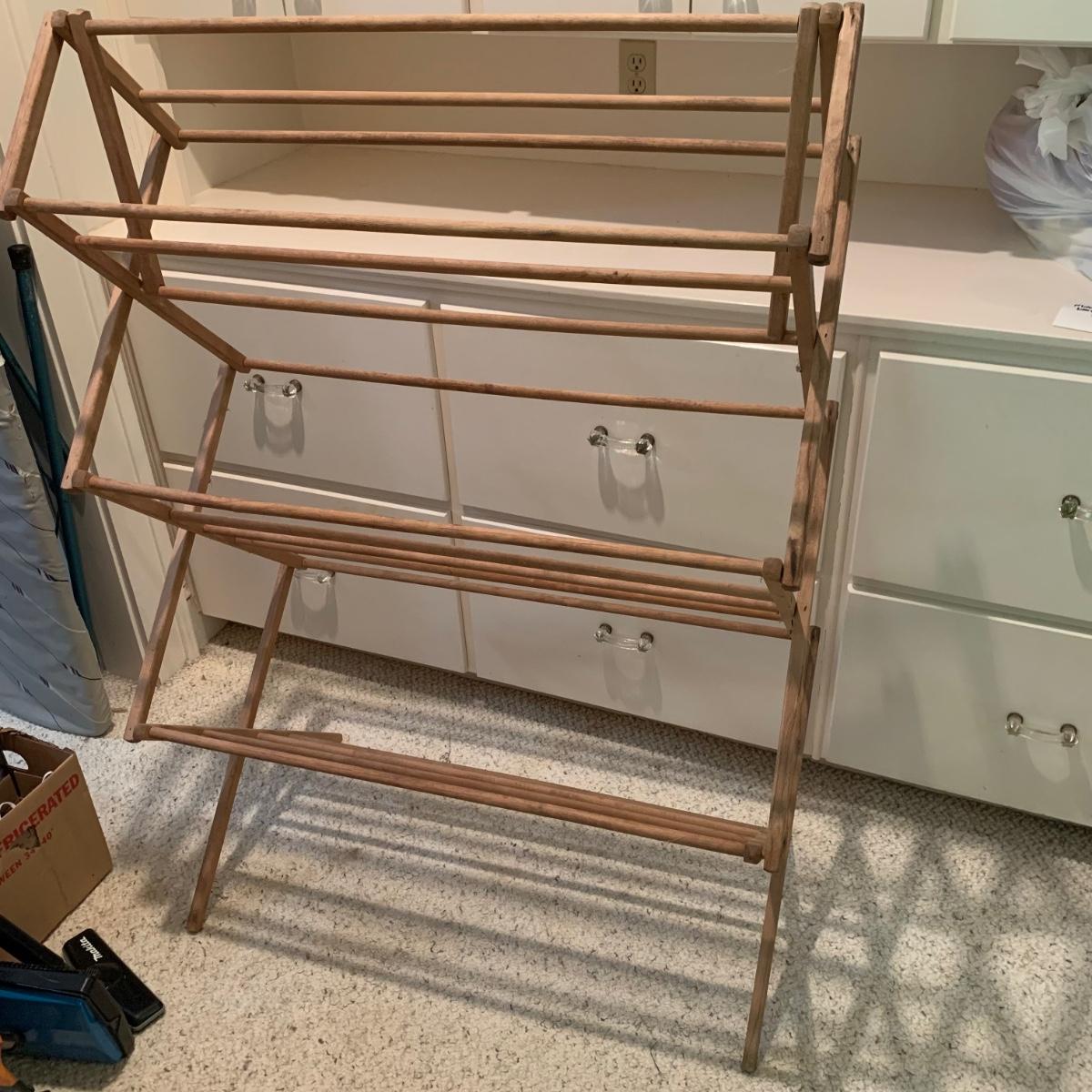 A variety of laundry and household supplies. Included in this lot are: a Makita cordless vacuum with charger, two irons, a Cosco step stool, a grabber, Bissell Sweep Up, metal-base ironing board, wooden drying rack, sweater comb, and mesh bag. All electronic items powered on when plugged in. When set up, the drying rack measures approximately 35.5” x 16” x 52”H. The padding on the ironing board is a bit worn and will need replacing.