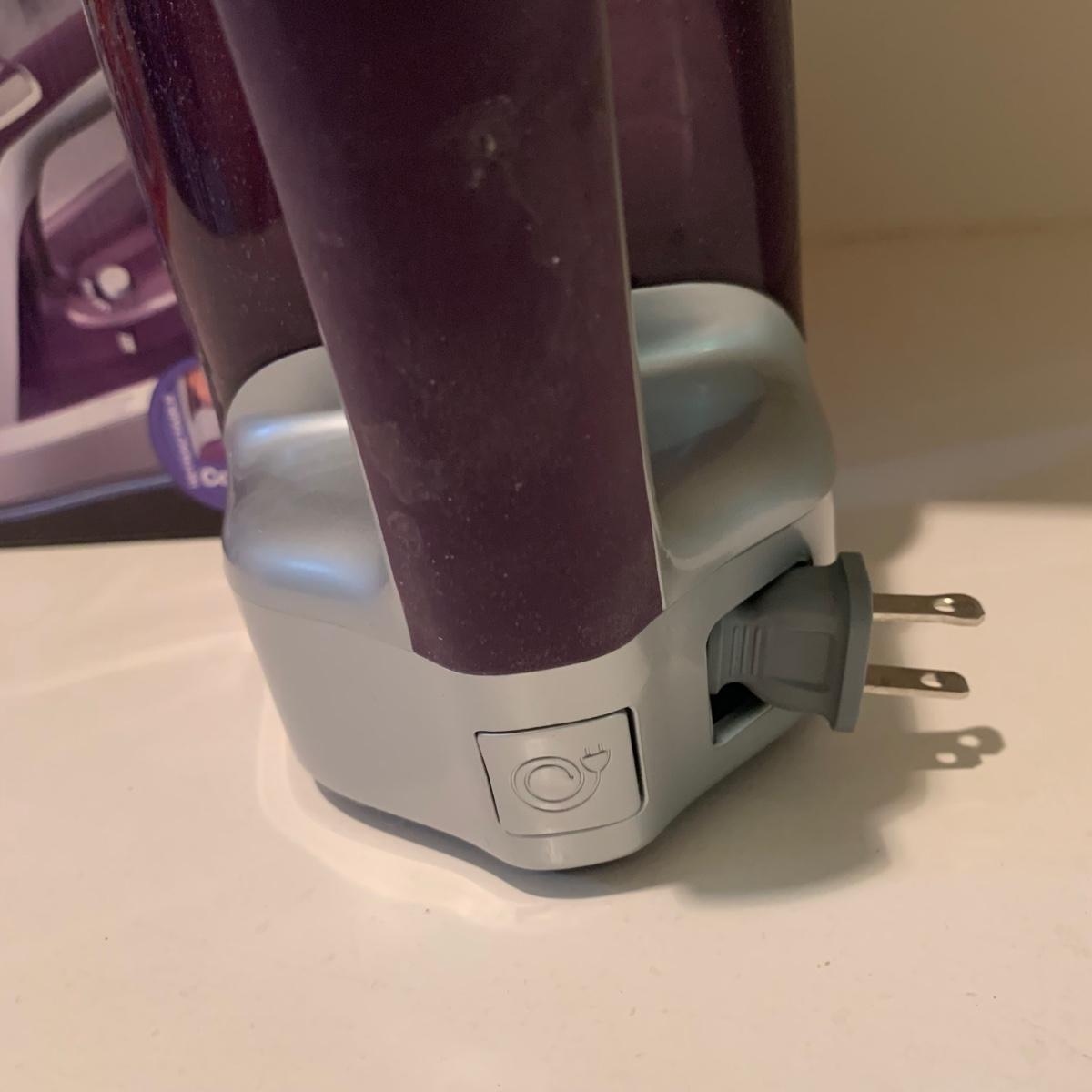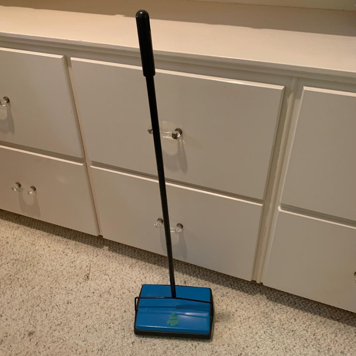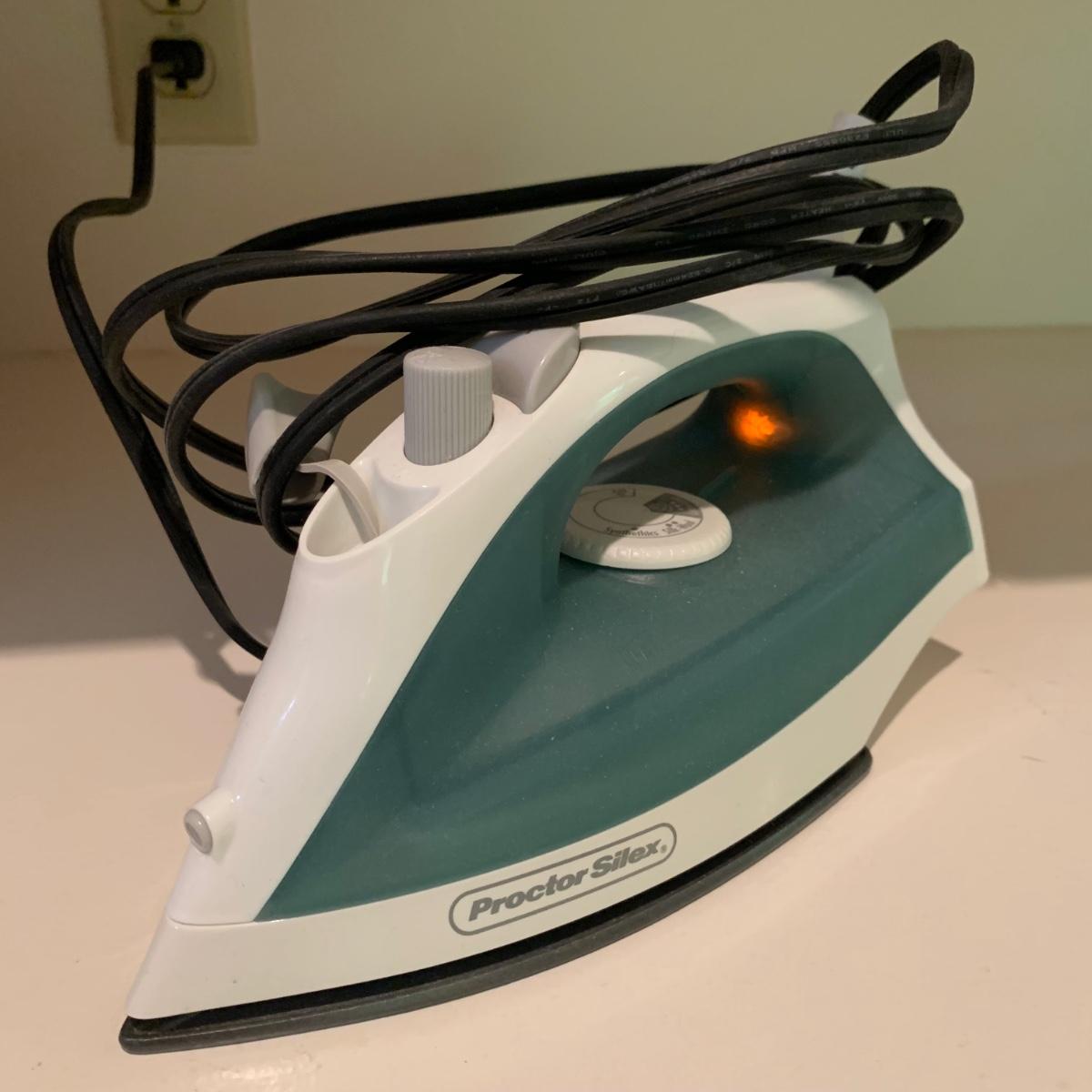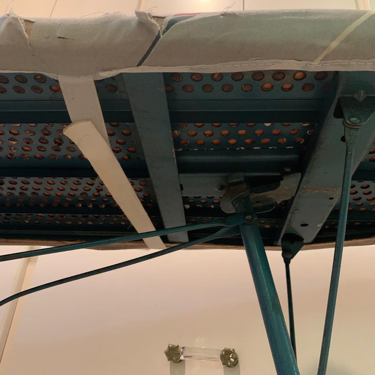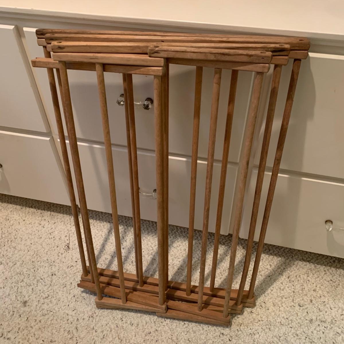 A variety of laundry and household supplies. Included in this lot are: a Makita cordless vacuum with charger, two irons, a Cosco step stool, a grabber, Bissell Sweep Up, metal-base ironing board, wooden drying rack, sweater comb, and mesh bag. All electronic items powered on when plugged in. When set up, the drying rack measures approximately 35.5” x 16” x 52”H. The padding on the ironing board is a bit worn and will need replacing.