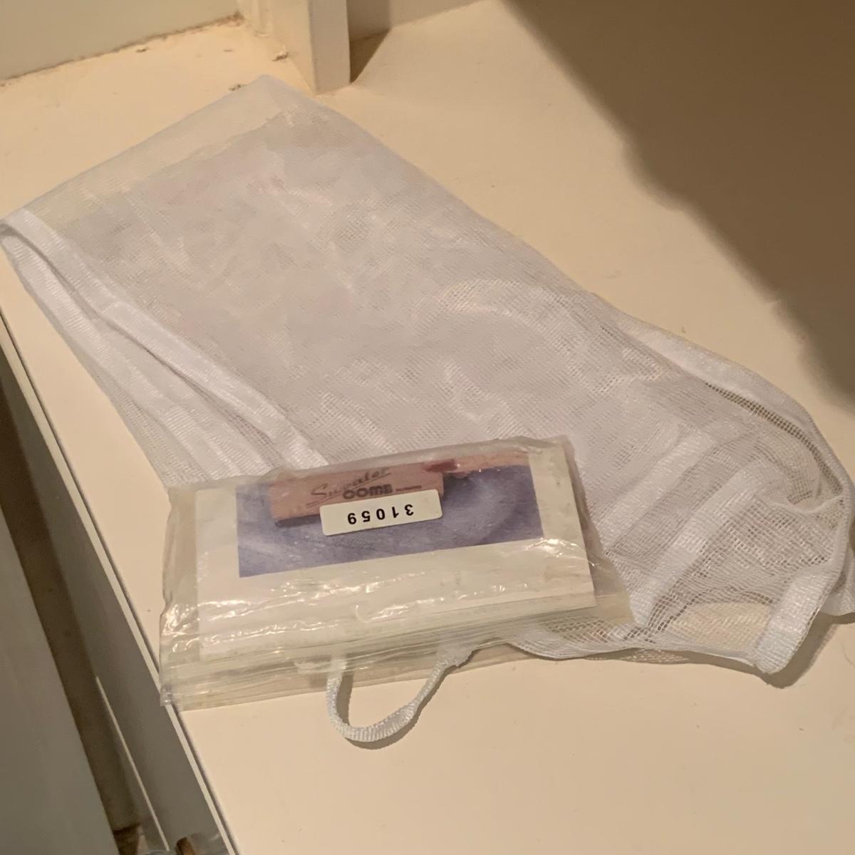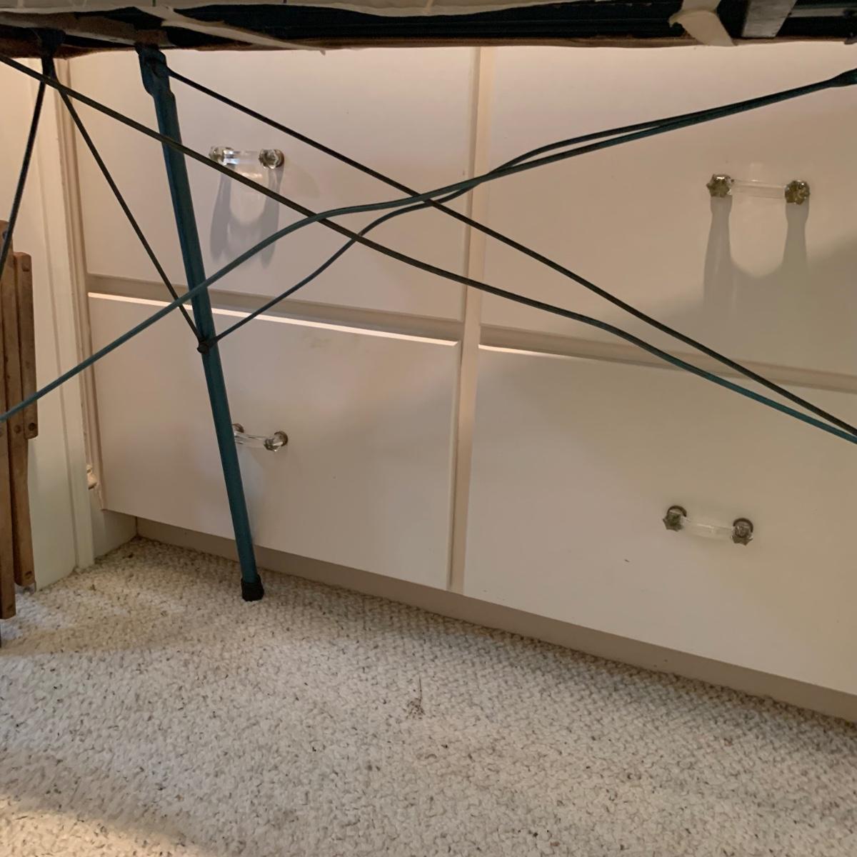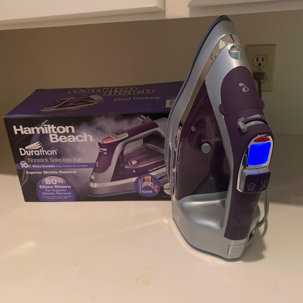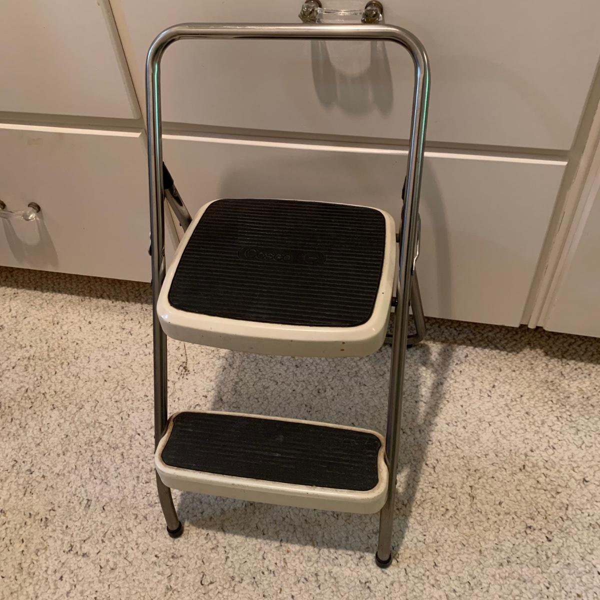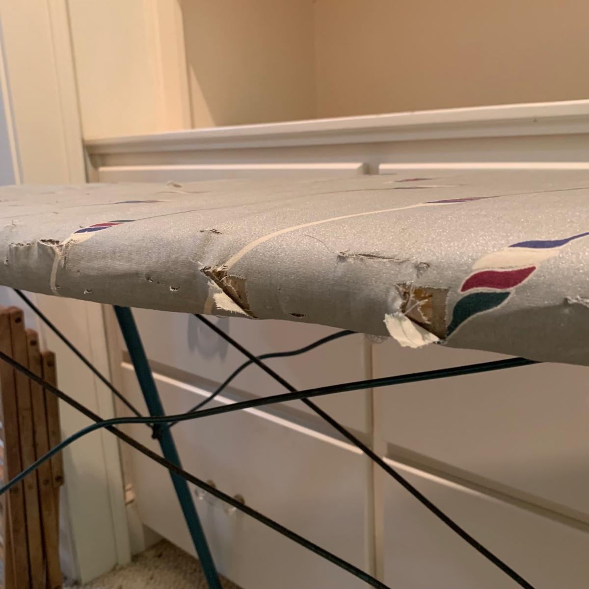 A variety of laundry and household supplies. Included in this lot are: a Makita cordless vacuum with charger, two irons, a Cosco step stool, a grabber, Bissell Sweep Up, metal-base ironing board, wooden drying rack, sweater comb, and mesh bag. All electronic items powered on when plugged in. When set up, the drying rack measures approximately 35.5” x 16” x 52”H. The padding on the ironing board is a bit worn and will need replacing.