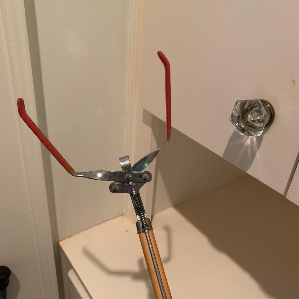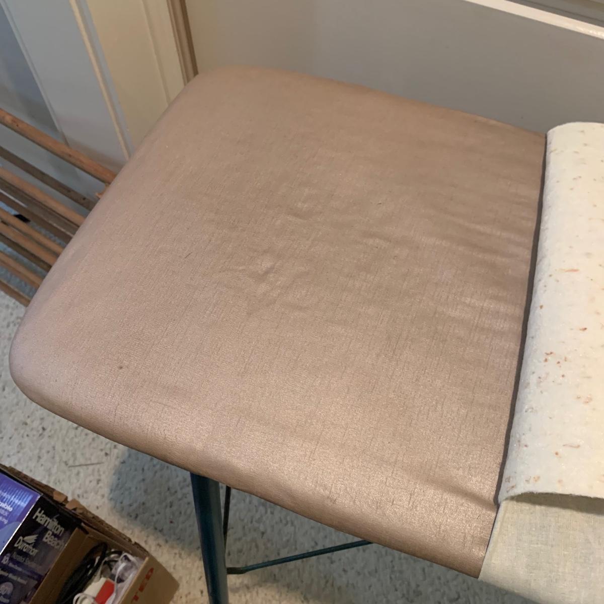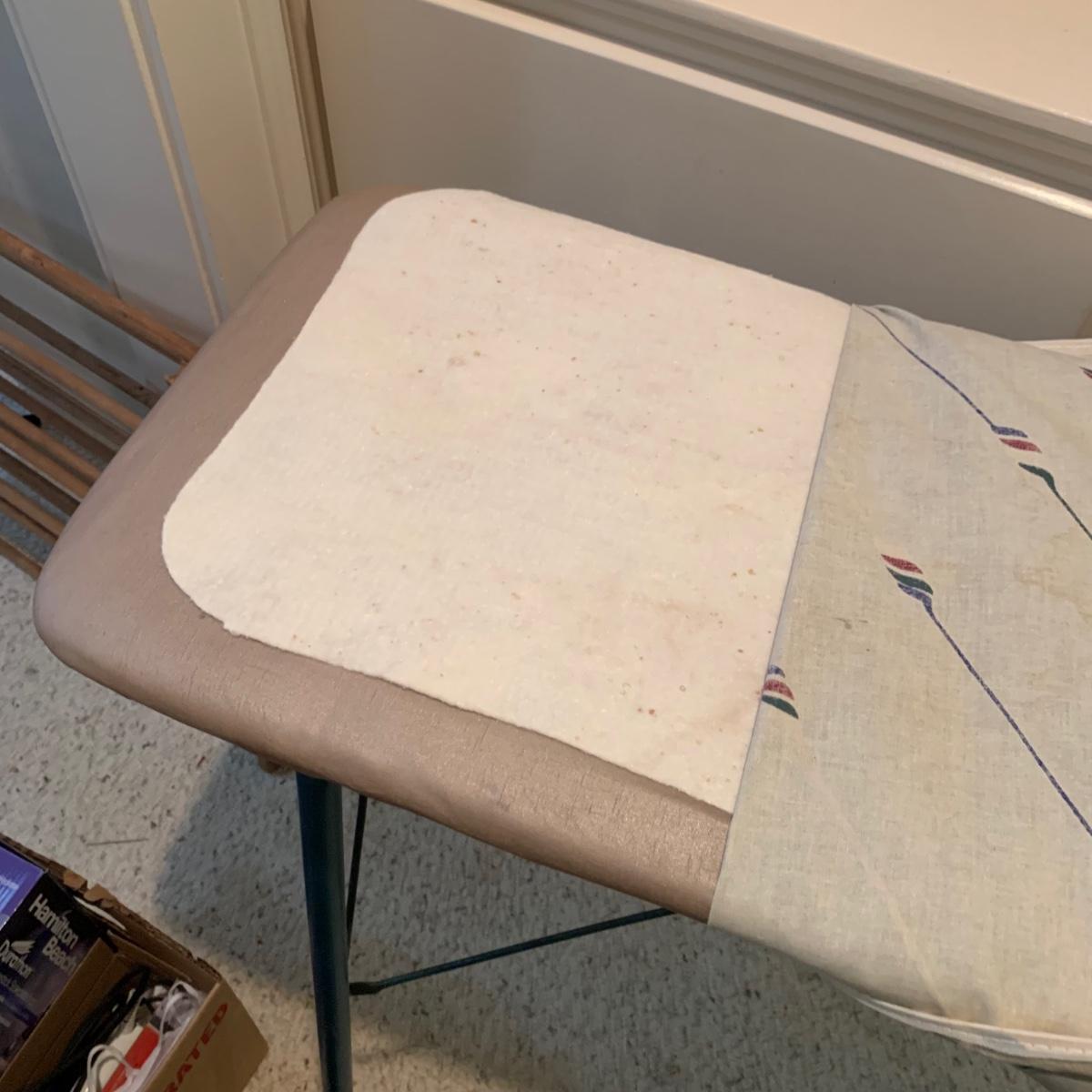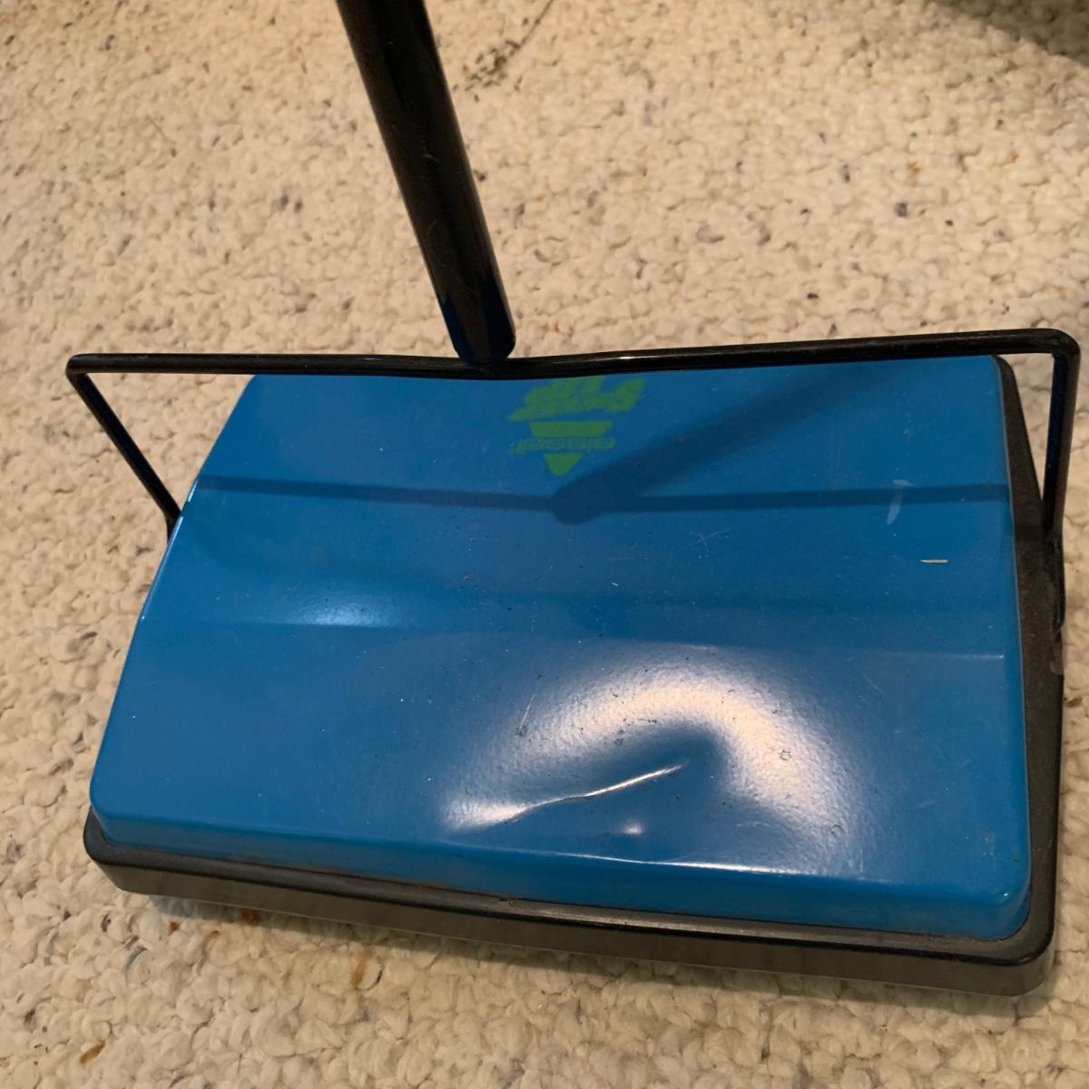 A variety of laundry and household supplies. Included in this lot are: a Makita cordless vacuum with charger, two irons, a Cosco step stool, a grabber, Bissell Sweep Up, metal-base ironing board, wooden drying rack, sweater comb, and mesh bag. All electronic items powered on when plugged in. When set up, the drying rack measures approximately 35.5” x 16” x 52”H. The padding on the ironing board is a bit worn and will need replacing.