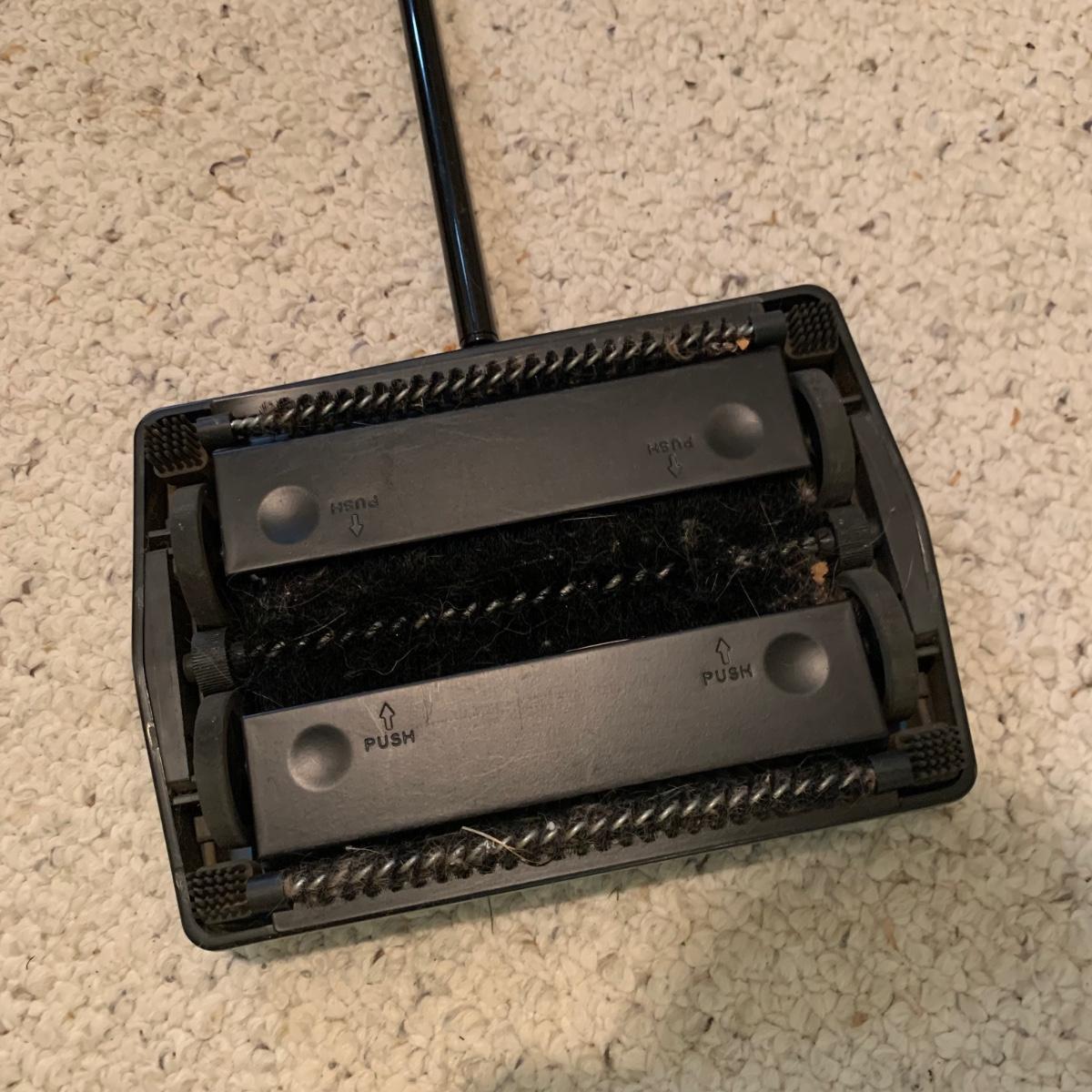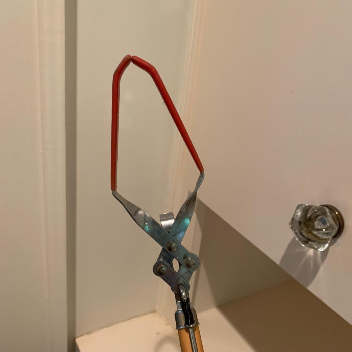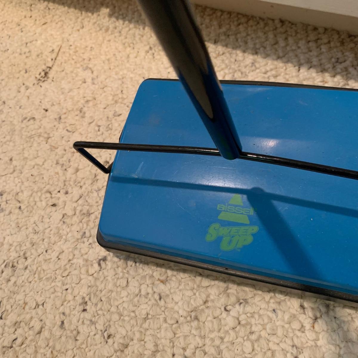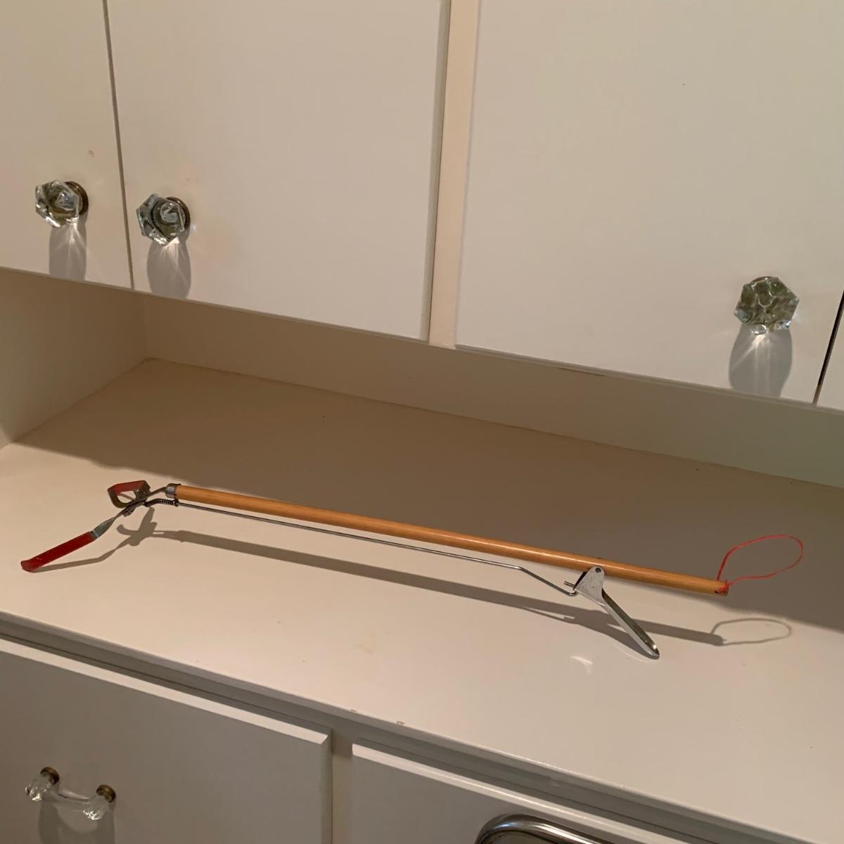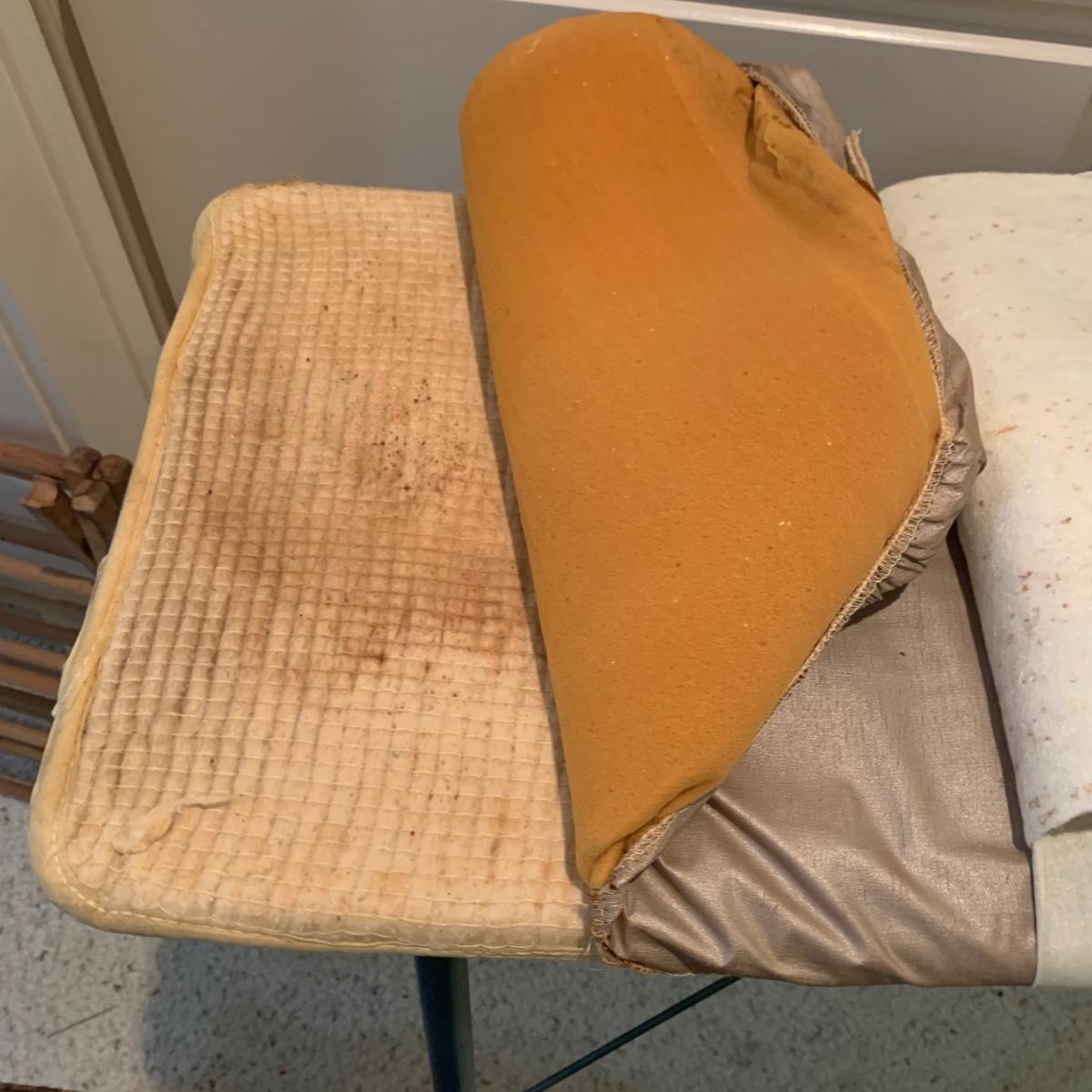 A variety of laundry and household supplies. Included in this lot are: a Makita cordless vacuum with charger, two irons, a Cosco step stool, a grabber, Bissell Sweep Up, metal-base ironing board, wooden drying rack, sweater comb, and mesh bag. All electronic items powered on when plugged in. When set up, the drying rack measures approximately 35.5” x 16” x 52”H. The padding on the ironing board is a bit worn and will need replacing.
