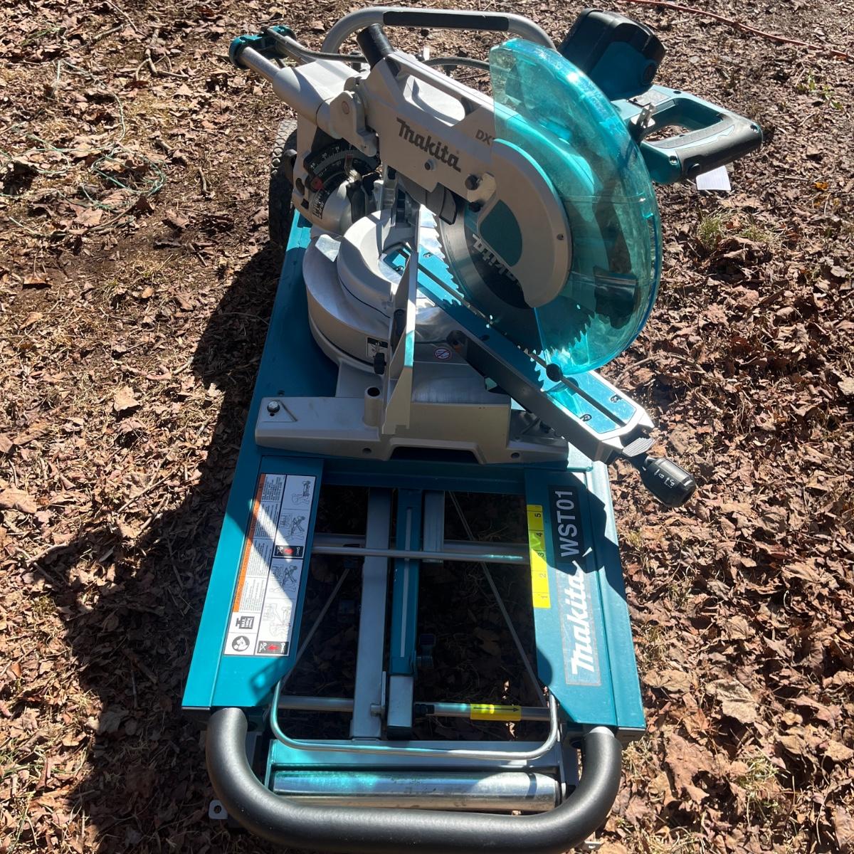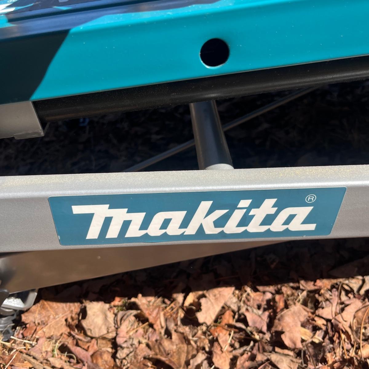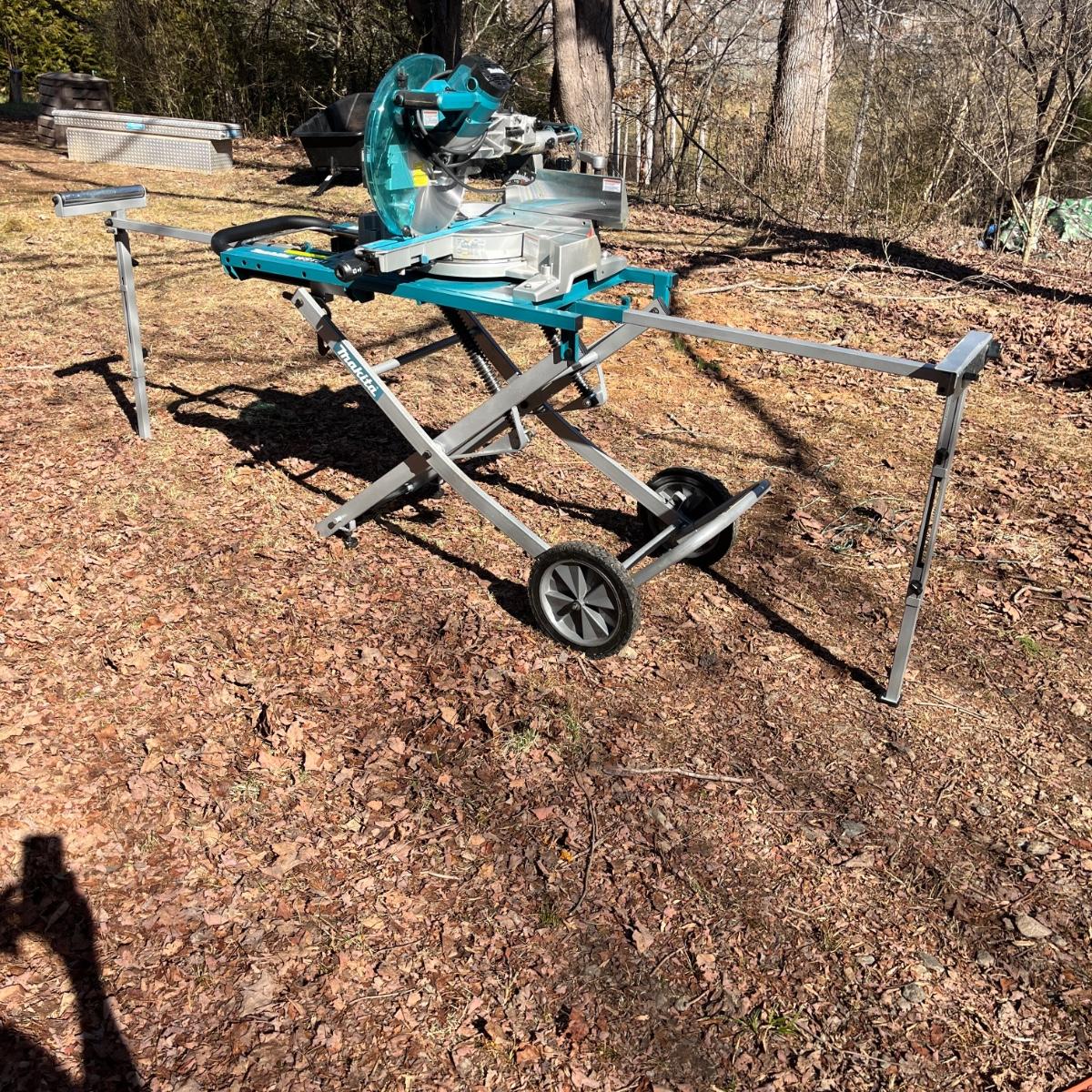 Lot includes a Makita 12” mitre saw with a portable fold down table. Saw powered on when plugged in. Table and saw measure 32” x 108” x 52”H when fully opened.