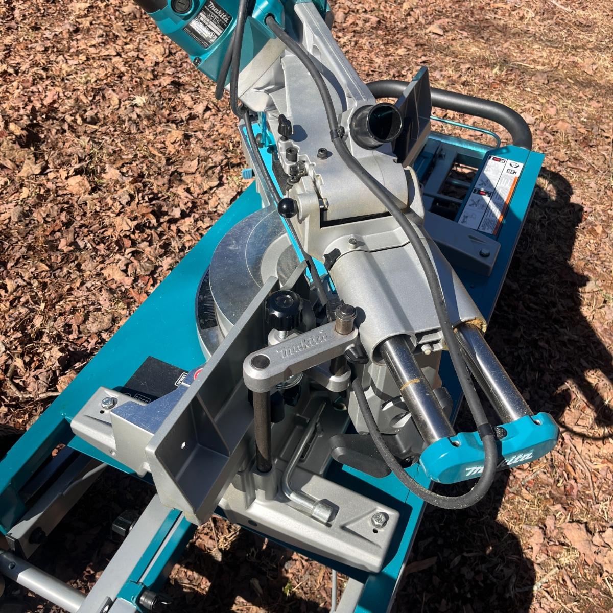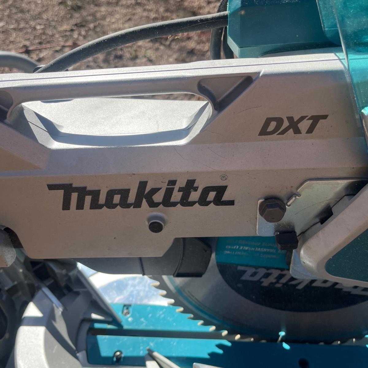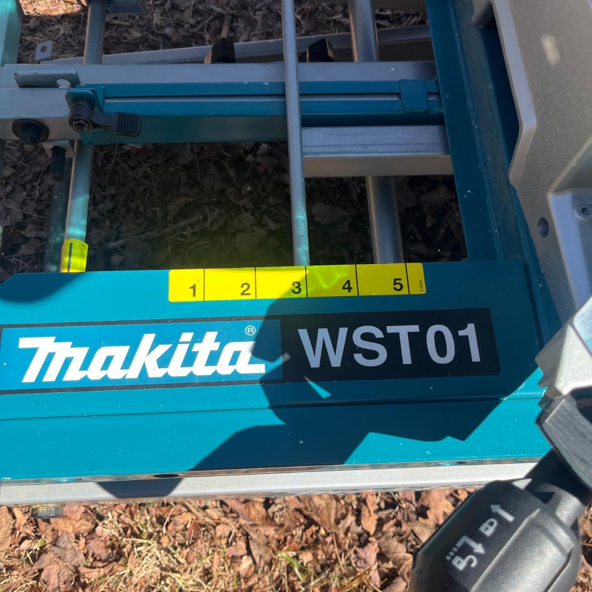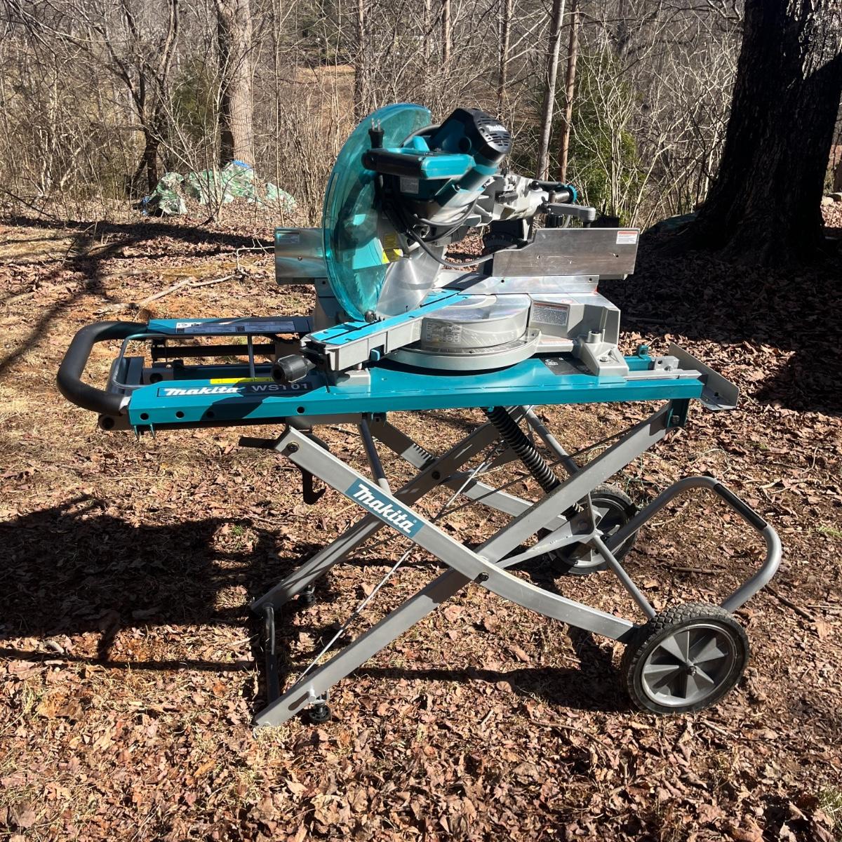 Lot includes a Makita 12” mitre saw with a portable fold down table. Saw powered on when plugged in. Table and saw measure 32” x 108” x 52”H when fully opened.