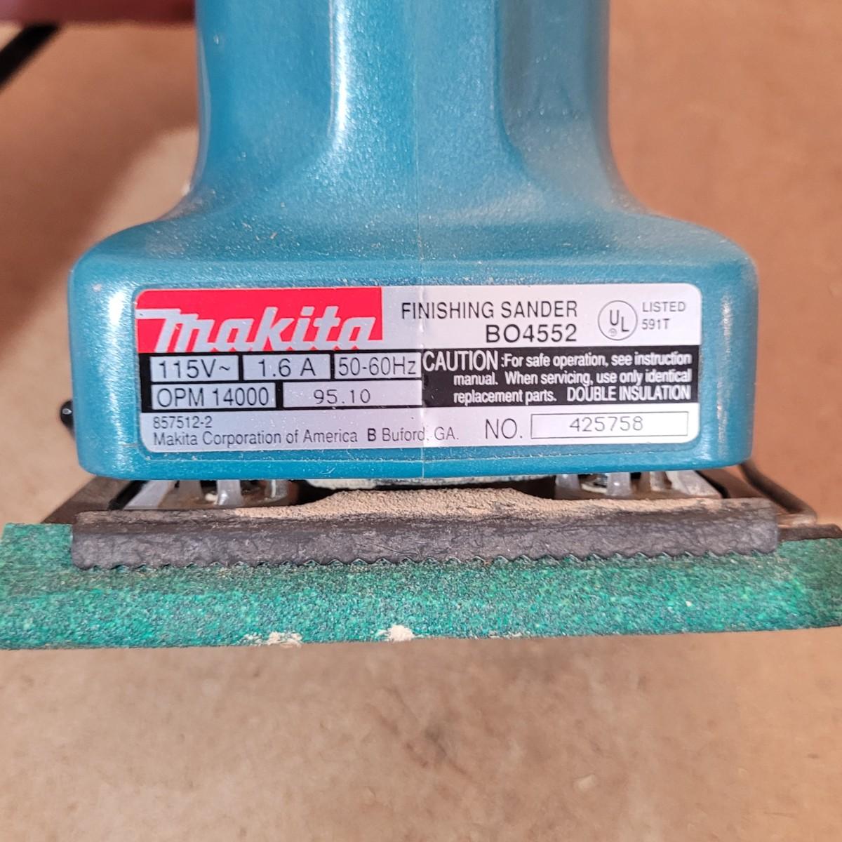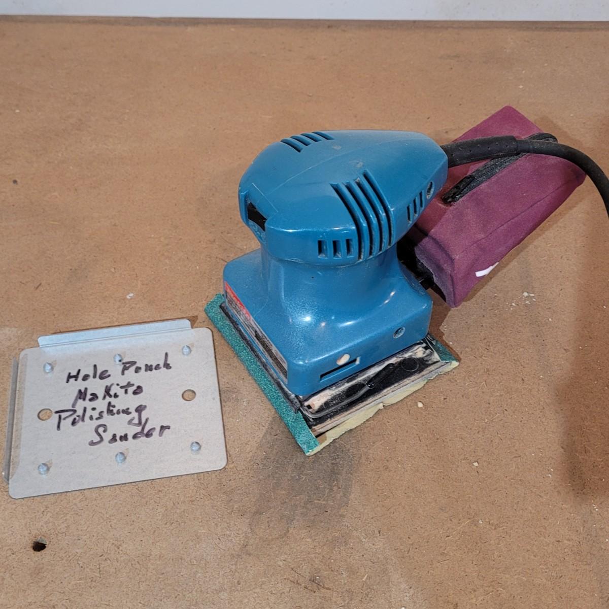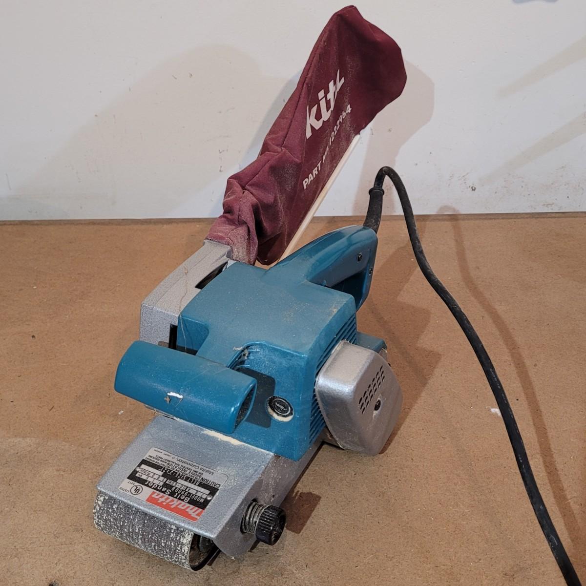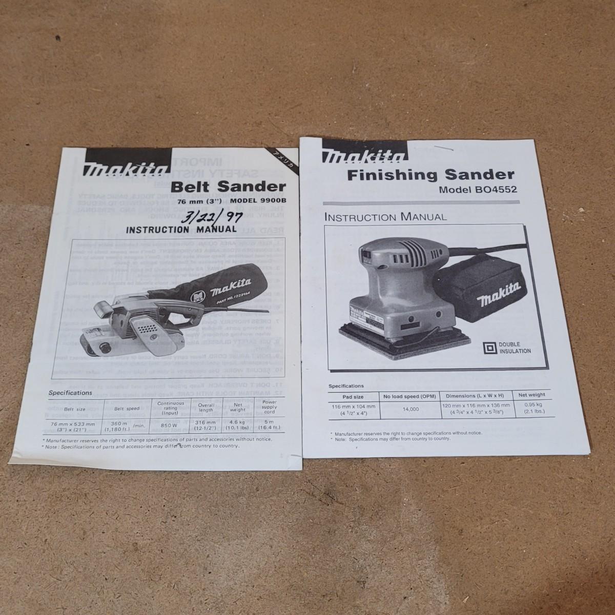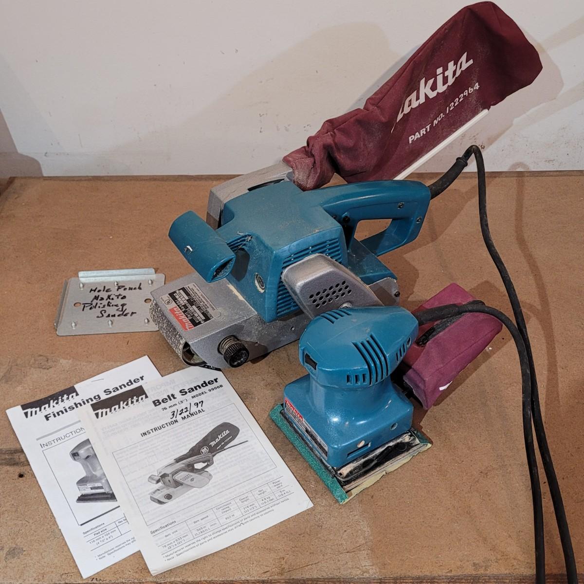 Two Makita sanders. The larger of the two is a 3" wide corded belt sander. The smaller is a corded finishing sander. Both powered on when plugged in. Also included is a hole punch for the finishing sander. Belt sander with bag measures 22" x 7" x 9"H. Both manuals are included.