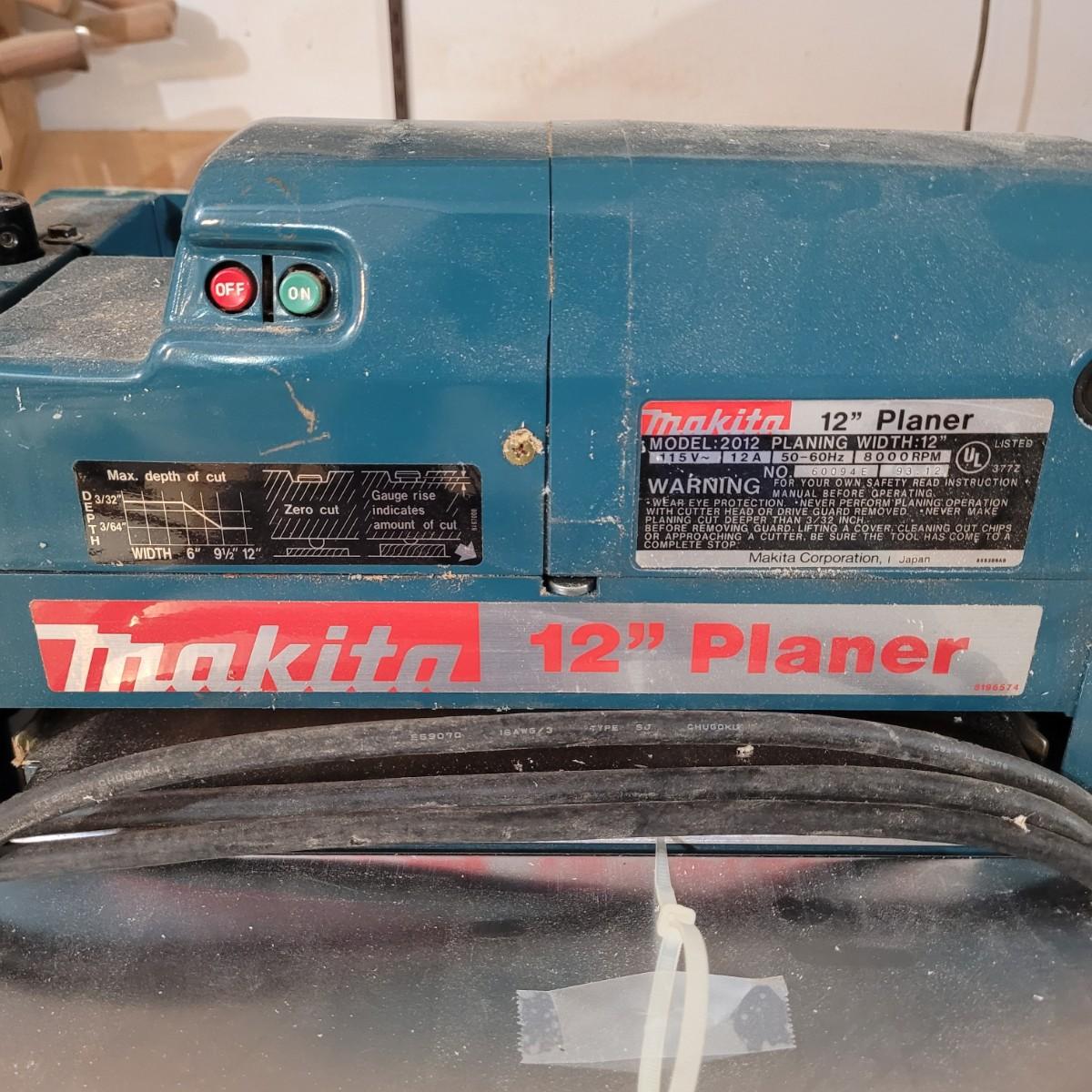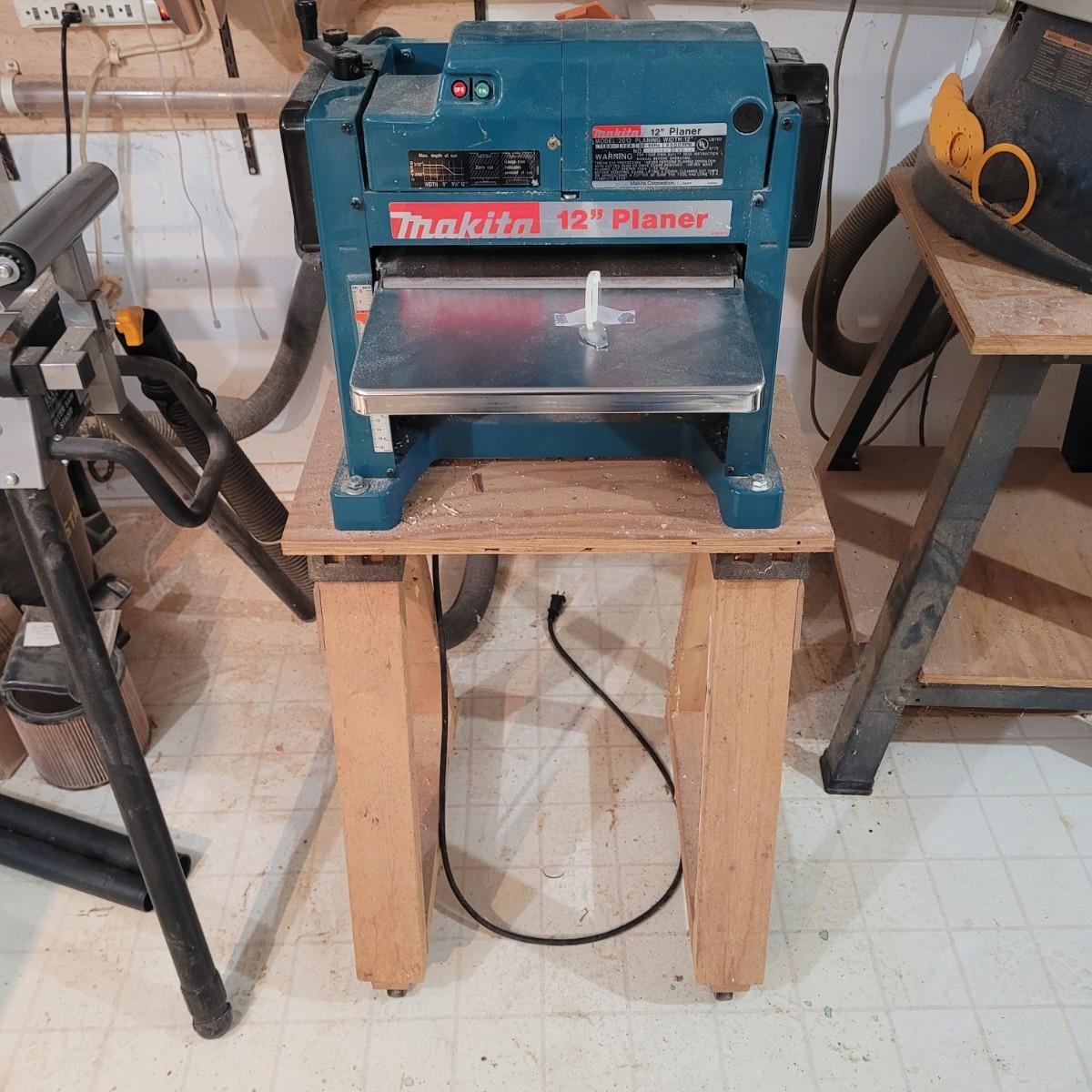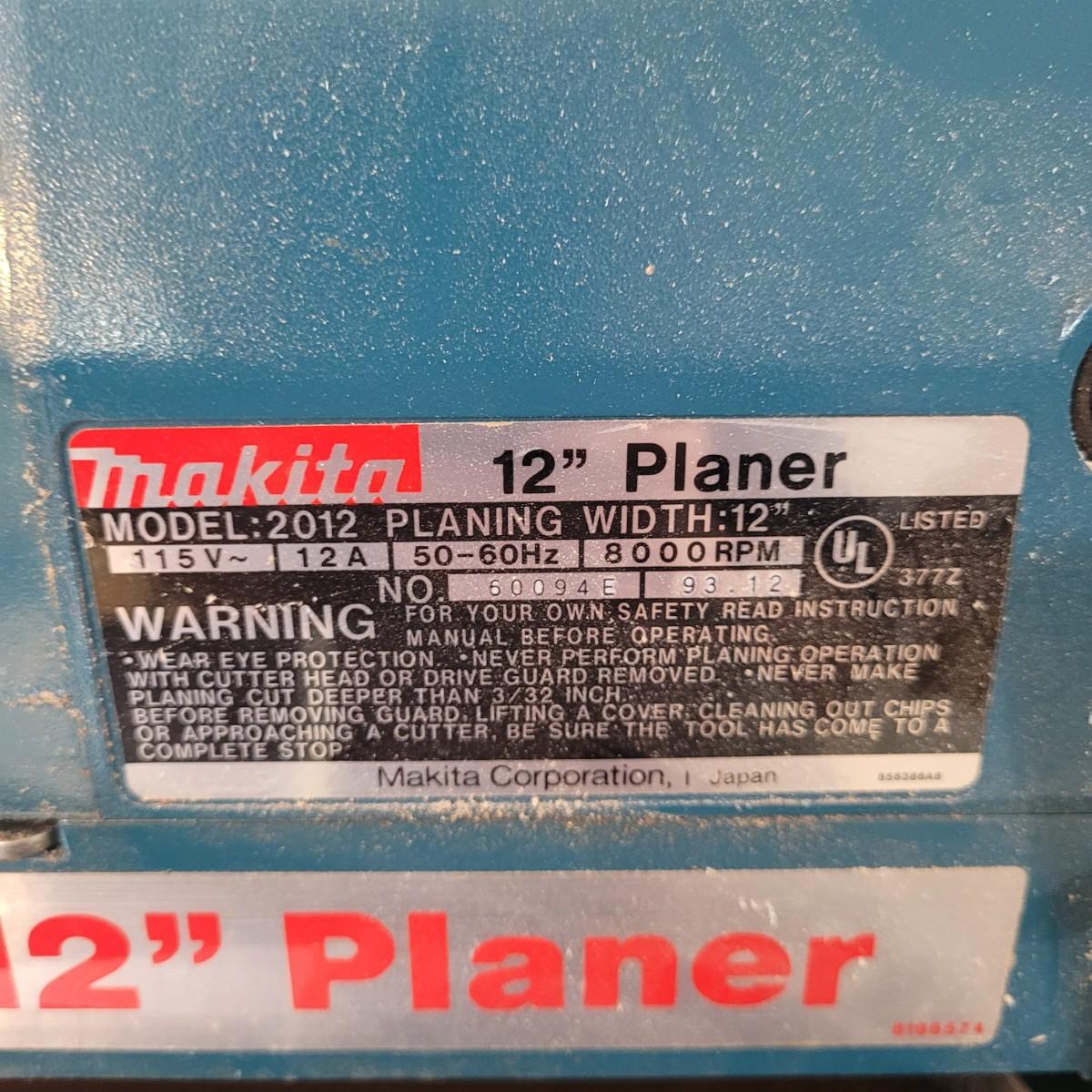 Marita brand 12" planer with attached table/stand with rollers. Powers on and appears to be in working order. Requires included safety key to engage. Item, with table, measures approximately 21" x 27" x 47"H.
