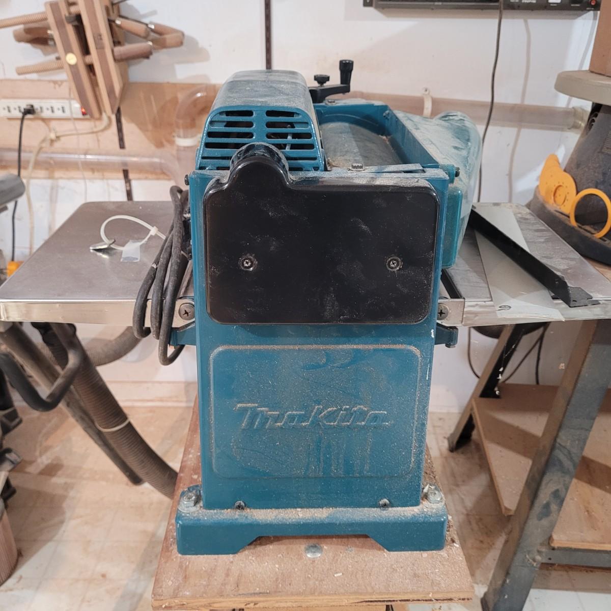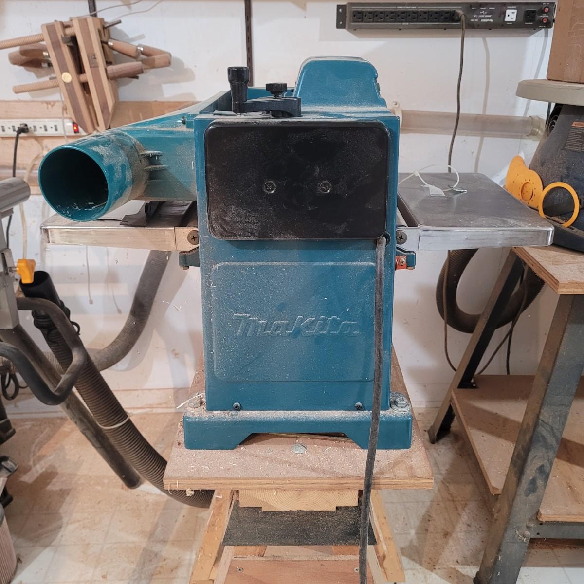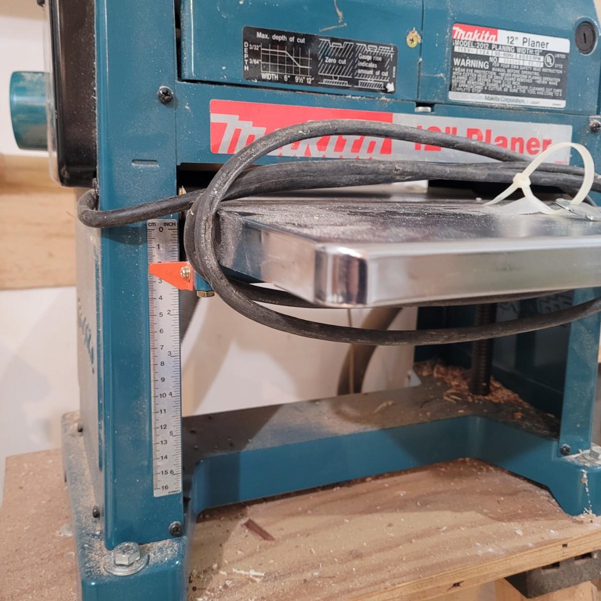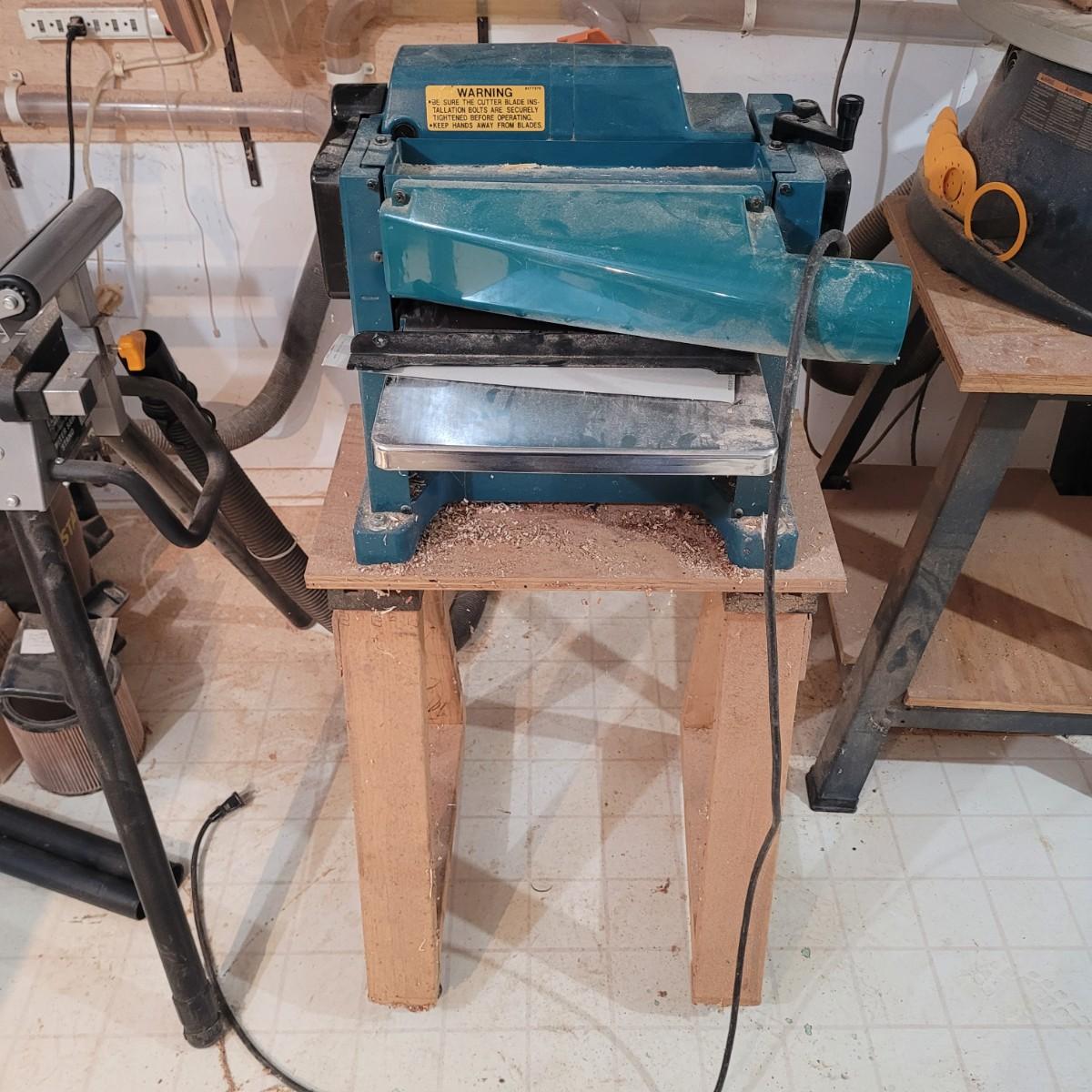Marita brand 12" planer with attached table/stand with rollers. Powers on and appears to be in working order. Requires included safety key to engage. Item, with table, measures approximately 21" x 27" x 47"H.