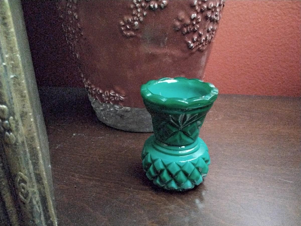 A miniature Vase carved from Malachite. Beautiful one of a kind piece. No chips or cracks, immaculate condition. 3" h