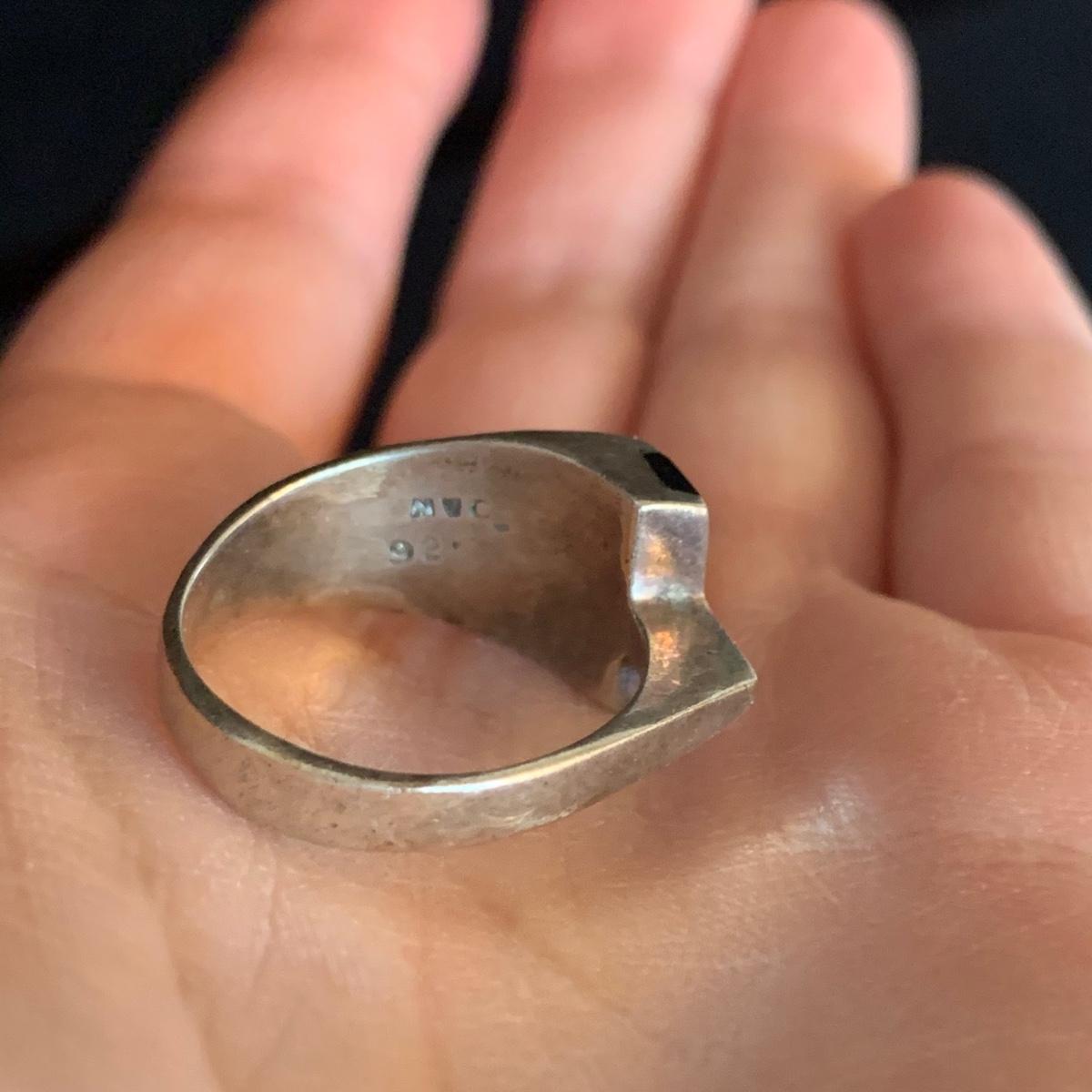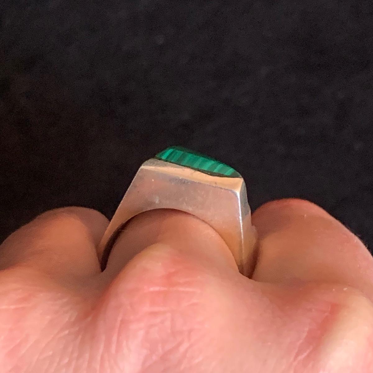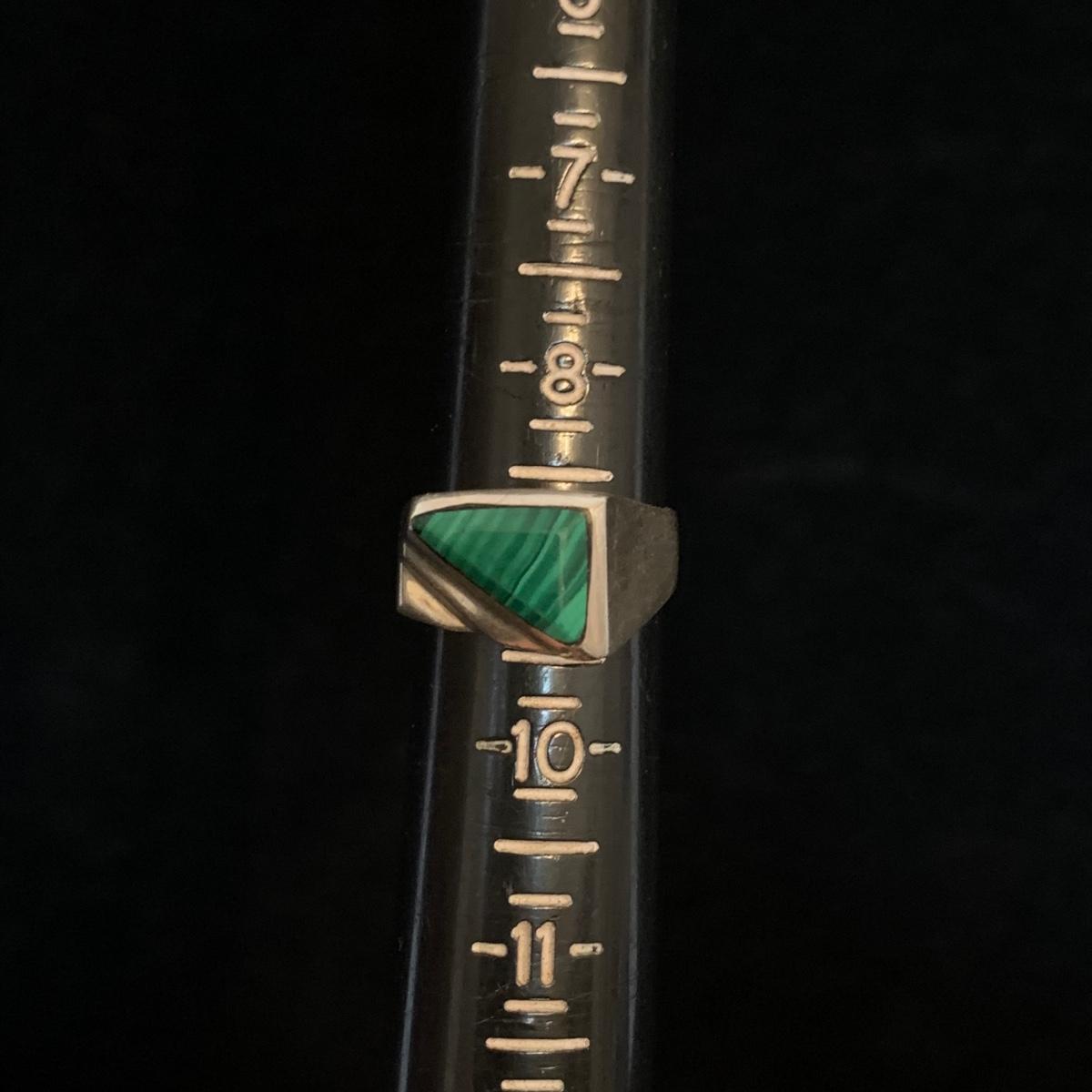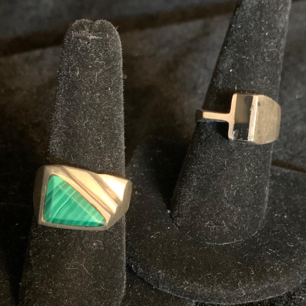 Two rings both stamped “˜925’. One has a beautiful striated green stone that has the appearance of malachite. The other has a shiny black onyx-like stone. The onyx-like stone has a small chip. Please see photos for all markings and size details.