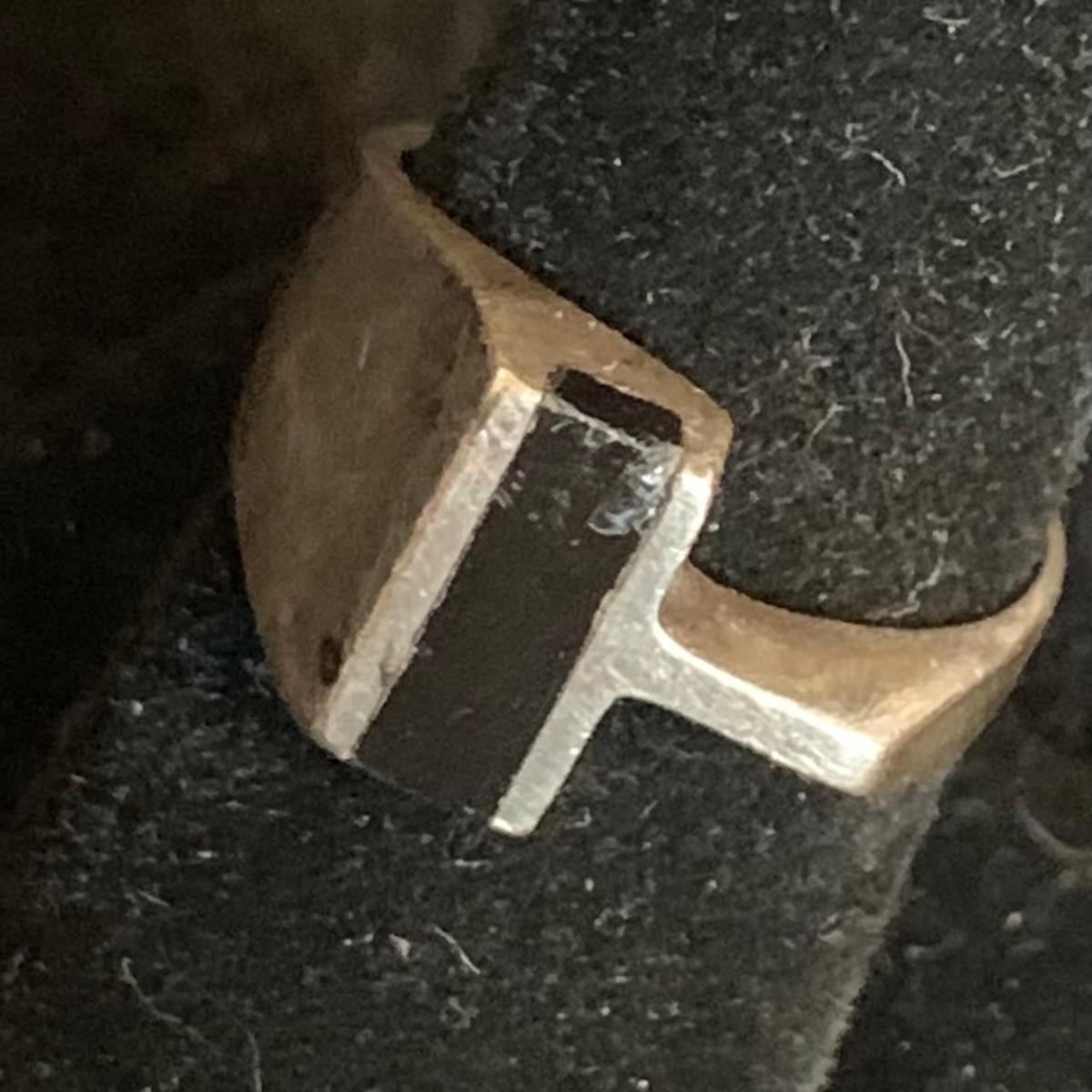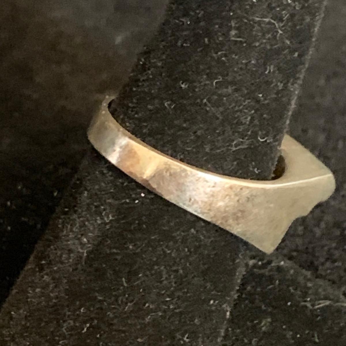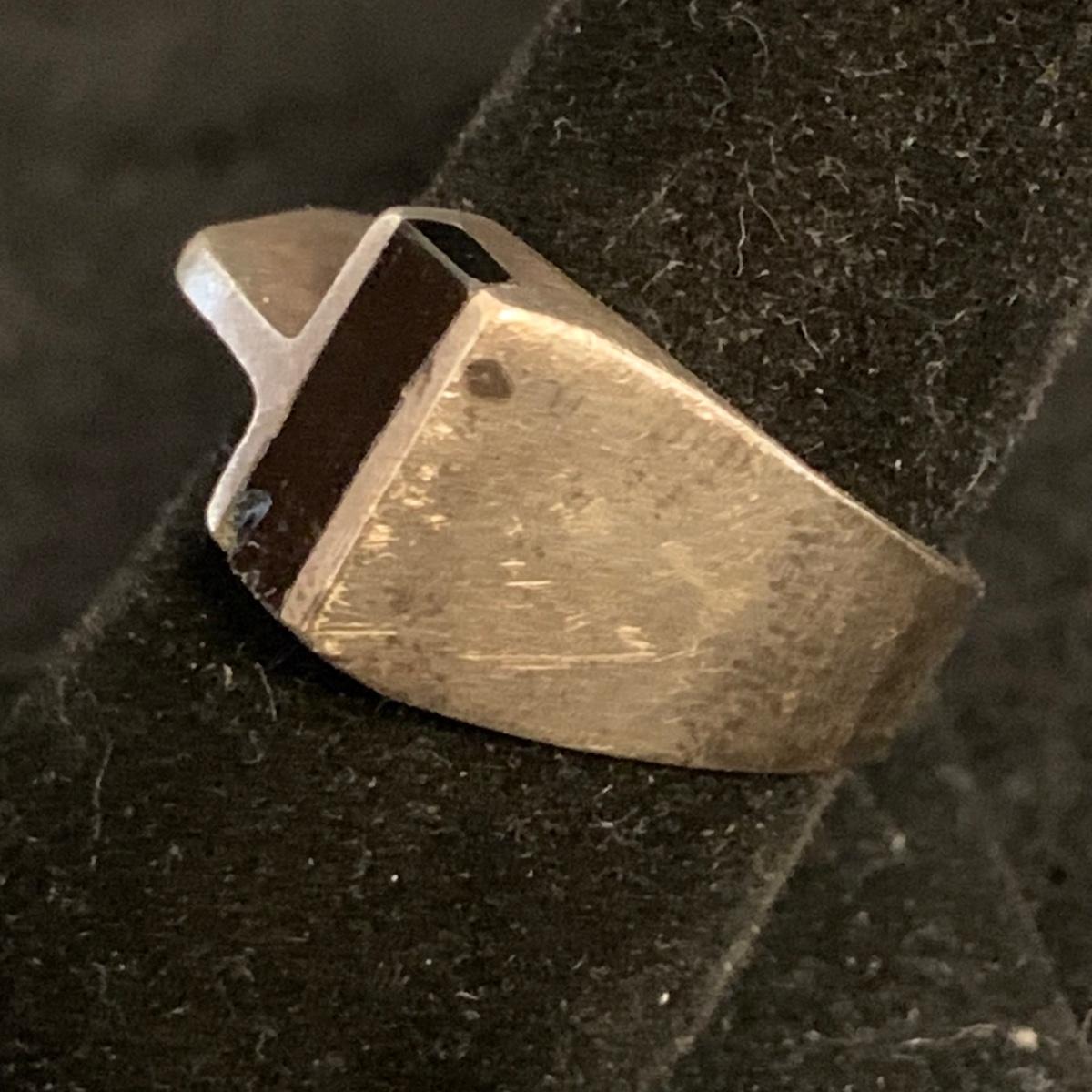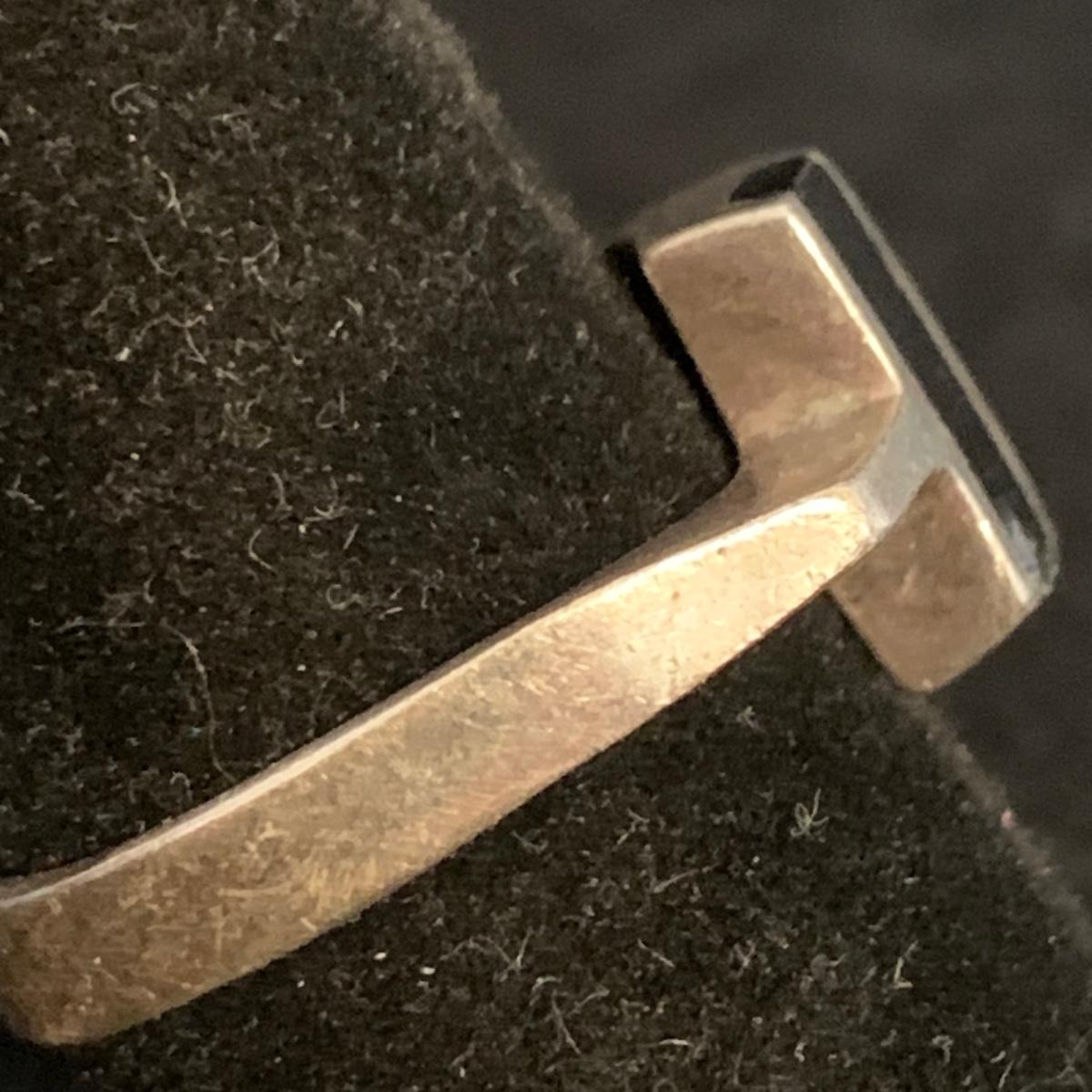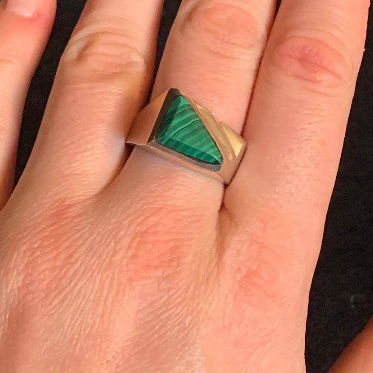 Two rings both stamped “˜925’. One has a beautiful striated green stone that has the appearance of malachite. The other has a shiny black onyx-like stone. The onyx-like stone has a small chip. Please see photos for all markings and size details.