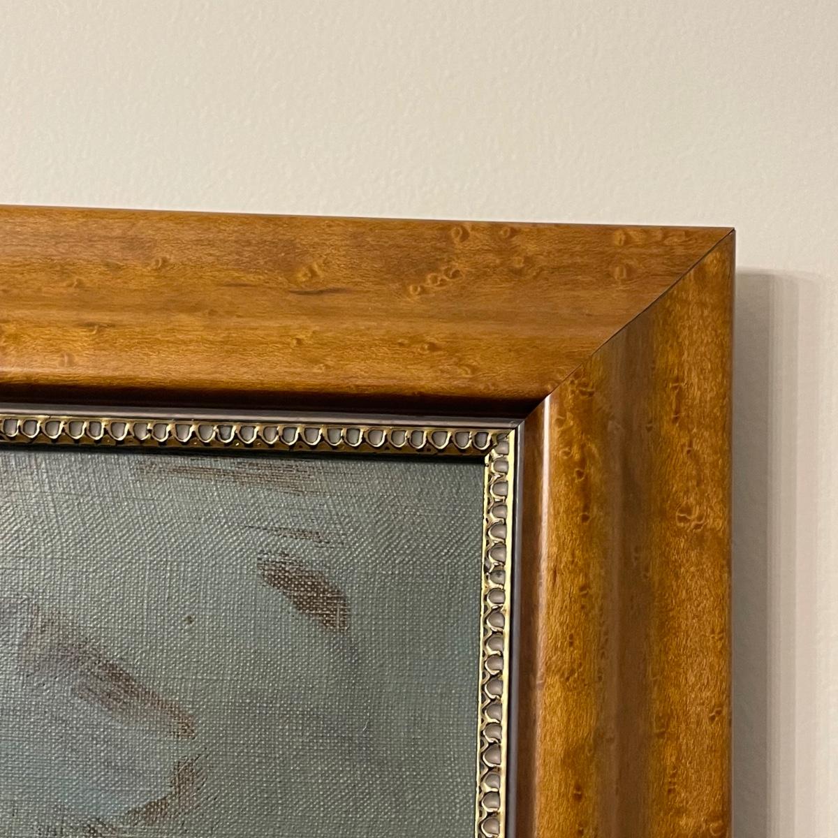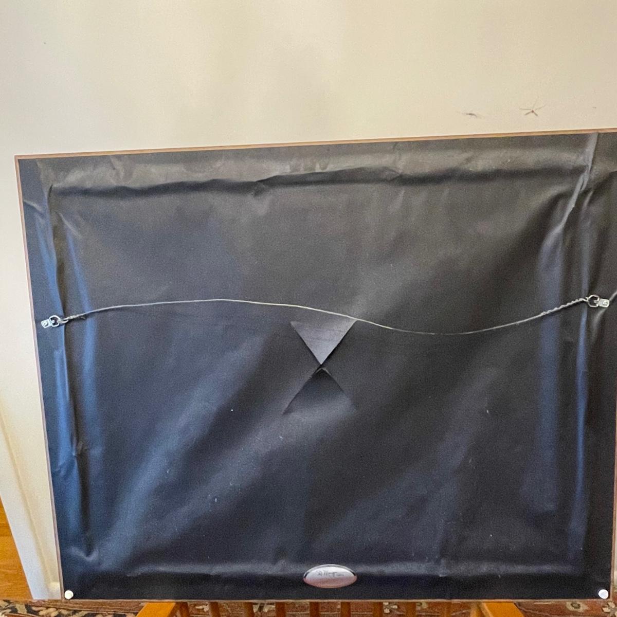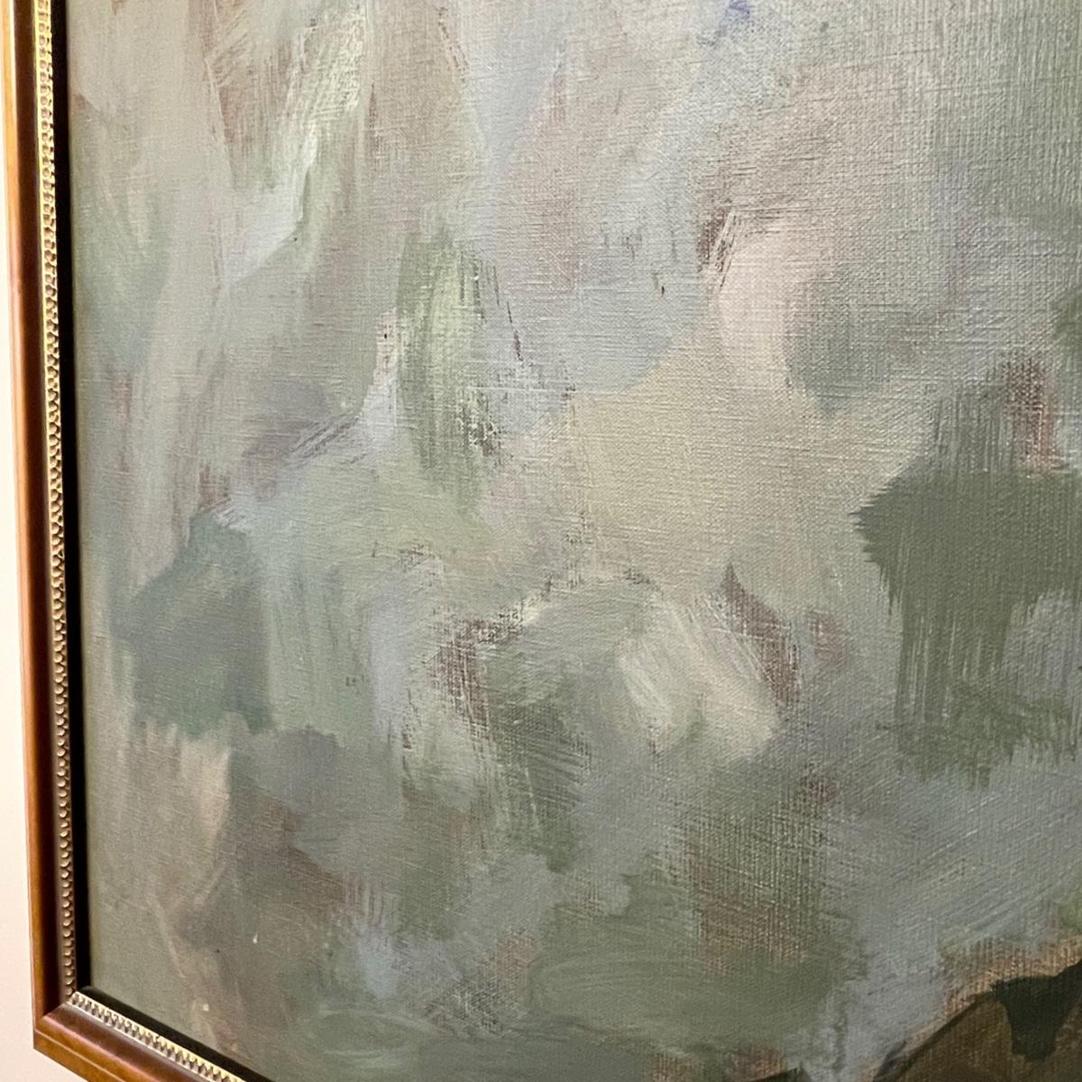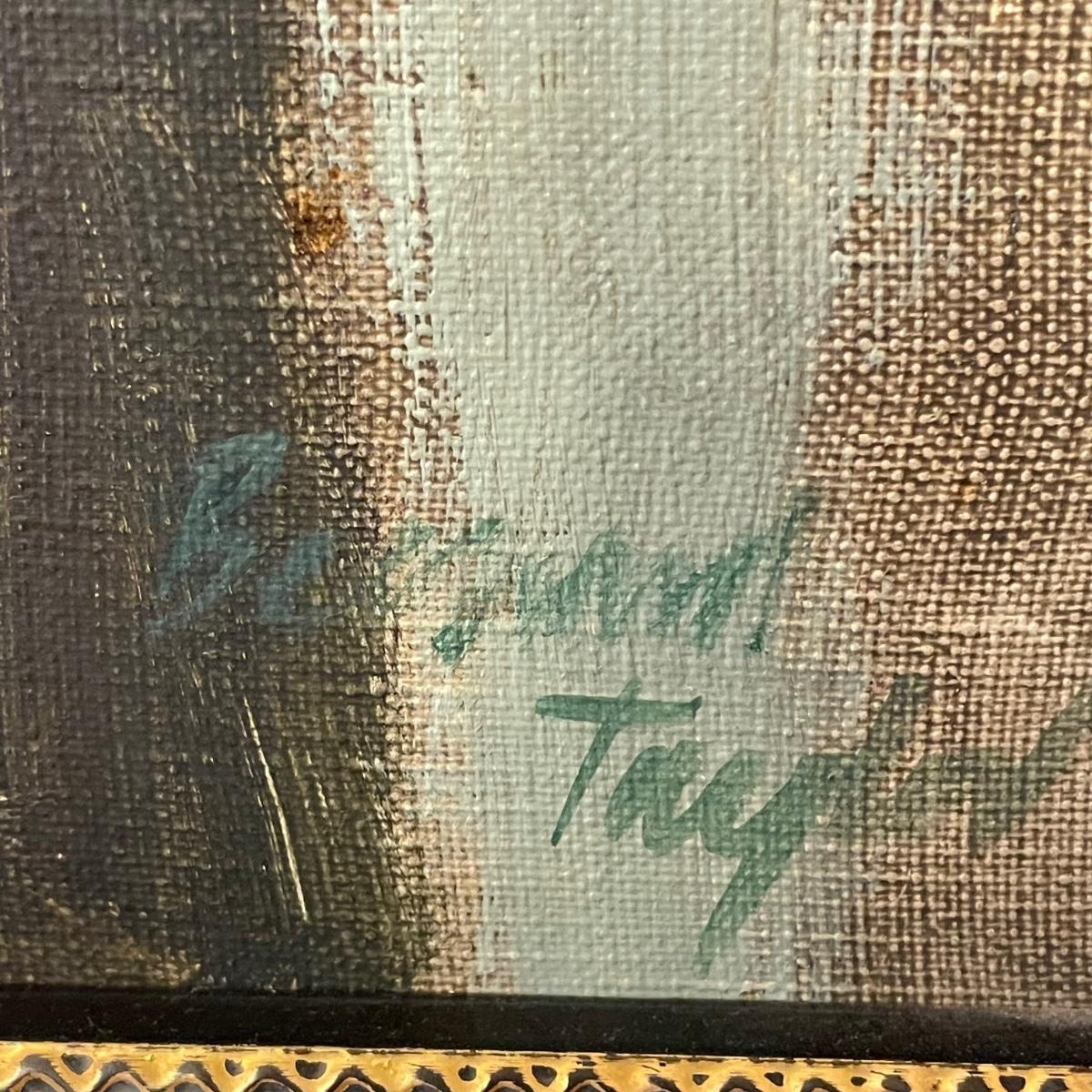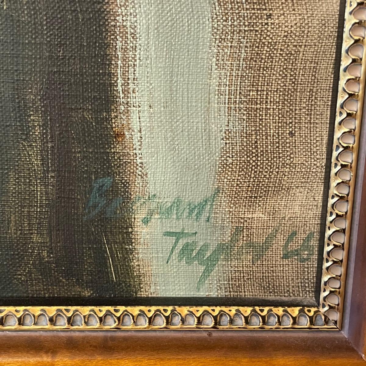 This signed painting appears to be an original painting in acrylic. Signature reads possibly "Beargant Taylor", but it is not completely legible so we cannot verify the artist, see images. It’s mounted in an attractive walnut colored frame that appears to be a lightweight lacquered wood. Both frame and painting are very clean and in great condition.