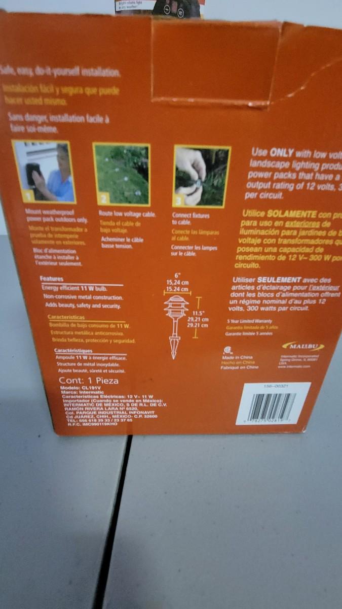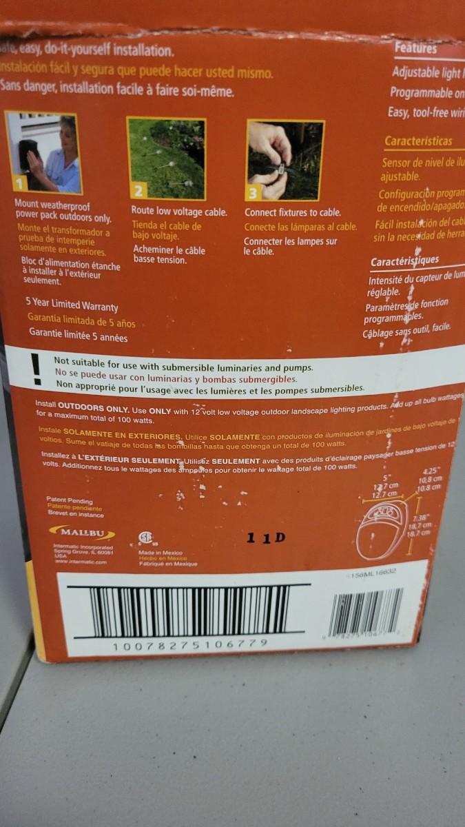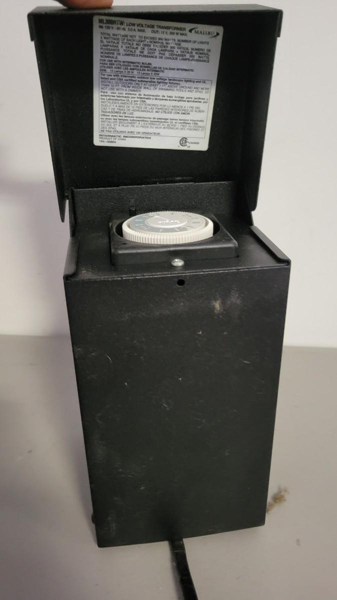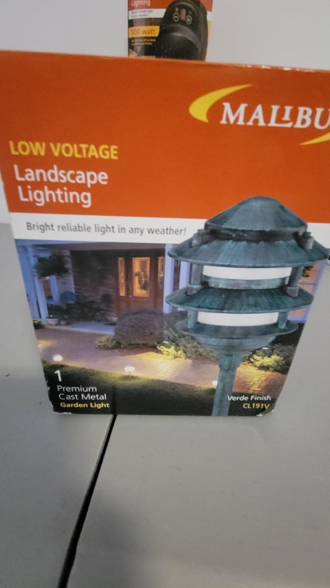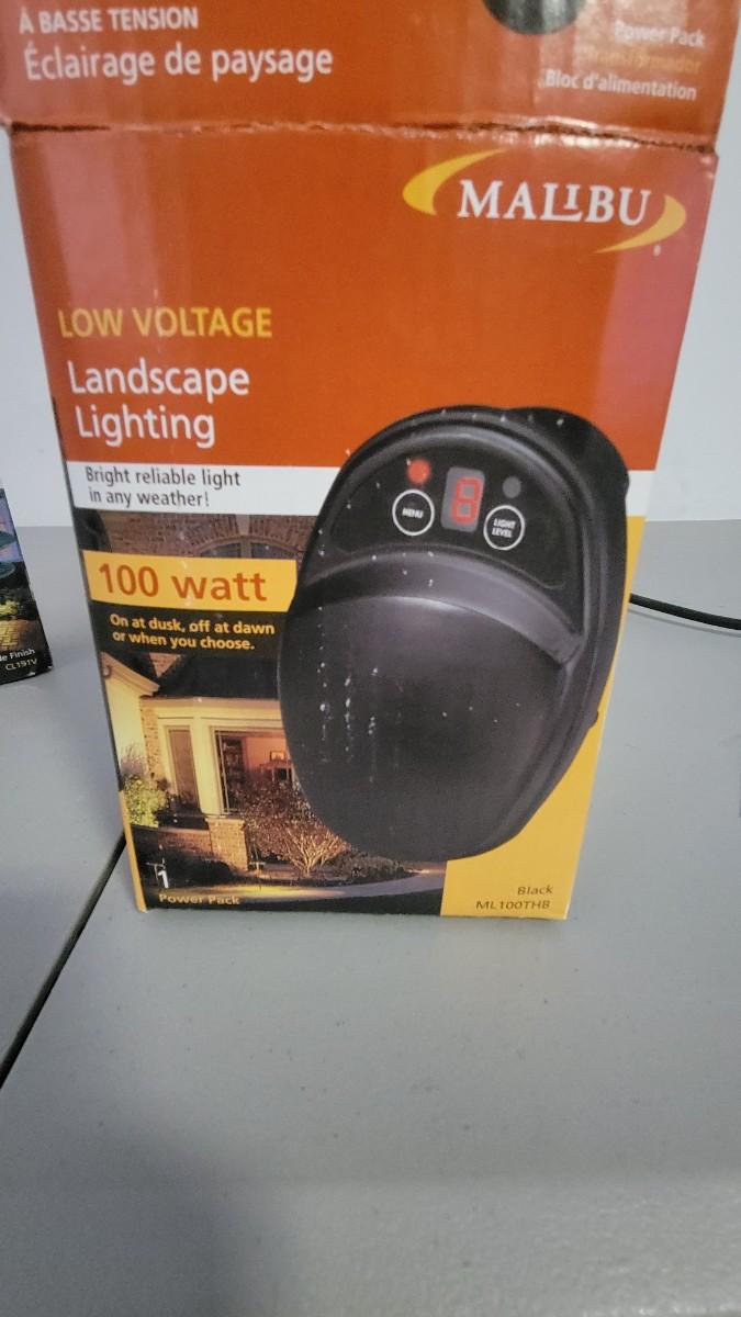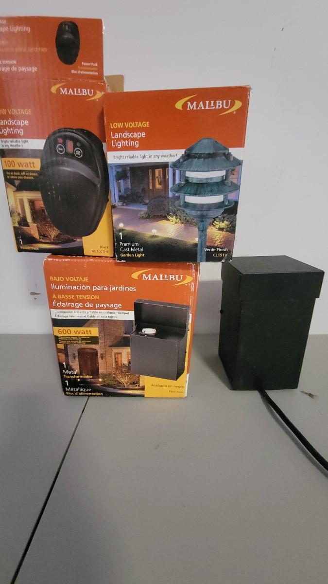 Malibu low voltage landscape lighting lot. Includes 1 premium cast metal landscape light, 1 adjustable power pack, 1 600watt transformer and 1 300watt transformer. All but the 300watt transformer are new and in original packaging. Local pickup only