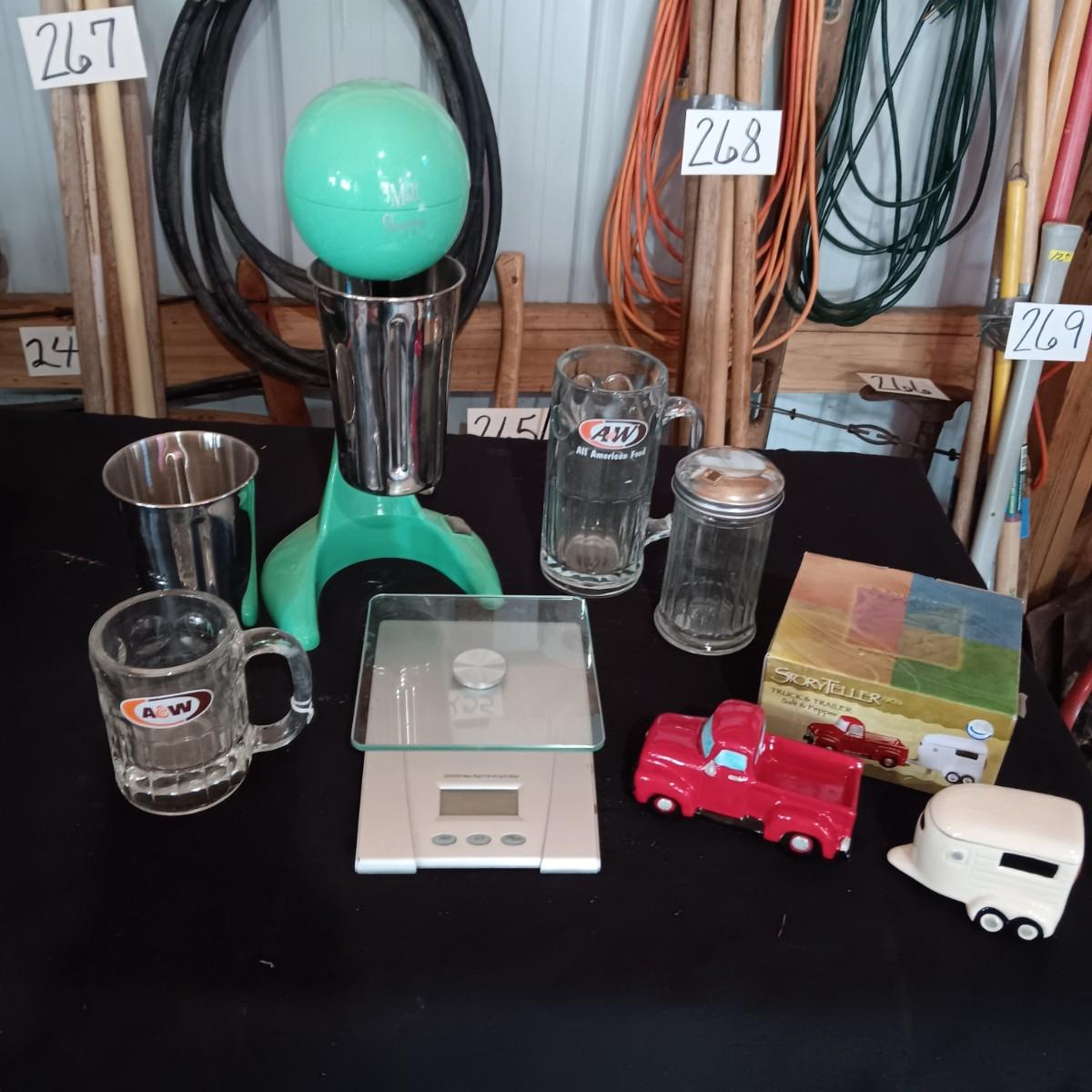 MALT SHOPPE MAKER, A & W MUGS, TRUCK AND HORSE TRAILER SHAKERS AND MORE