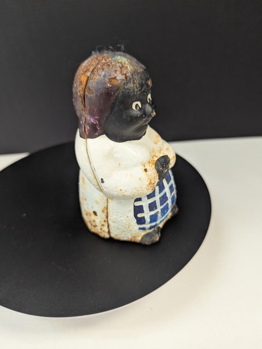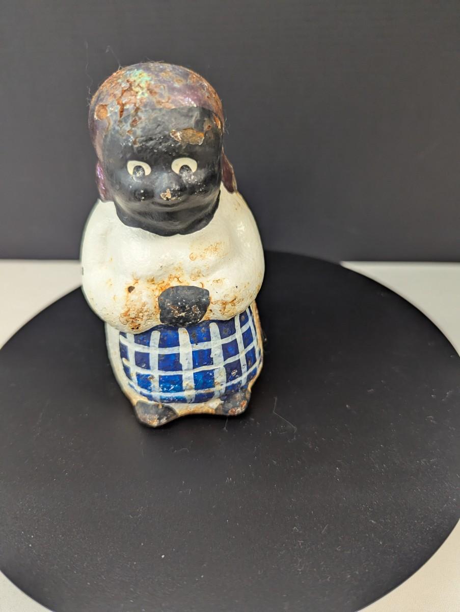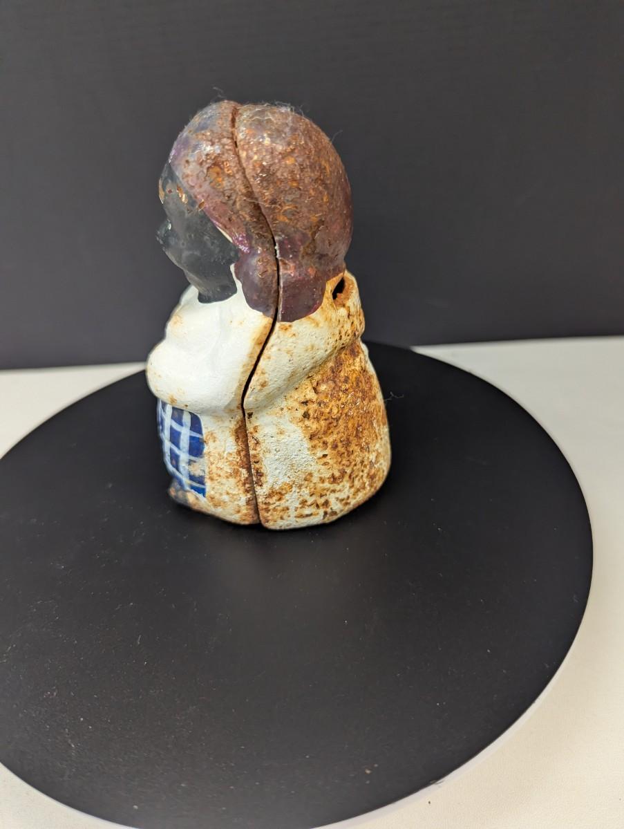 Antique African American Figural Cast Iron Bank Blue & White Checker Apron. Item has oxidation and condition issues. Please see all pictures.