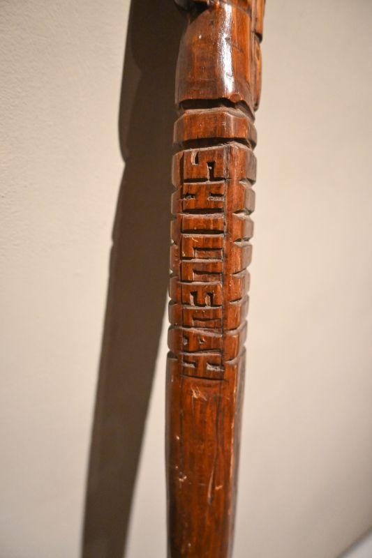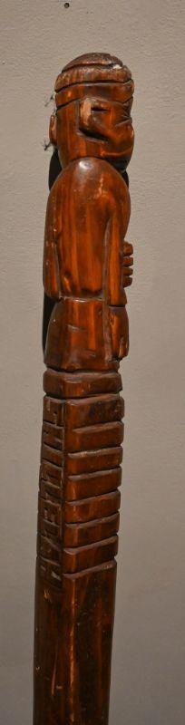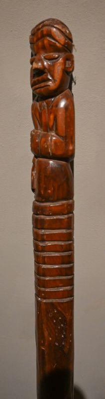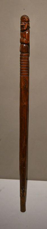 A cane topped with a tiki-style man carving by an unknown or anonymous artist. Wood. Approx. 1" x 1.5" x 34".