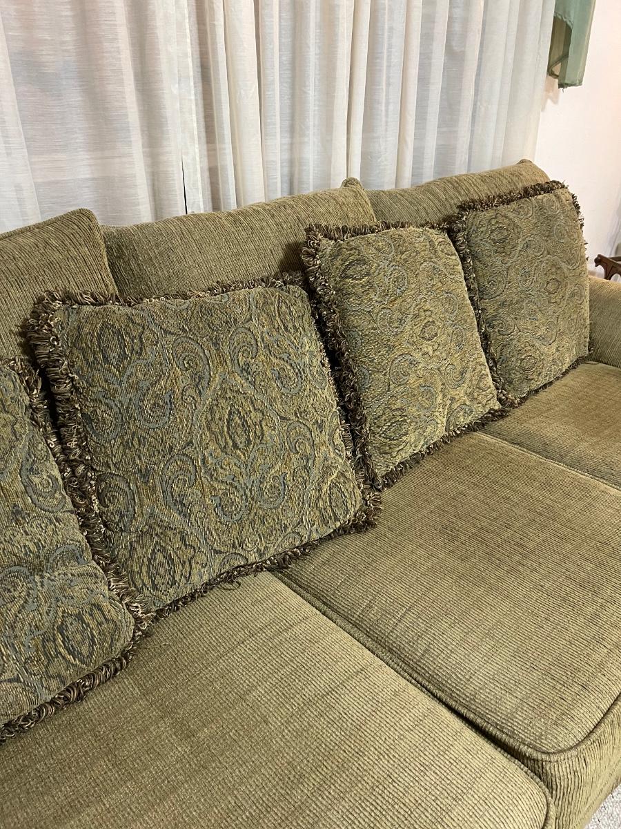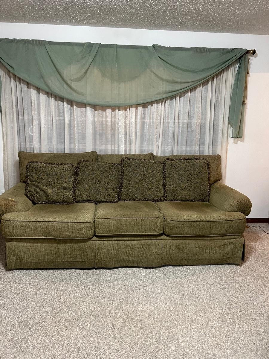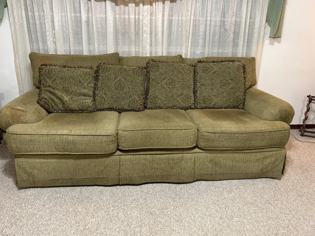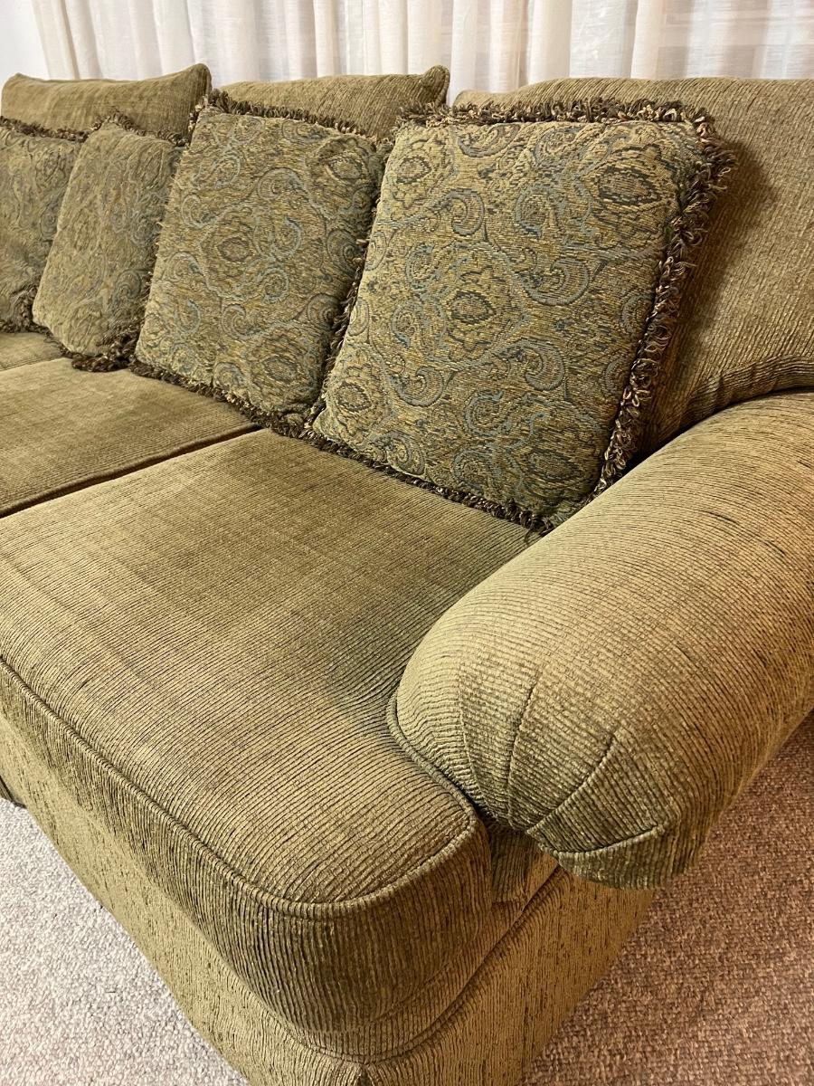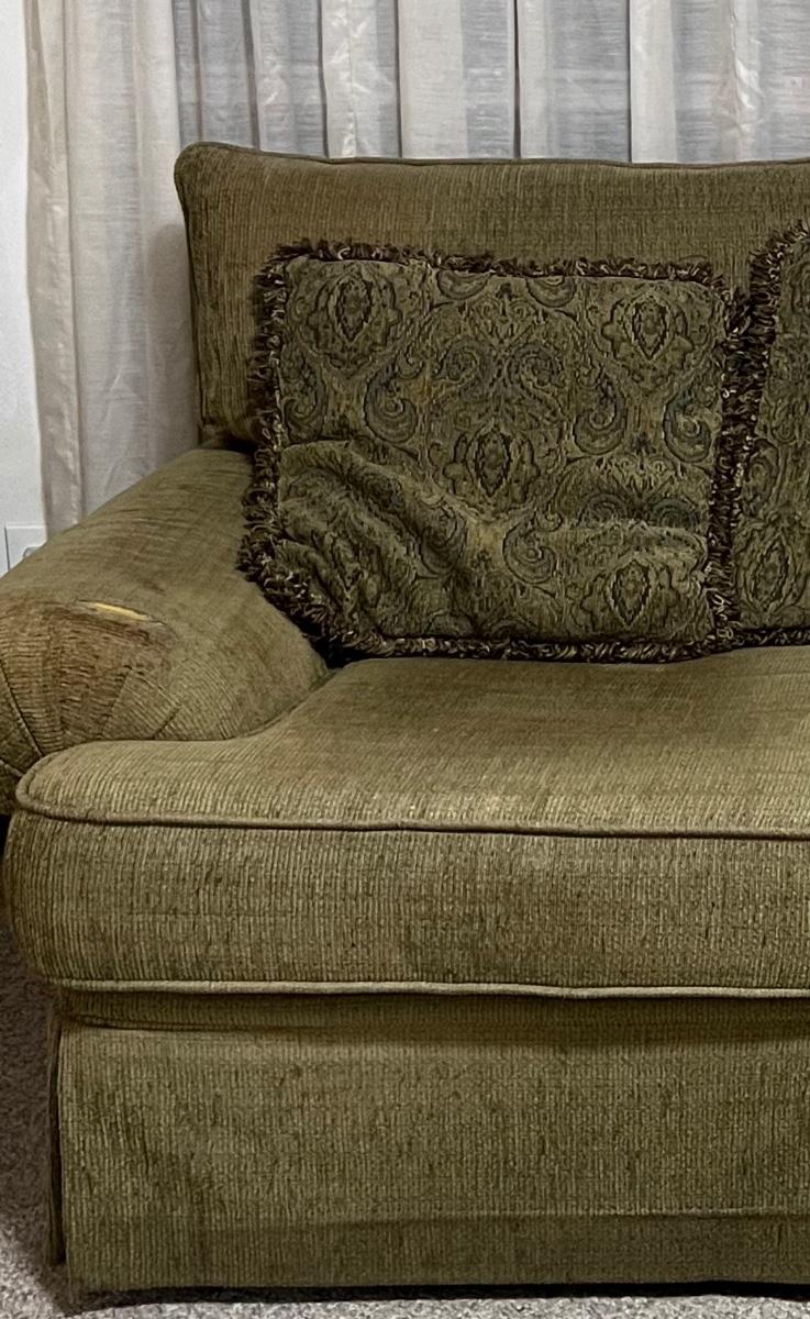 MAN CAVE Oversized couch measures 104 inches long, 44 inches deep, 19 inches from floor to seat. The right arm of the couch has a noticeable tear. See pictures.