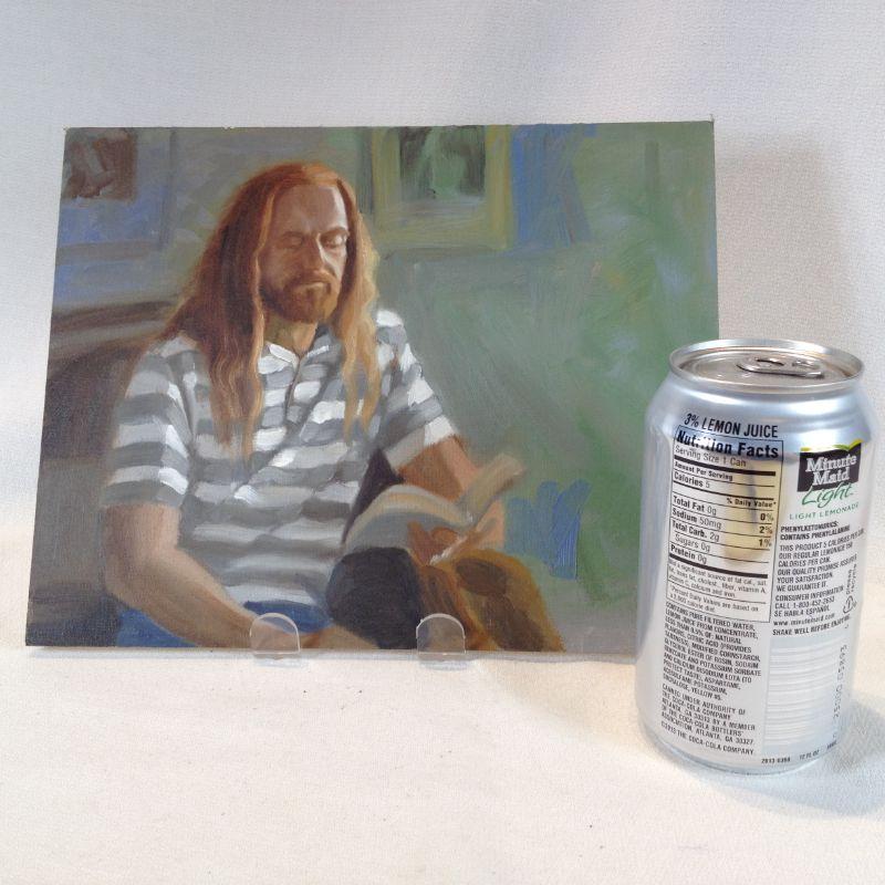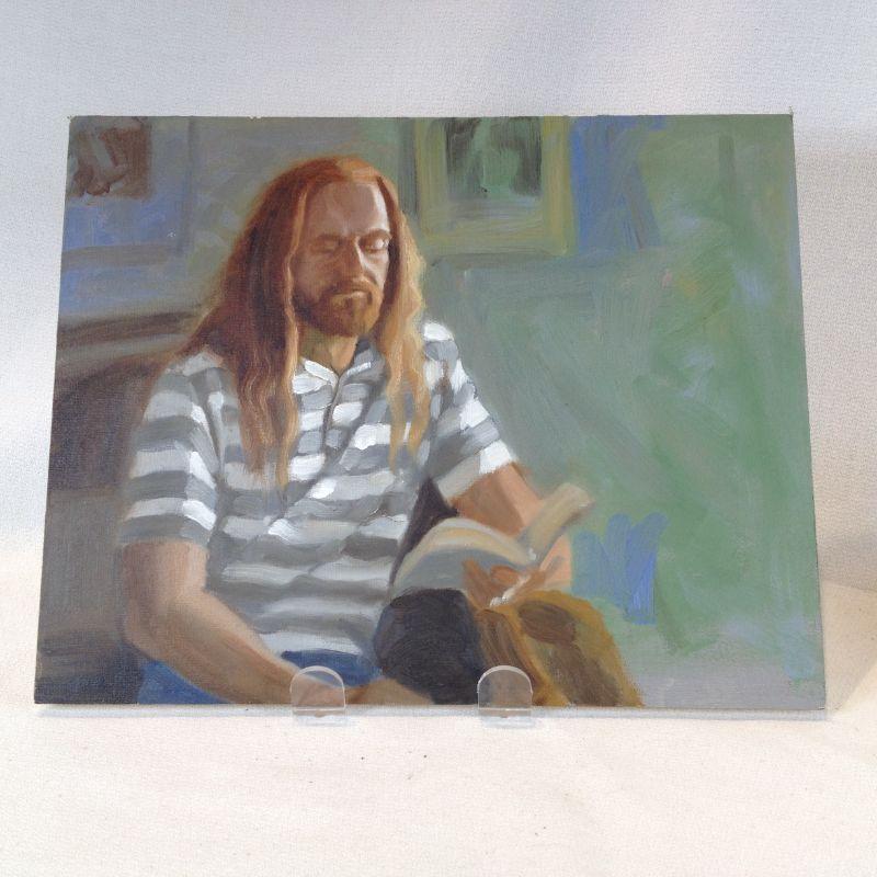 This lot is a small well-done Modern Oil on Board depicting a long-haired man reading a book. It is not signed but in very good condition. It measures 8-inches tall X 10-inches wide so it will easily fit in a ready-made frame for easy hanging.