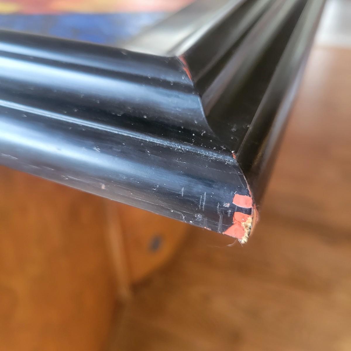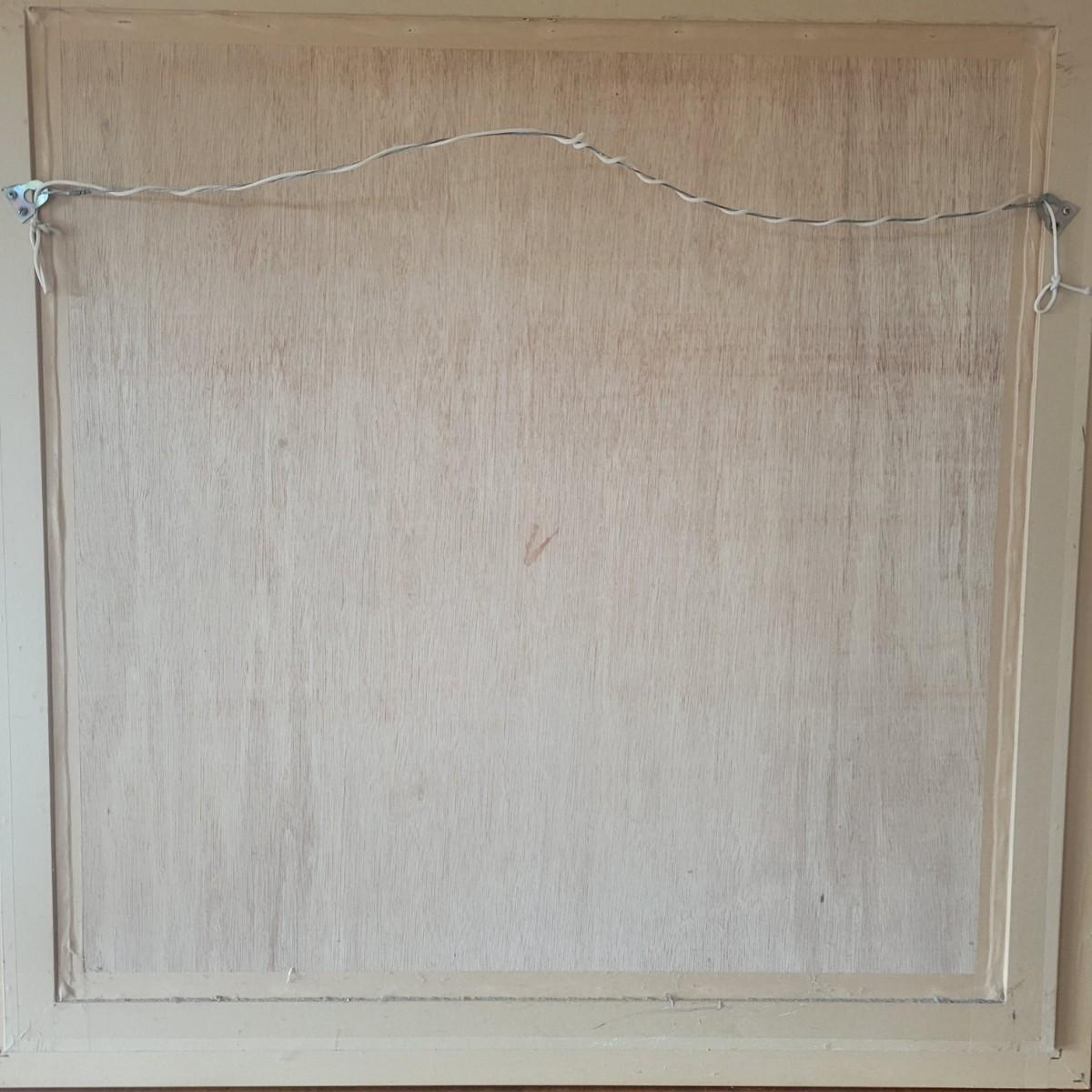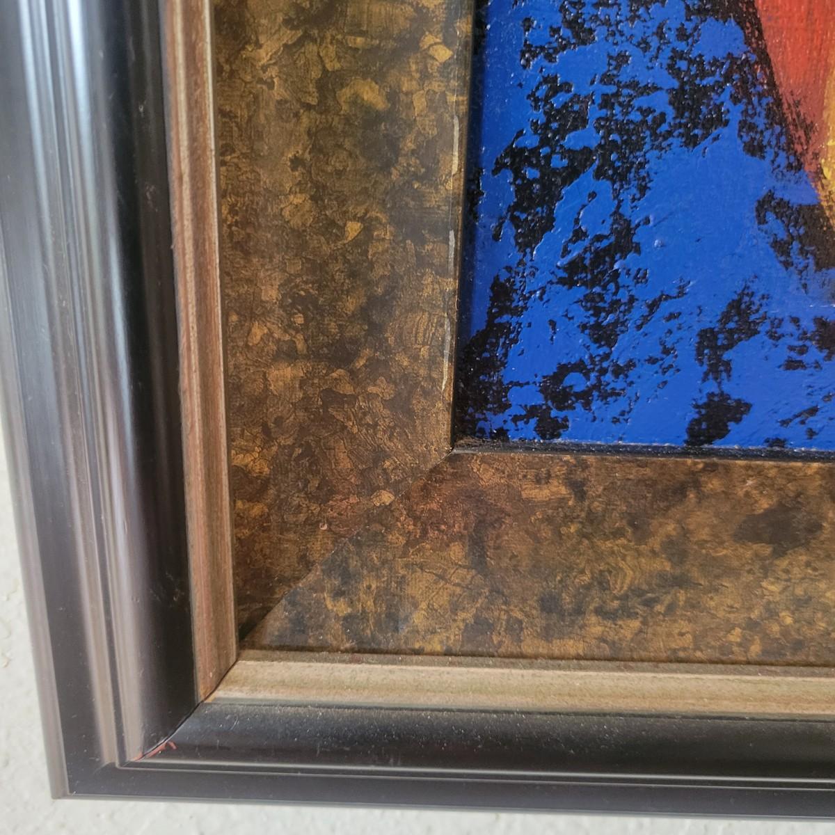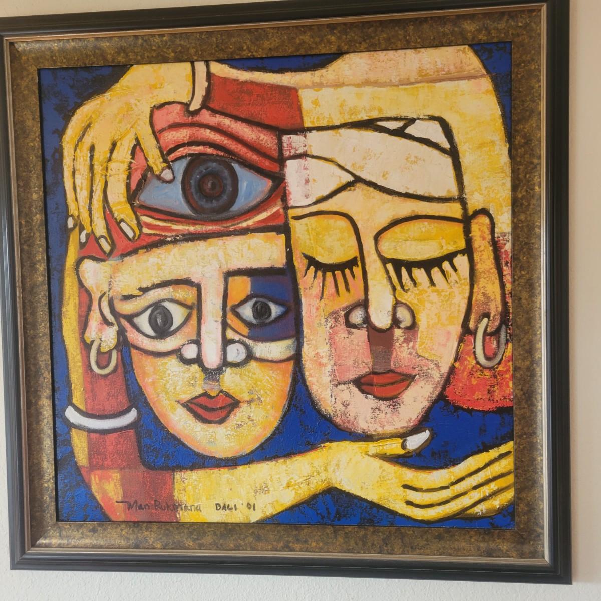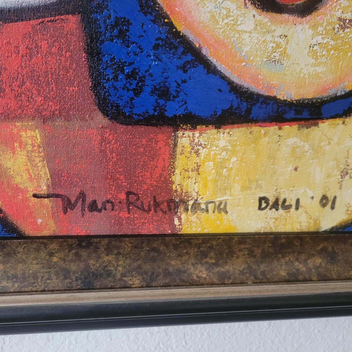 An original framed oil on wood in good condition with some minor blemishes on the frame corners. This piece was painted by Man Rukmanu from Bali. It features rich colors and a wooden frame black enamel with a gold and black liner. Piece measures approximately 32" x 33" x 1.5". Shipping available. Shipping art can be costly. We suggest calling our local UPS with dimensions and getting an estimate before bidding: (828) 252-6930