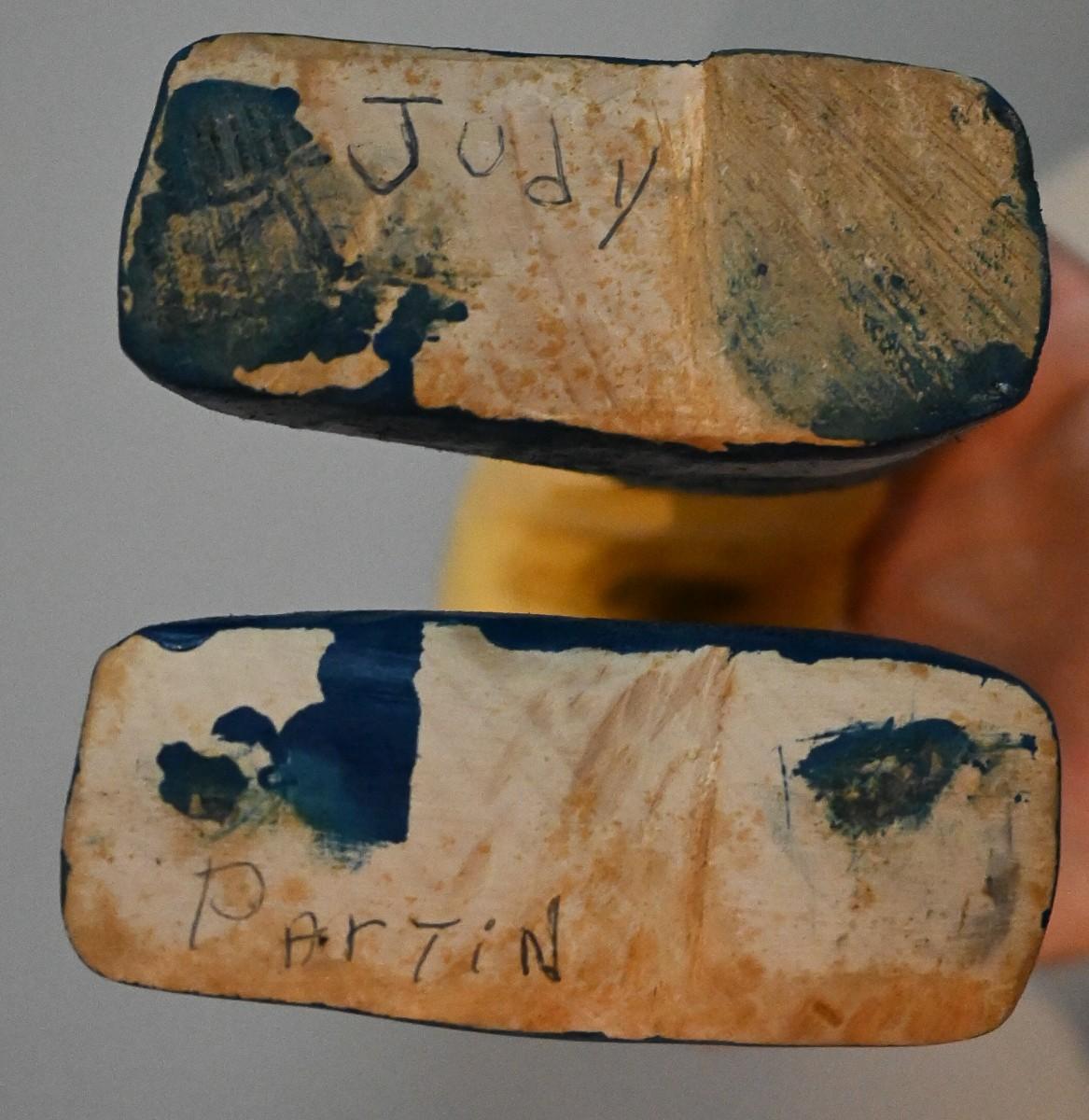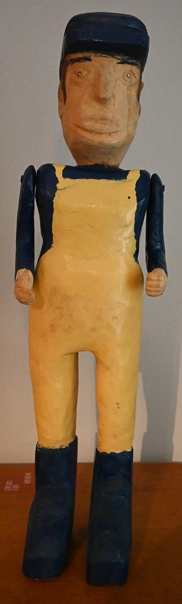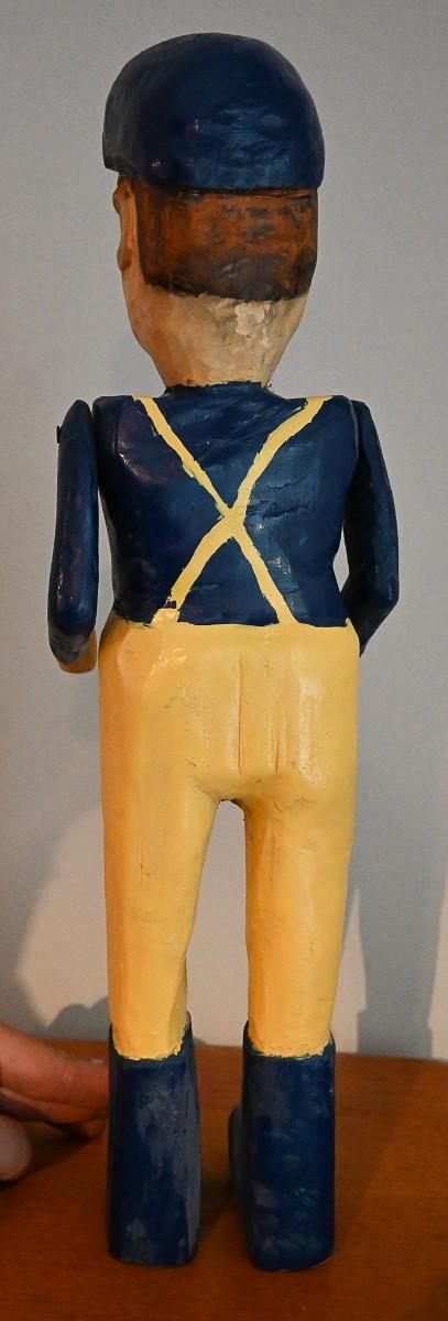 A man sculpture by artist Judy Partin. Wood, paint. Approx. 17.5" x 5" x 3".