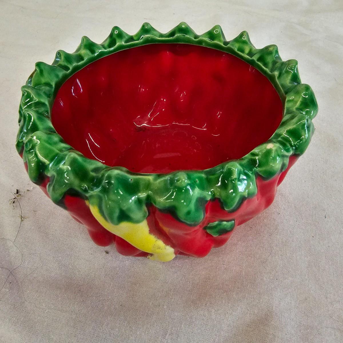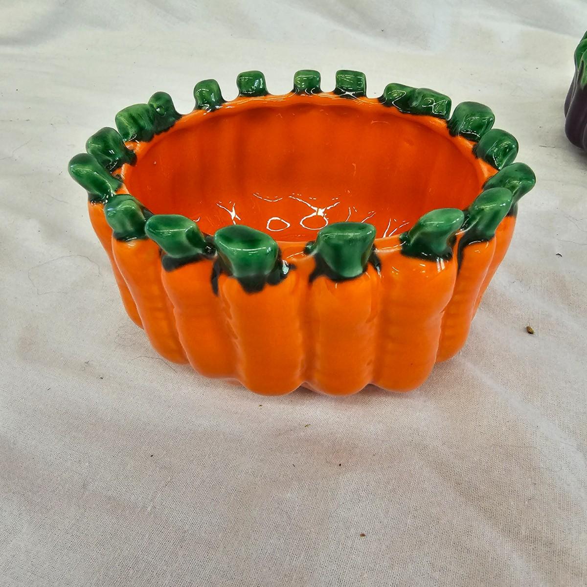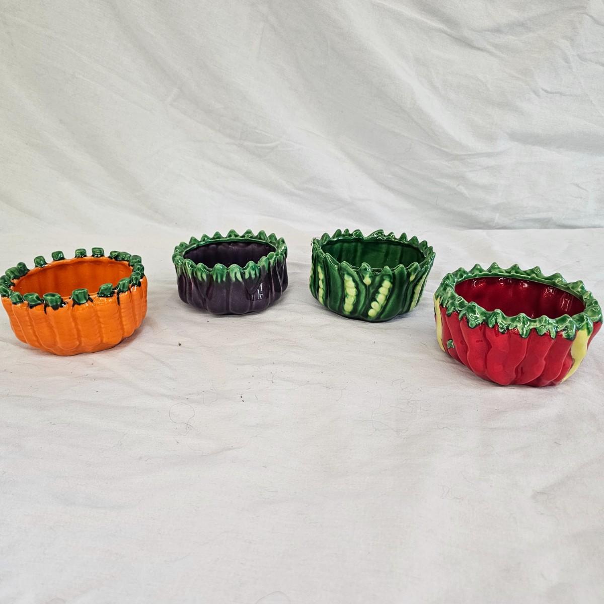 Four adorable ceramic bowls representing vegetables. Carrot, eggplant, peas and peppers are the motif of these items. Each piece is 5"D x 3"H, and stamped on bottom with manufacturers data. See photos for details. Shipping available.