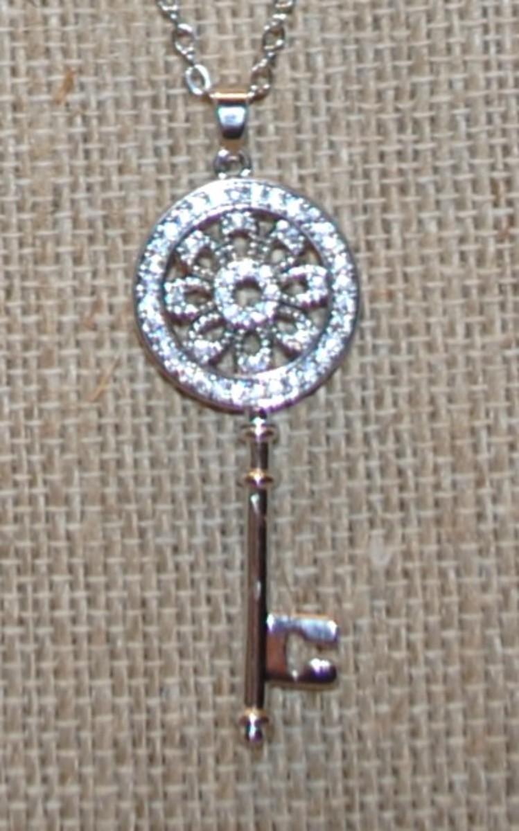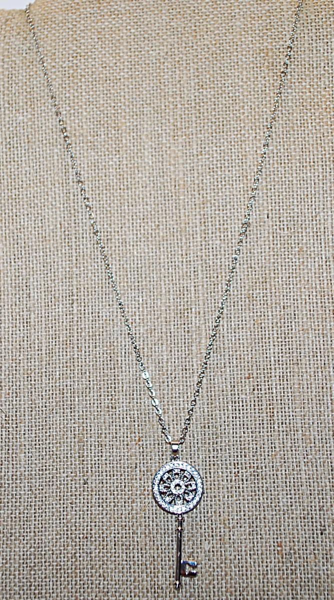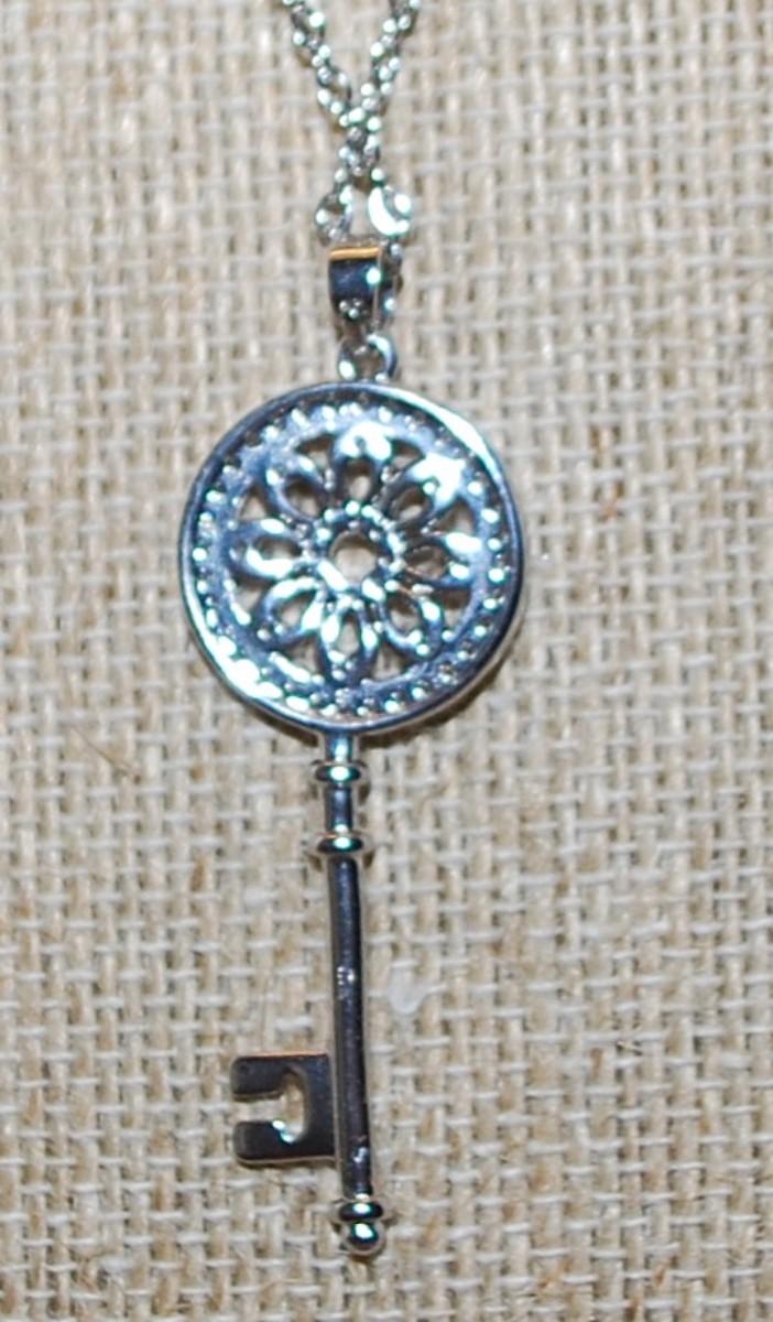 Mandala-Style KEY PENDANT 1¾" x ½" on a Silver Tone Necklace Chain 17" L