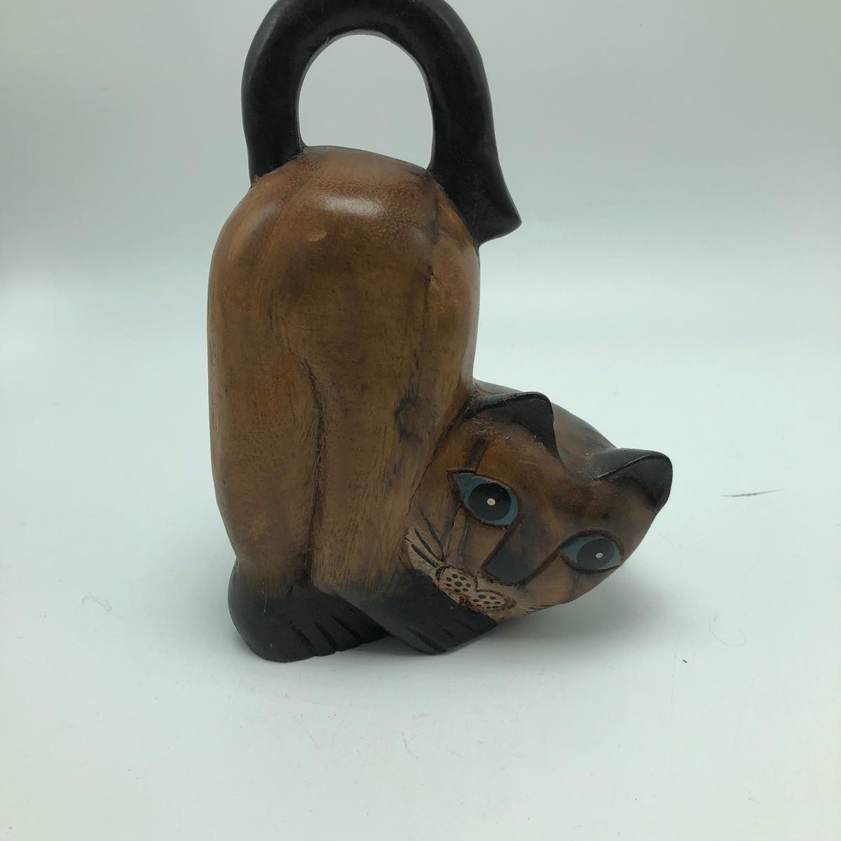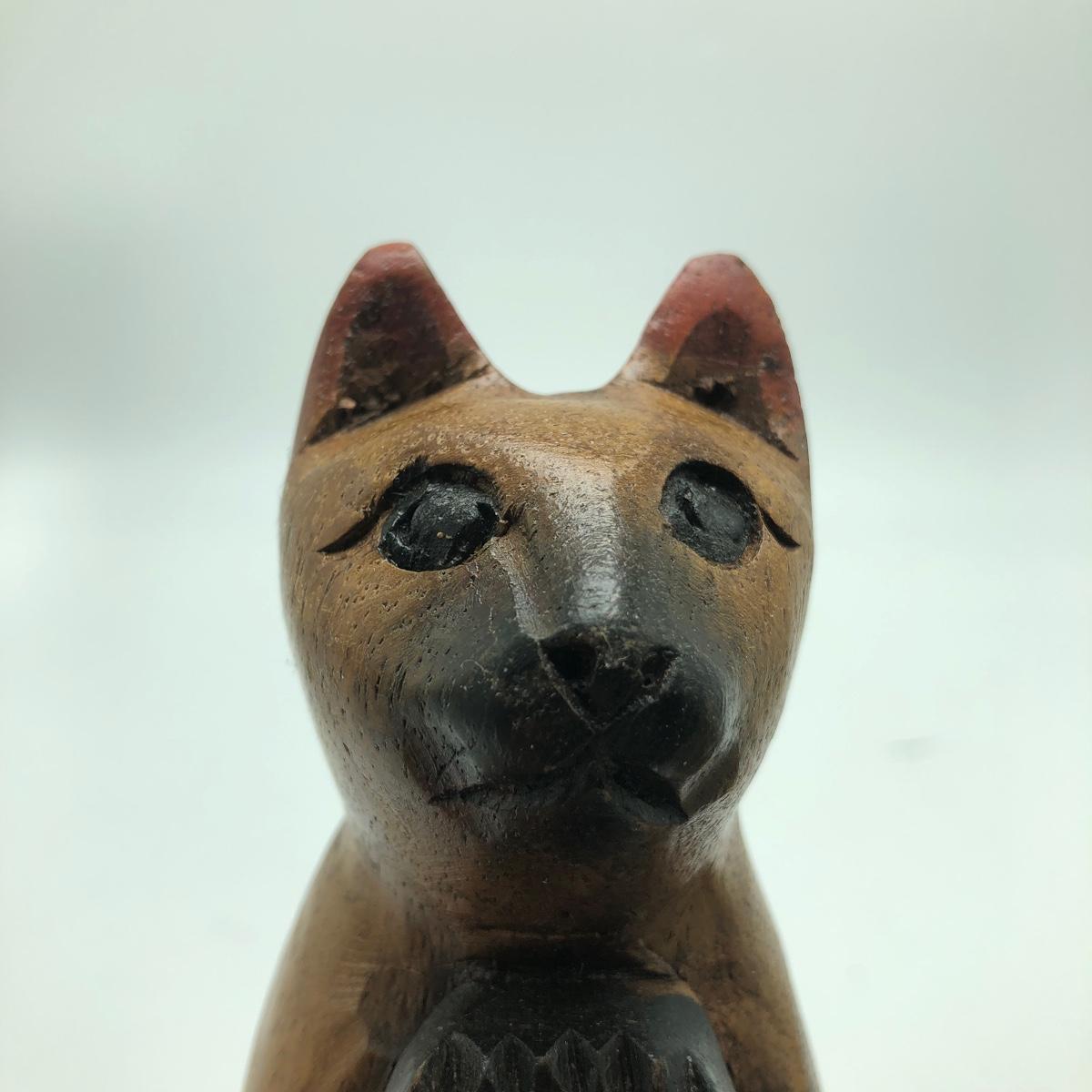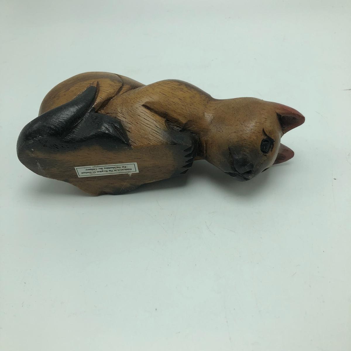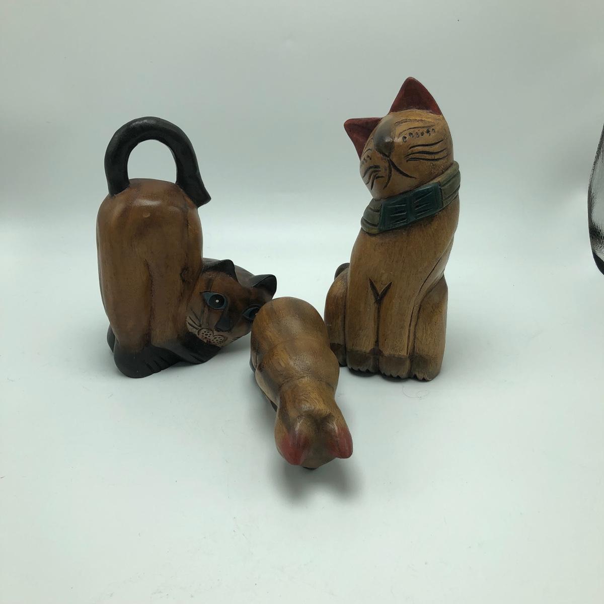 Lot includes a Mandalay Box Co. handcrafted wooden cat and two other carved wooden cats with no markings. Tallest cat measures 8” tall.