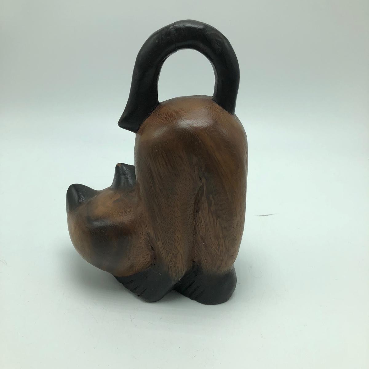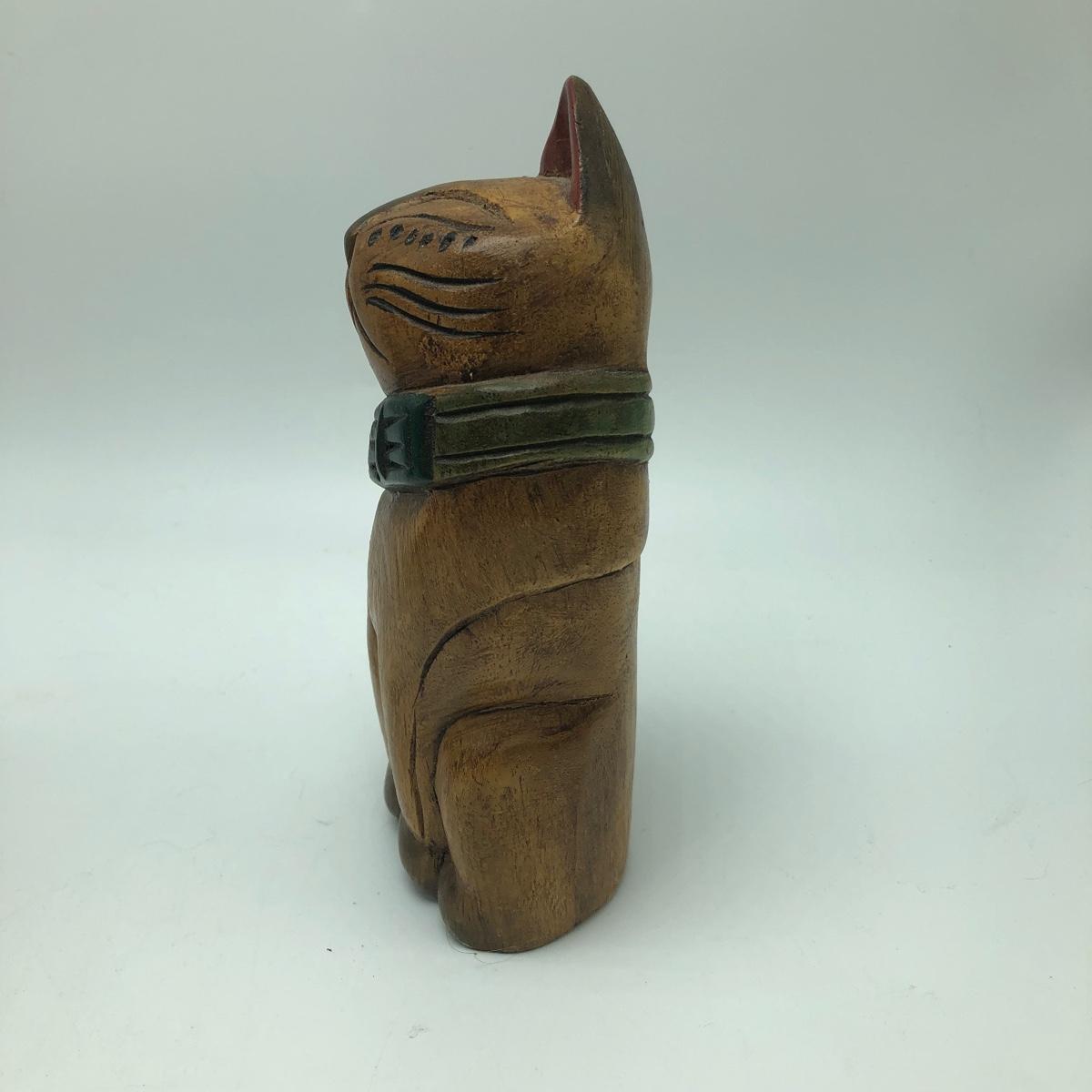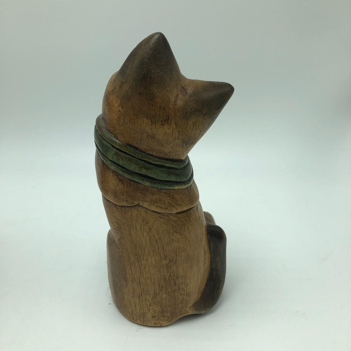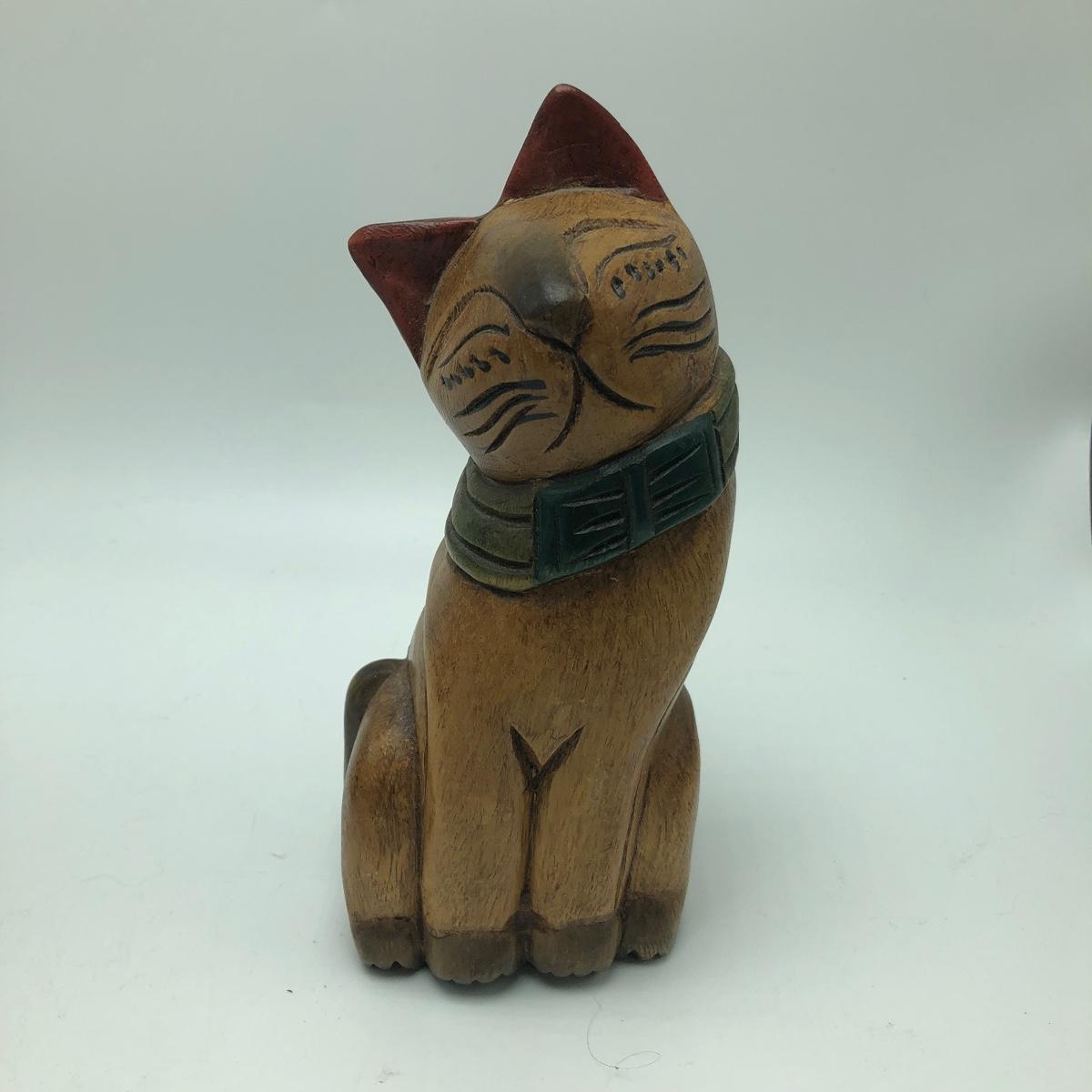 Lot includes a Mandalay Box Co. handcrafted wooden cat and two other carved wooden cats with no markings. Tallest cat measures 8” tall.