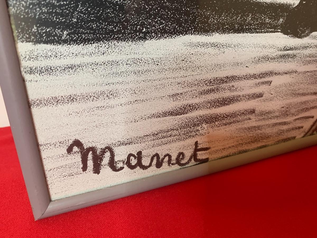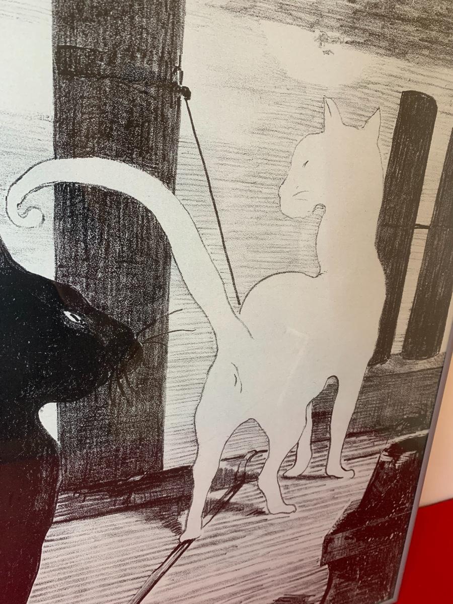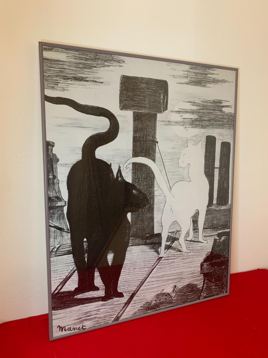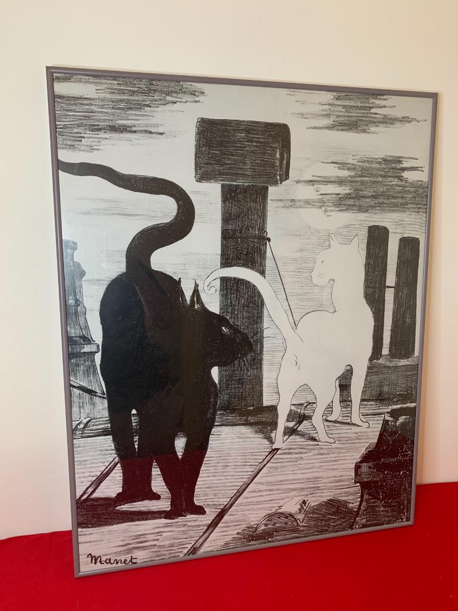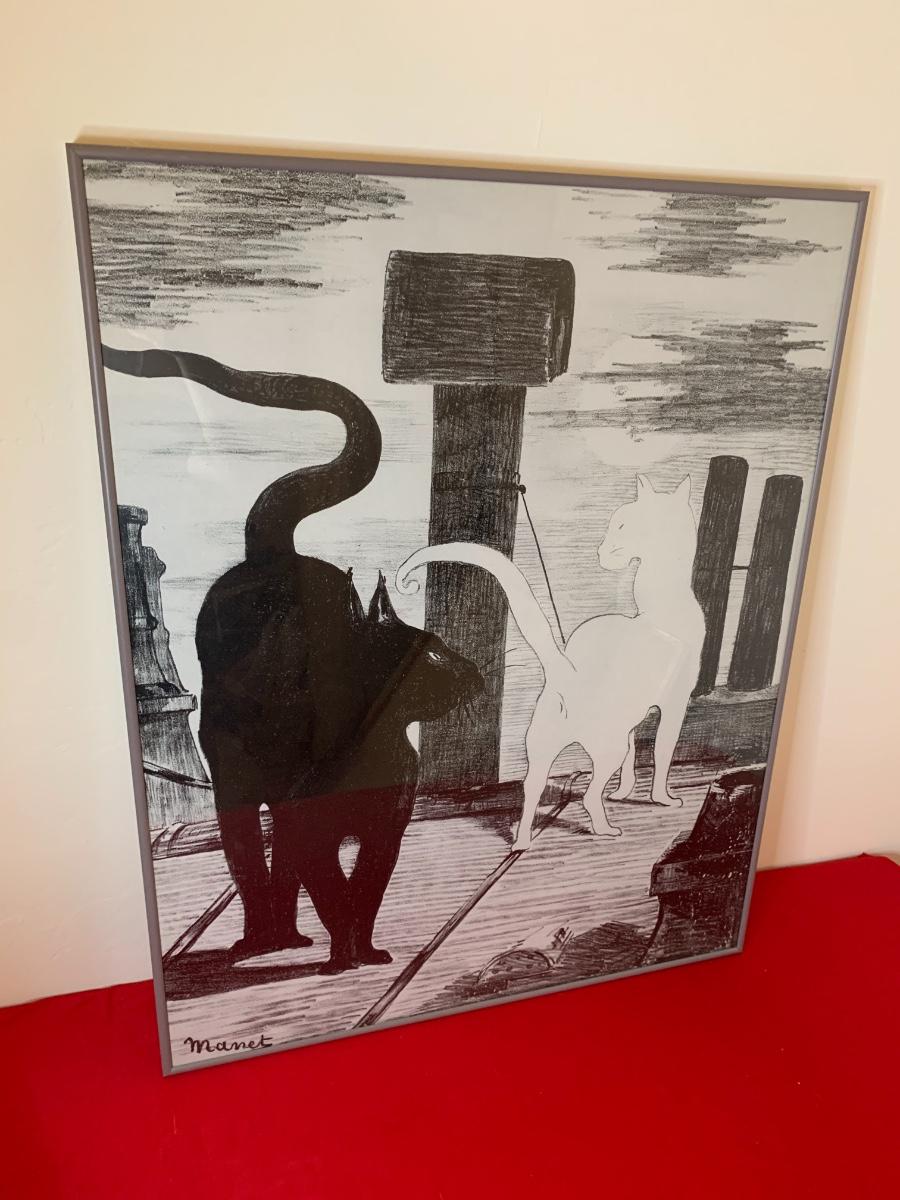 Black and white large scale Manet print of Rendezvous Cats. 33.5” x 26” in sturdy metal frame.