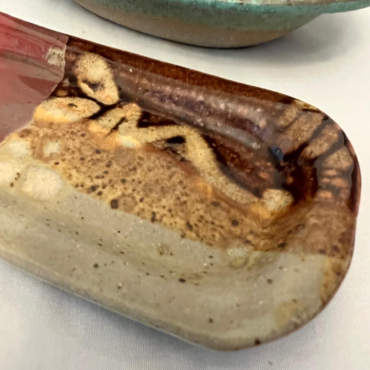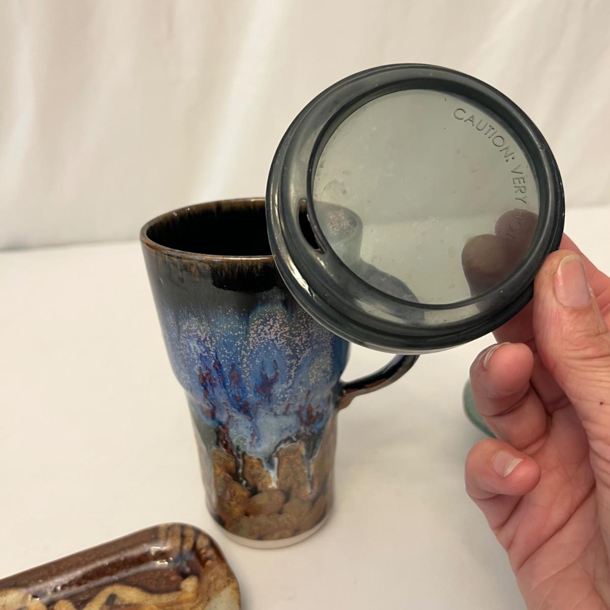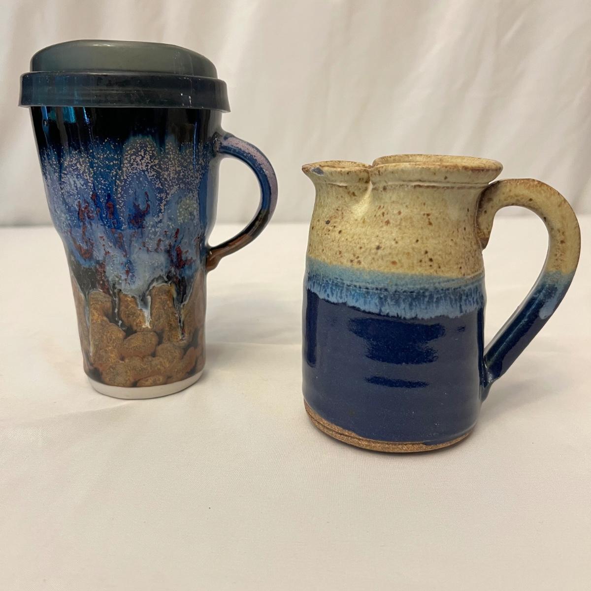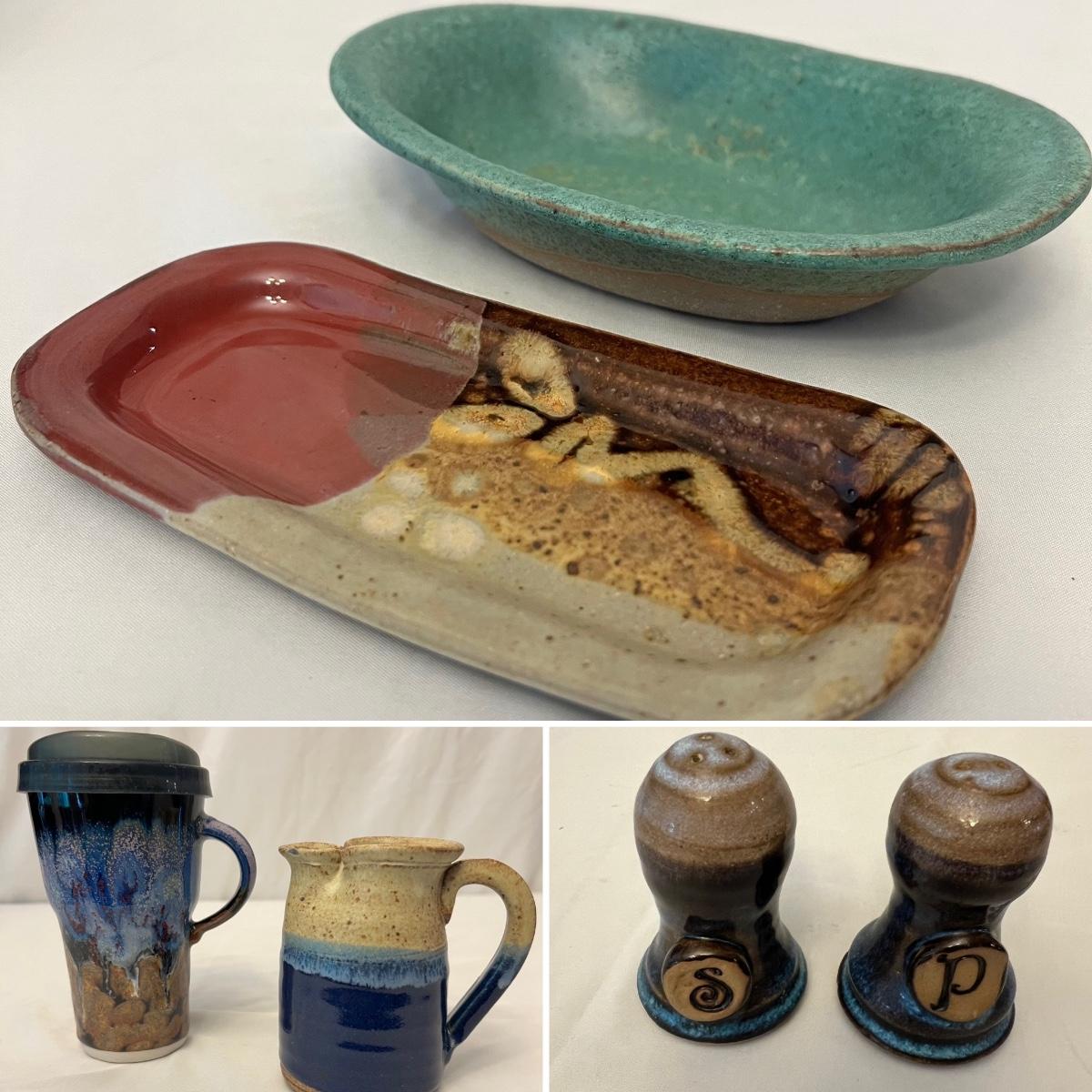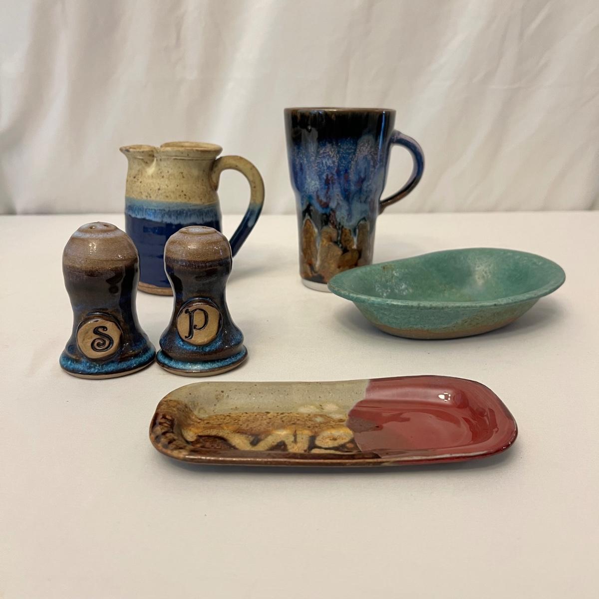 Six pieces of pottery includes two small dishes from Mangum Pottery. The teal glazed dish measures 4.5” x 7” x 1.5”H. Other items include S & P shakers, a mug with silicone top cover and a small pitcher. All pieces are signed; the pitcher has the faintest makers mark which is illegible.