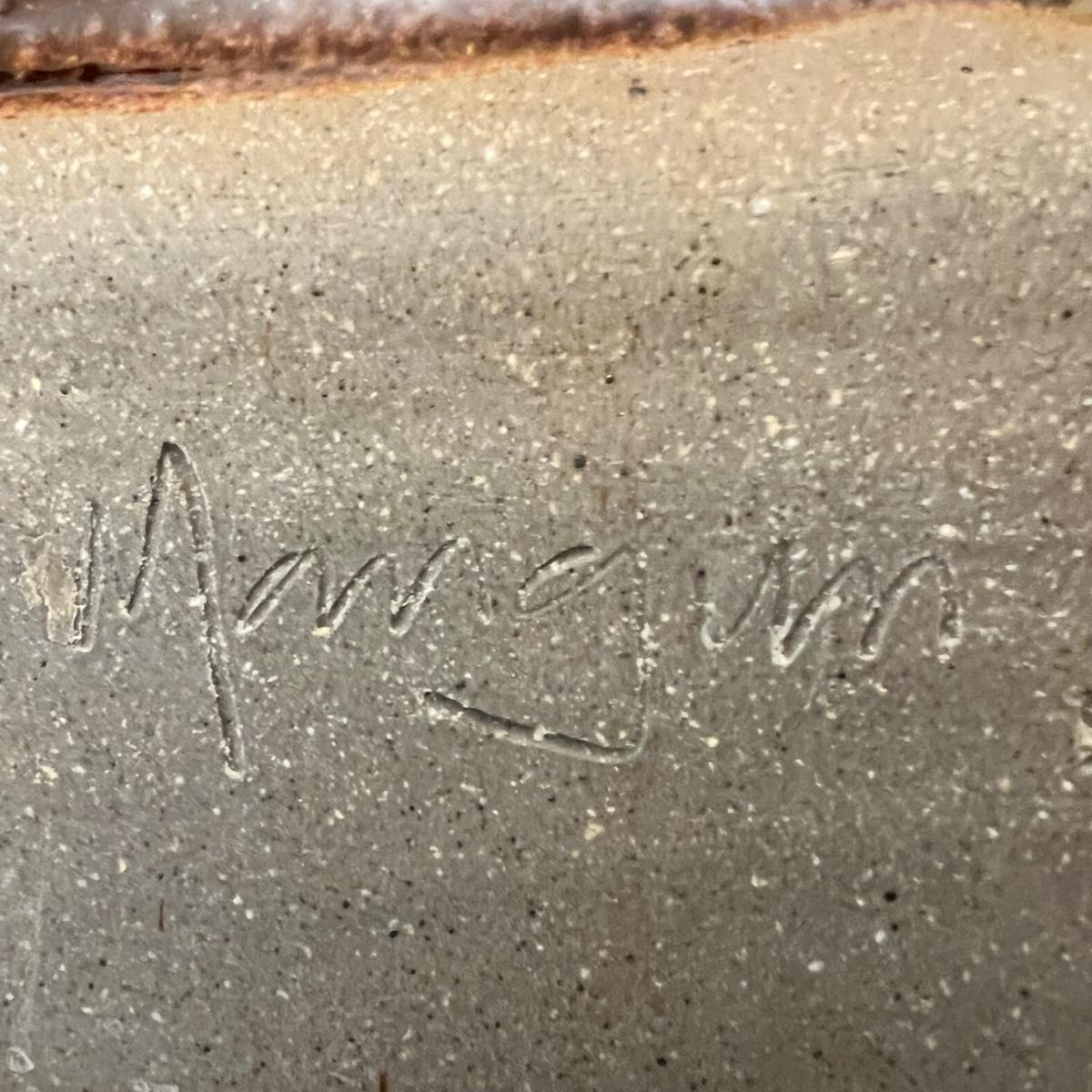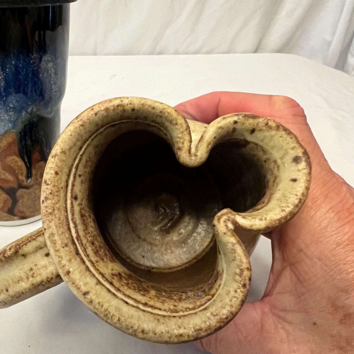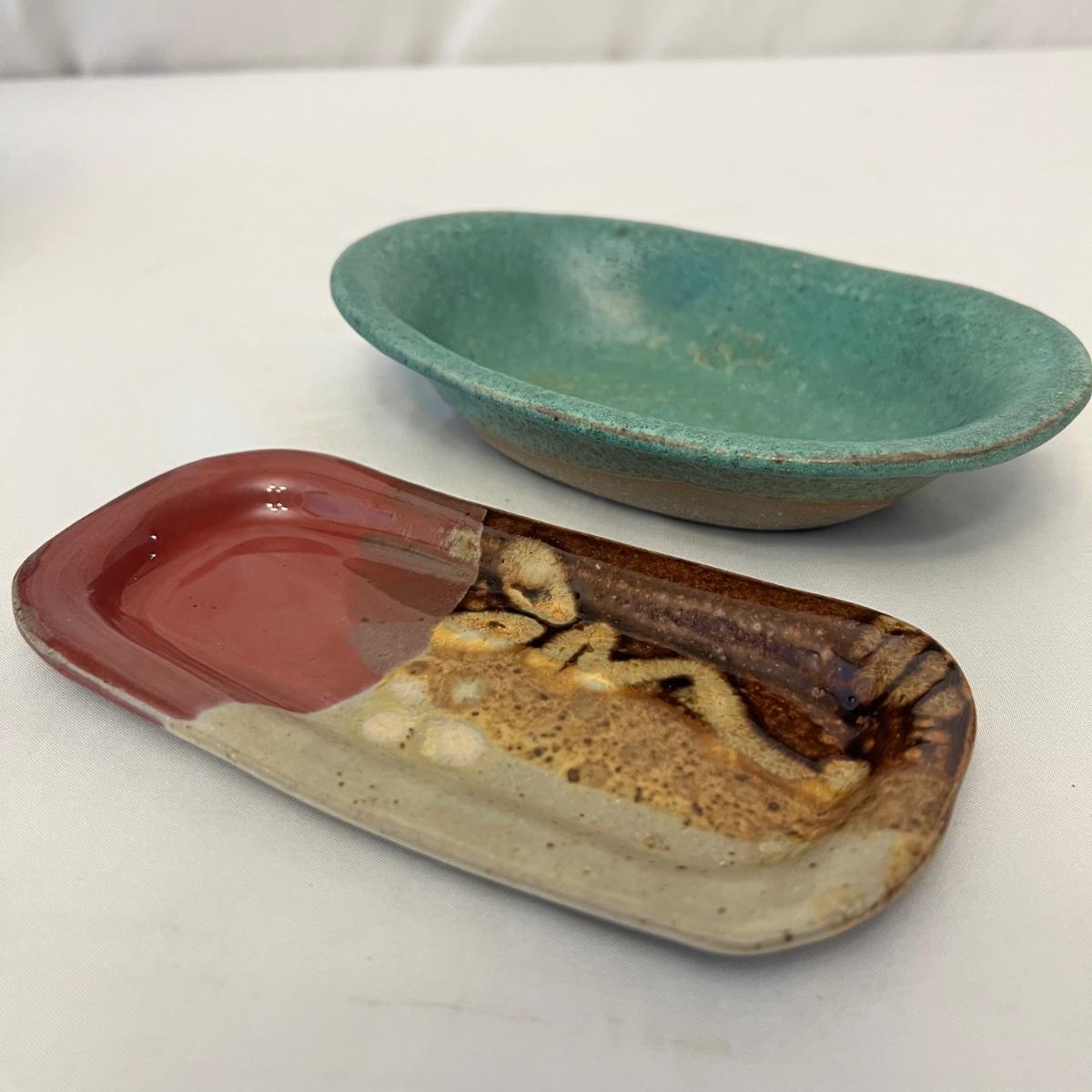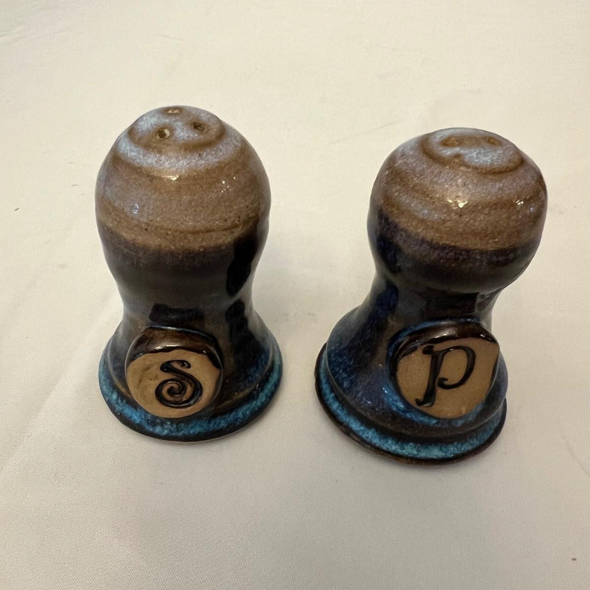 Six pieces of pottery includes two small dishes from Mangum Pottery. The teal glazed dish measures 4.5” x 7” x 1.5”H. Other items include S & P shakers, a mug with silicone top cover and a small pitcher. All pieces are signed; the pitcher has the faintest makers mark which is illegible.