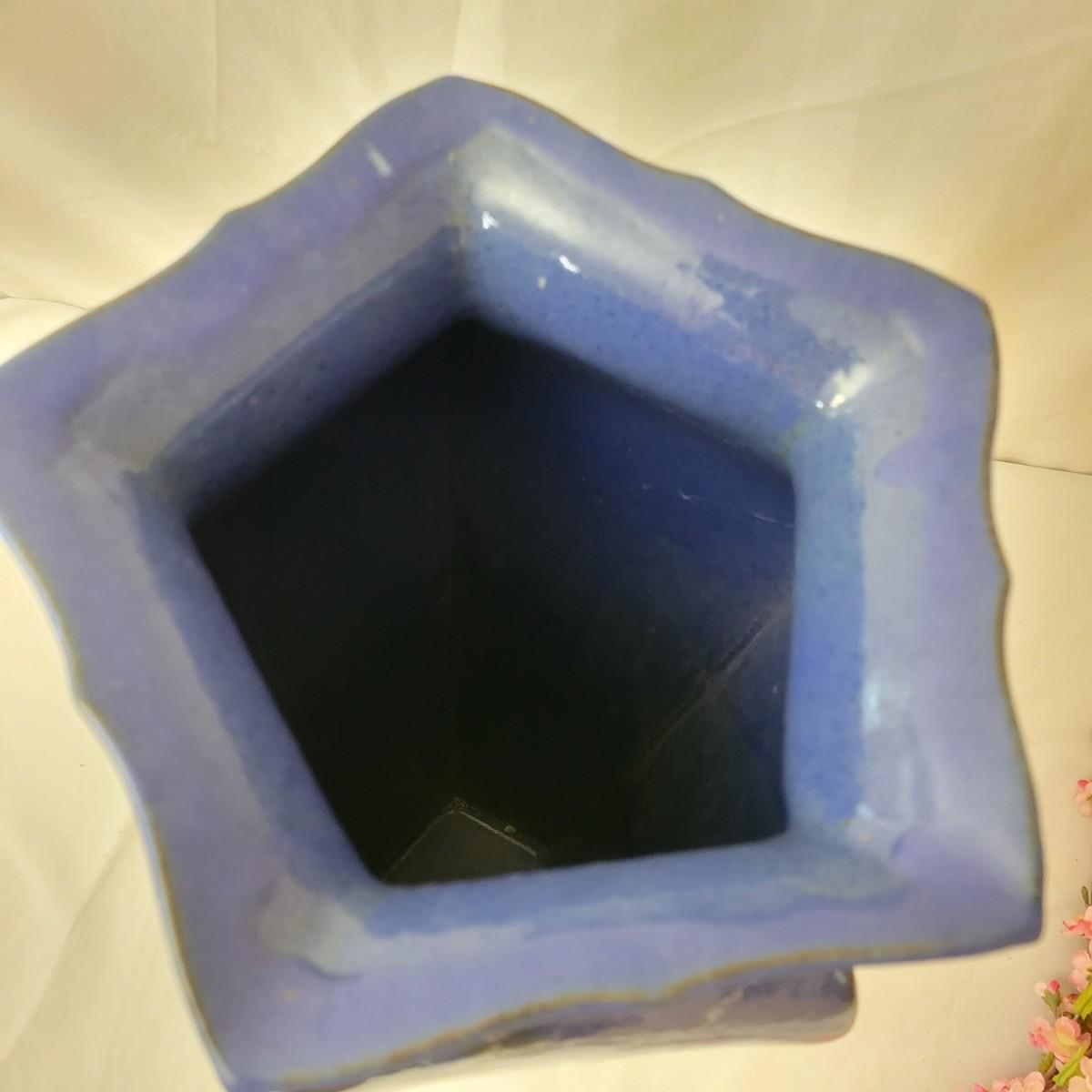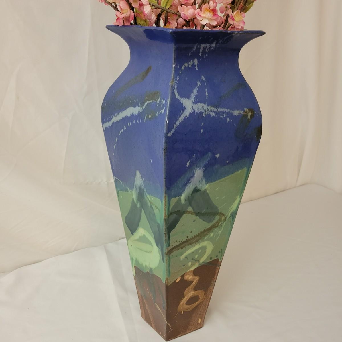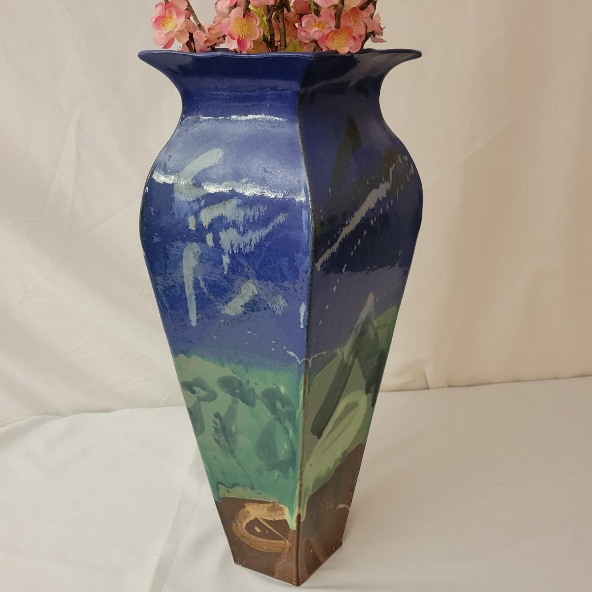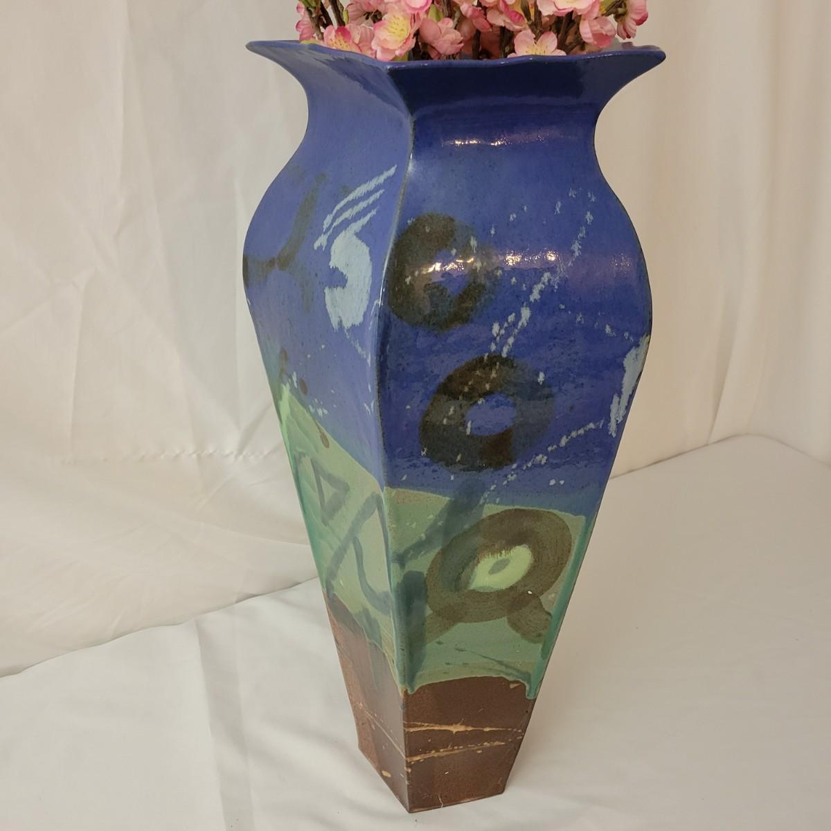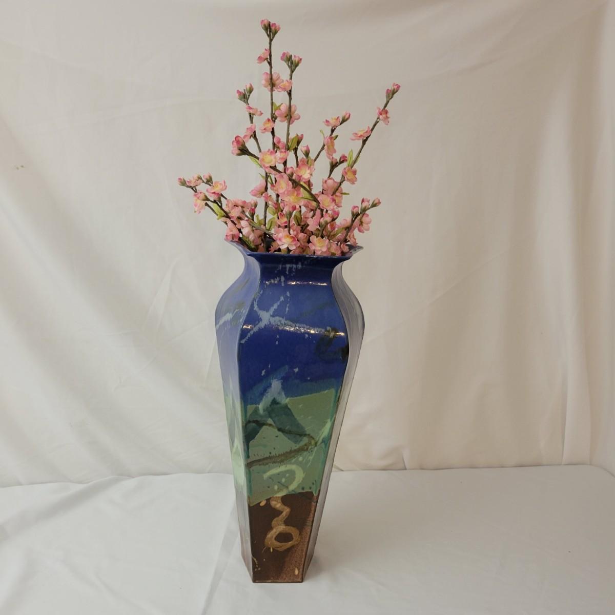 A five sided glazed vase handcrafted by local potters Mangum Pottery located in Weaverville, NC. This piece e rich glazes of blue, green and brick red. It also includes a bundle of silk cherry blossoms. It measures approximately 9.5"D x 22.5"H not including the cherry blossoms. Shipping available. Shipping can be costly. We suggest contacting our preferred local shipping provider, Postage Express, with dimensions and getting an estimate before bidding: (828) 670-5501 or postageexpress@yahoo.com.