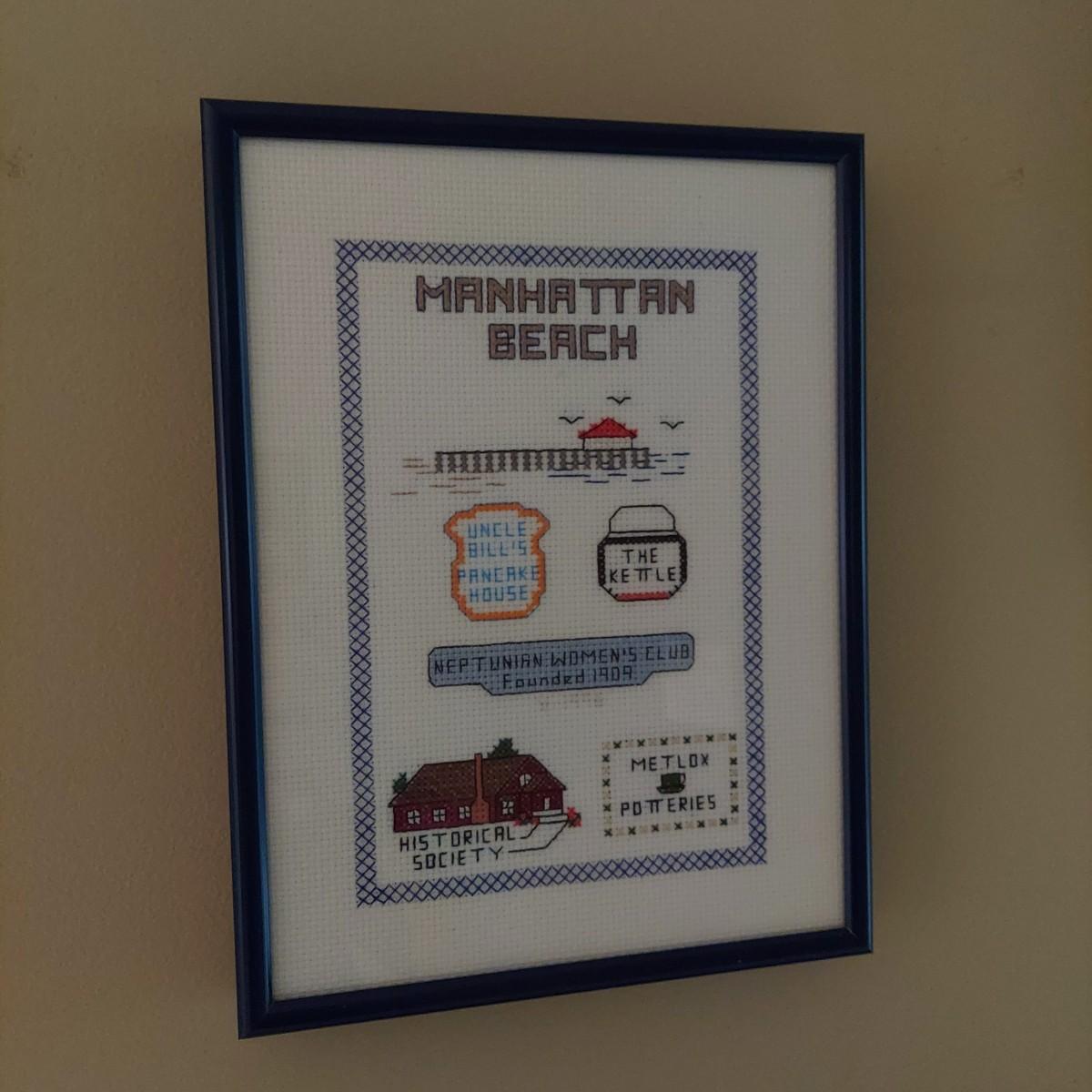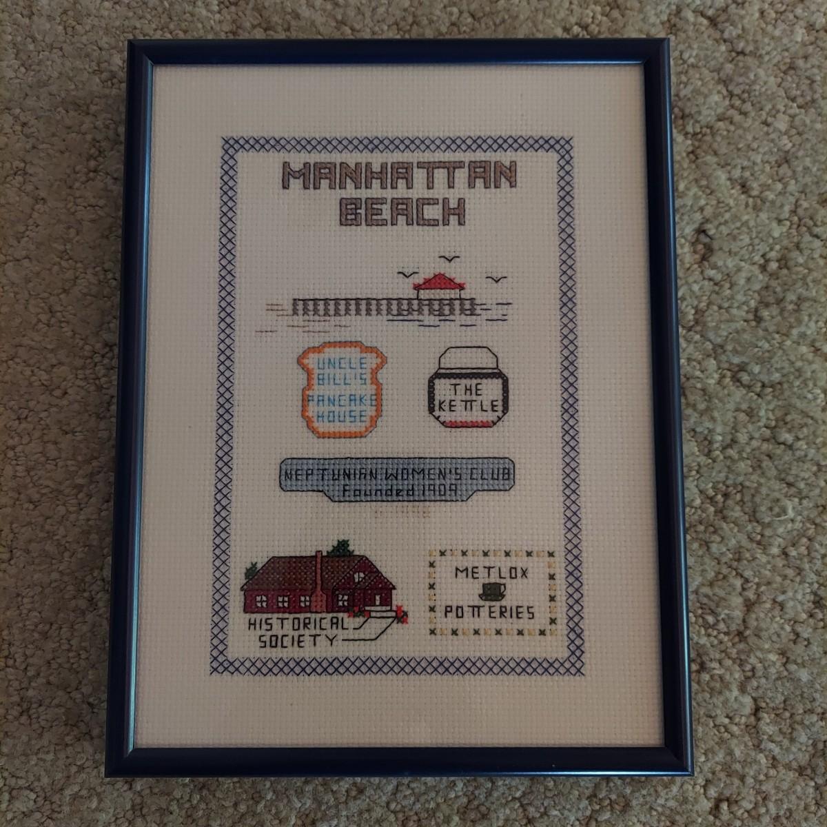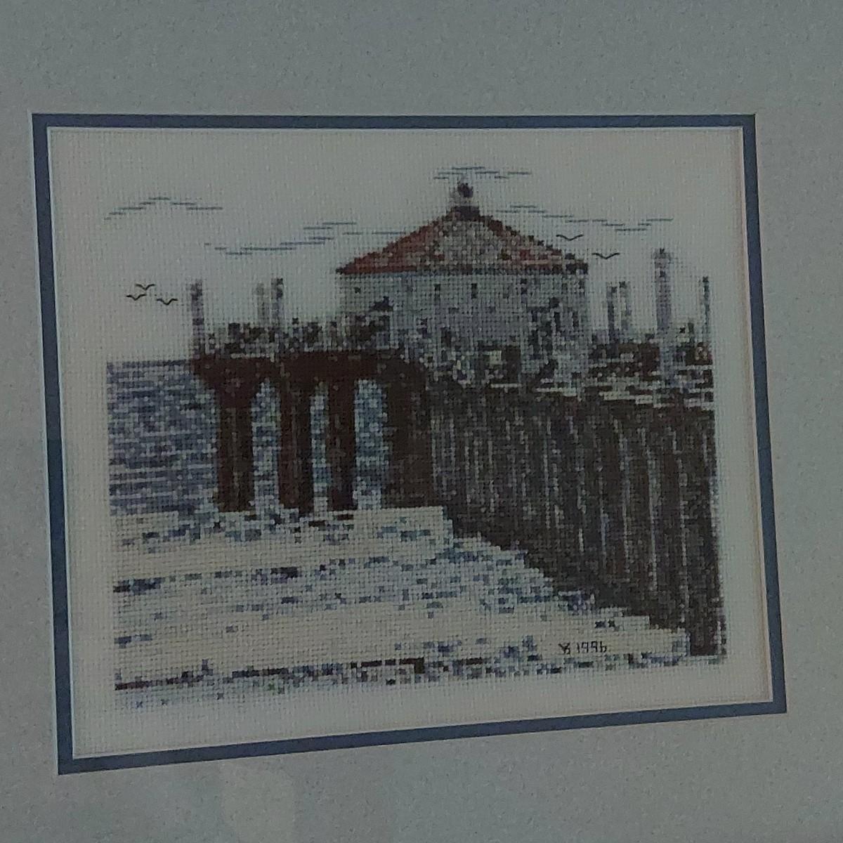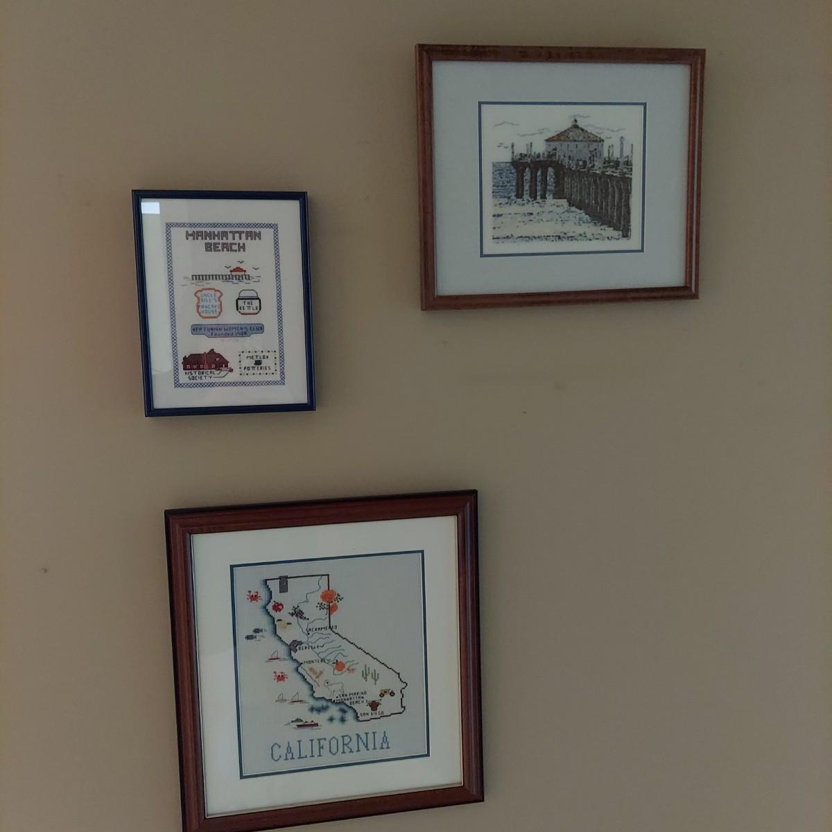 Three framed cross stitch pieces representing Manhattan Beach, California. Two are double matted. The small blue frame is approximately 7.5" x 1" x 10"H. The medium wood frame is approximately 14" x 1" x 12"H. The large frame is 15" x .75" x 16"H. Shipping available. Shipping certain items can be costly. We suggest contacting our preferred local shipping provider, Postage Express, with dimensions and getting an estimate before bidding: (828) 670-5501 or postageexpress@yahoo.com.