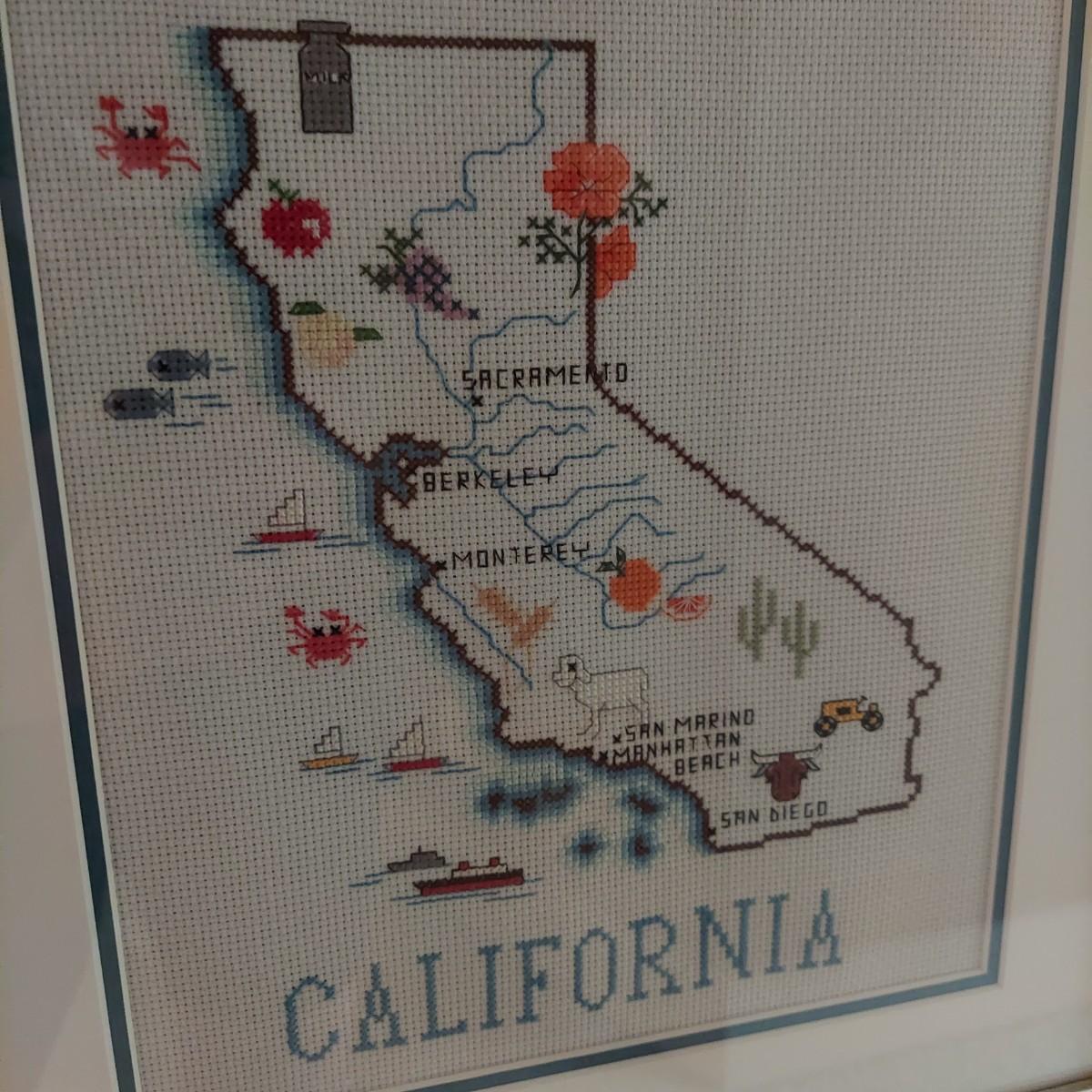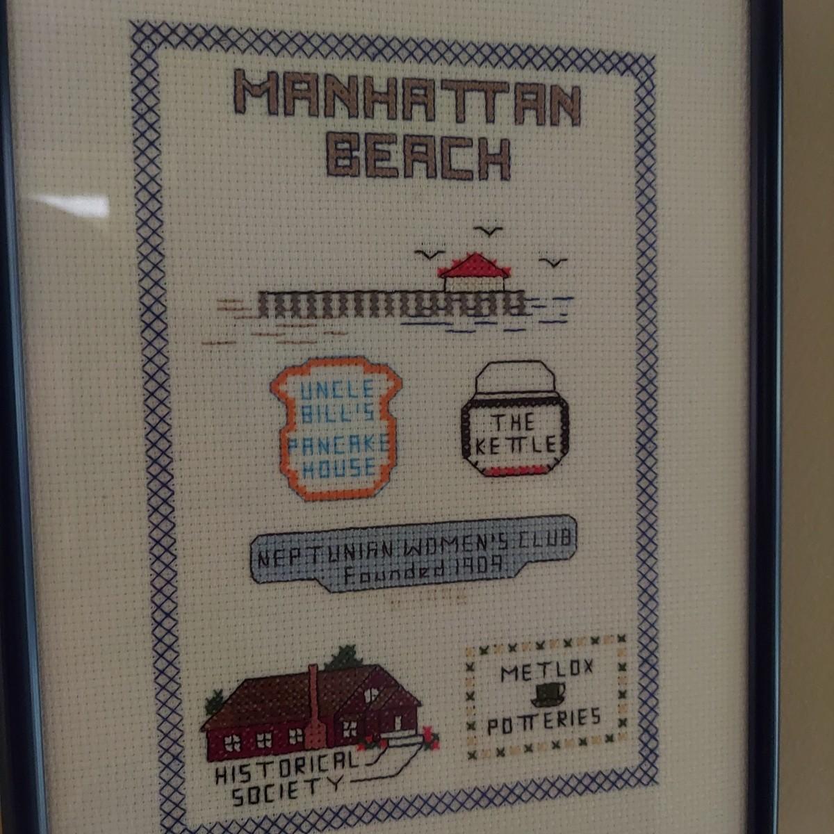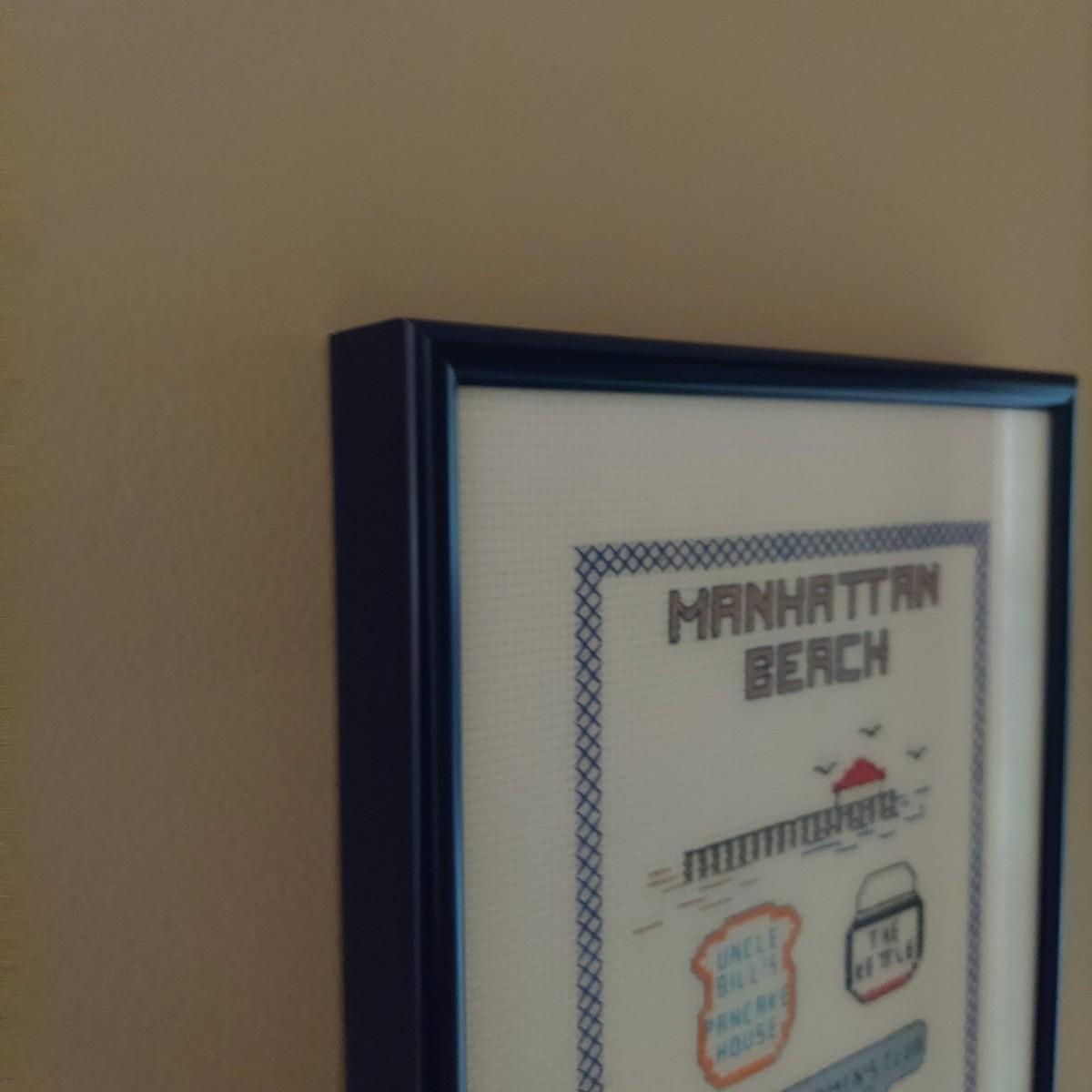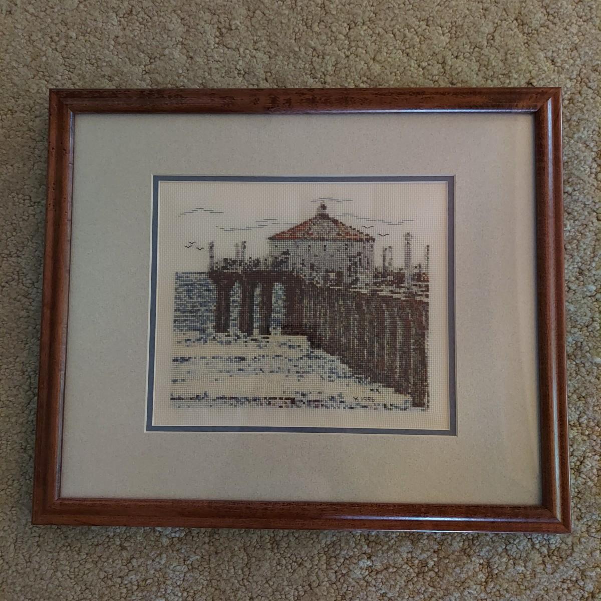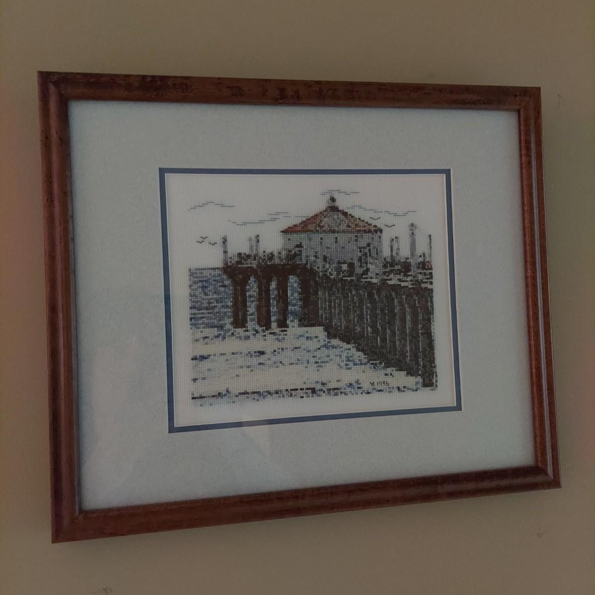 Three framed cross stitch pieces representing Manhattan Beach, California. Two are double matted. The small blue frame is approximately 7.5" x 1" x 10"H. The medium wood frame is approximately 14" x 1" x 12"H. The large frame is 15" x .75" x 16"H. Shipping available. Shipping certain items can be costly. We suggest contacting our preferred local shipping provider, Postage Express, with dimensions and getting an estimate before bidding: (828) 670-5501 or postageexpress@yahoo.com.
