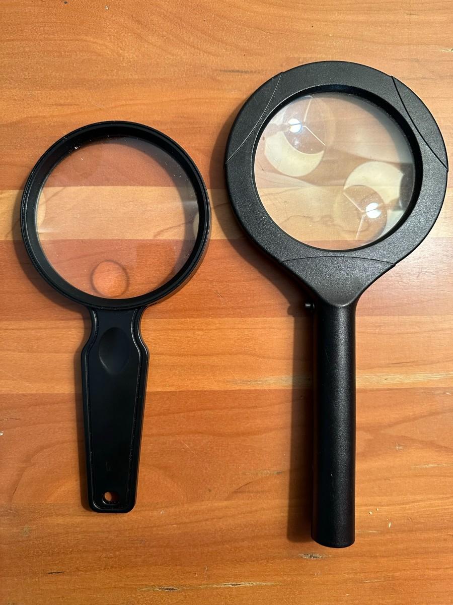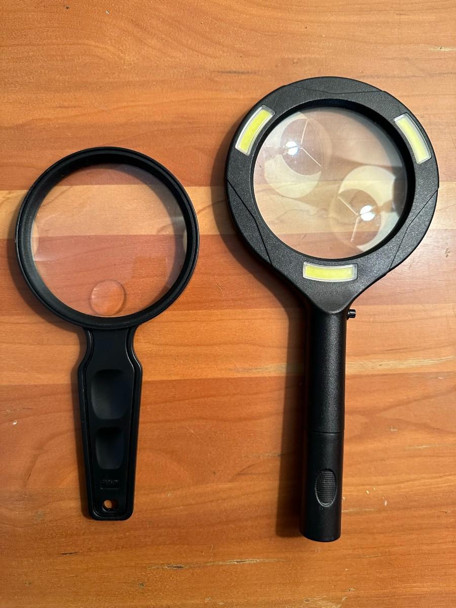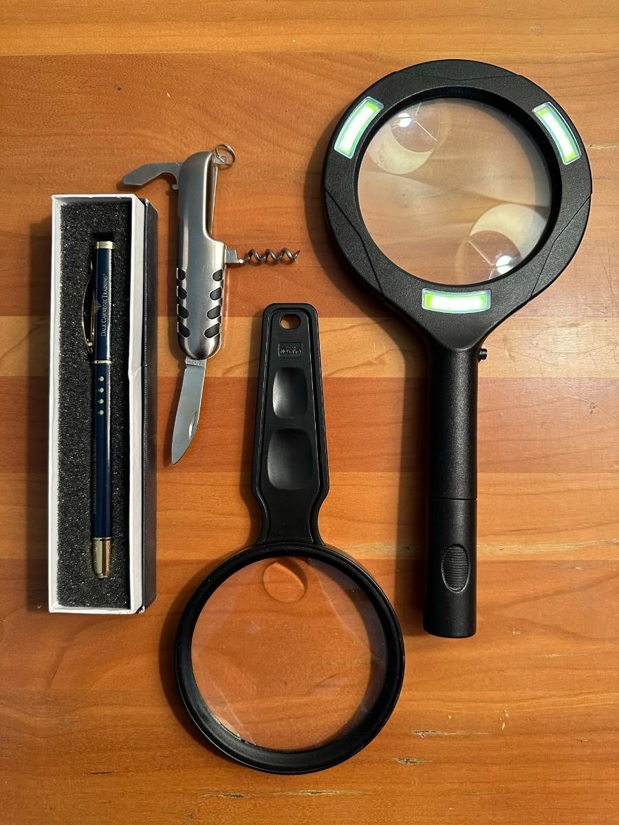 Manifier with light, magnifing glass, pocket knife with corkscrew & writing pen with box