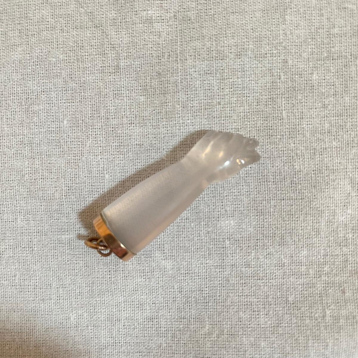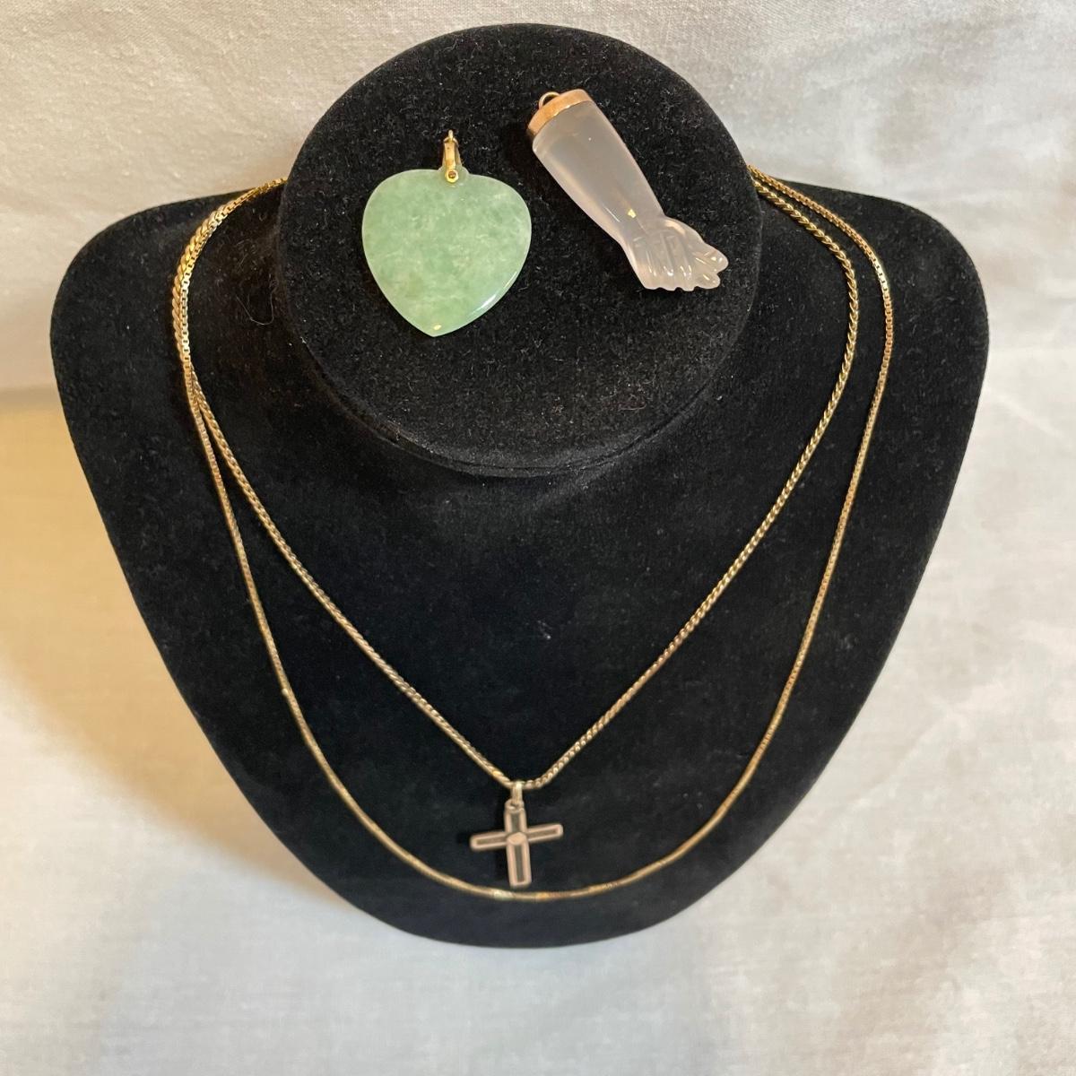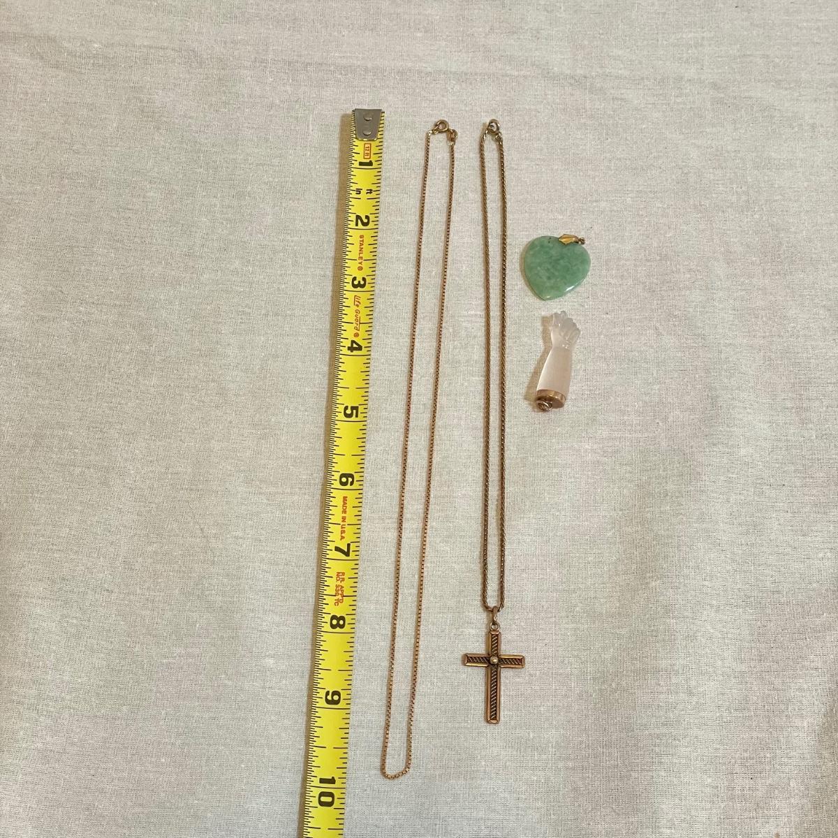Carved gem in a Mano Figa pose for good luck and protection appears to be a rose quartz - it has a very mild pink hue to it. Lot includes a heart shape jade-like pendant, a cross on a chain marked 1/20 12K GF and a 20” gold chain marked 14K with other illegible markings. See images. Shipping available. All sales are final. No returns or refunds. Please bid accordingly.