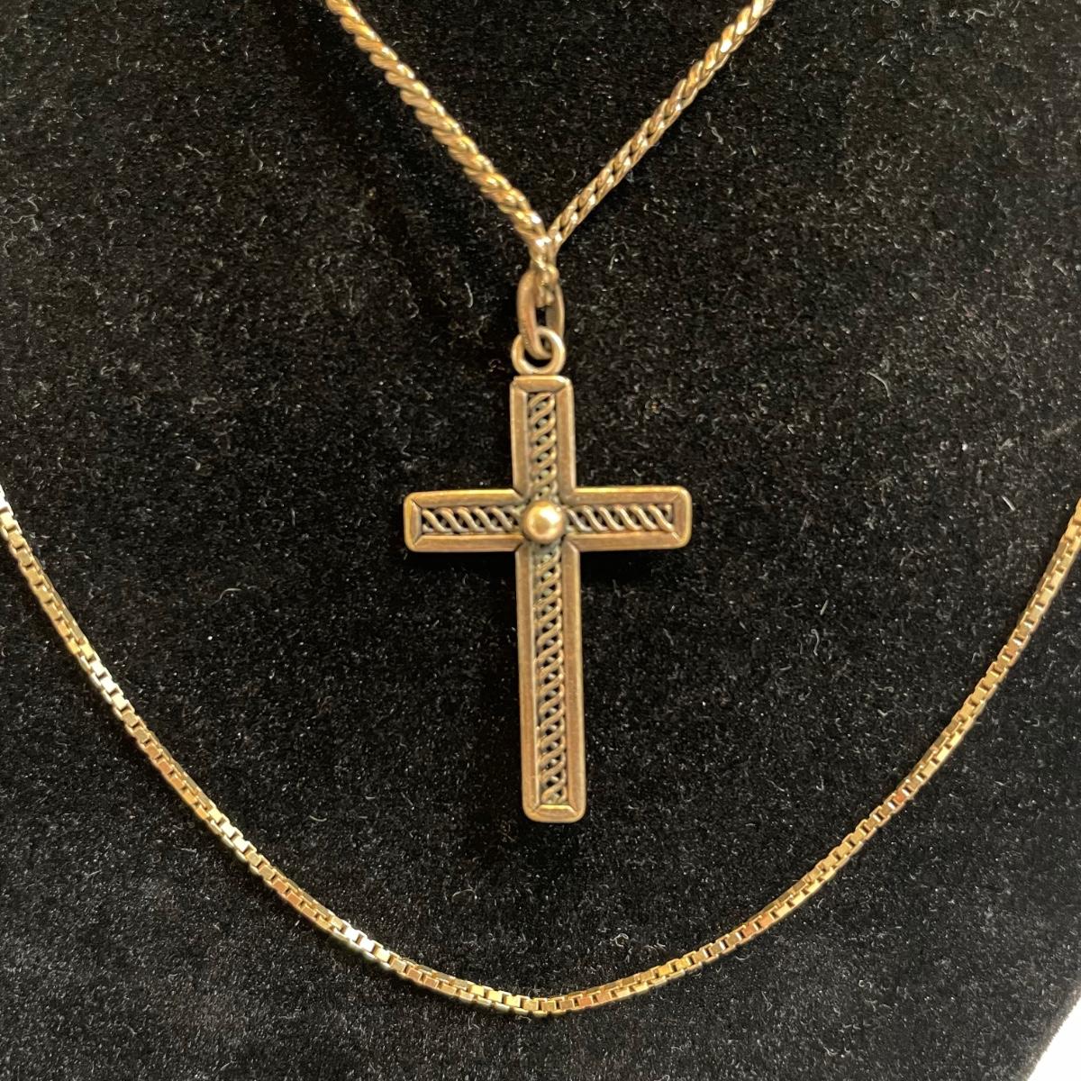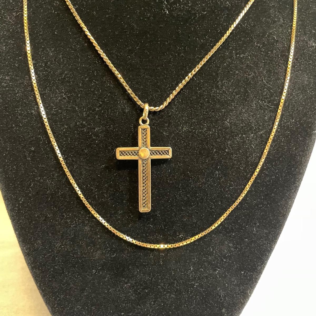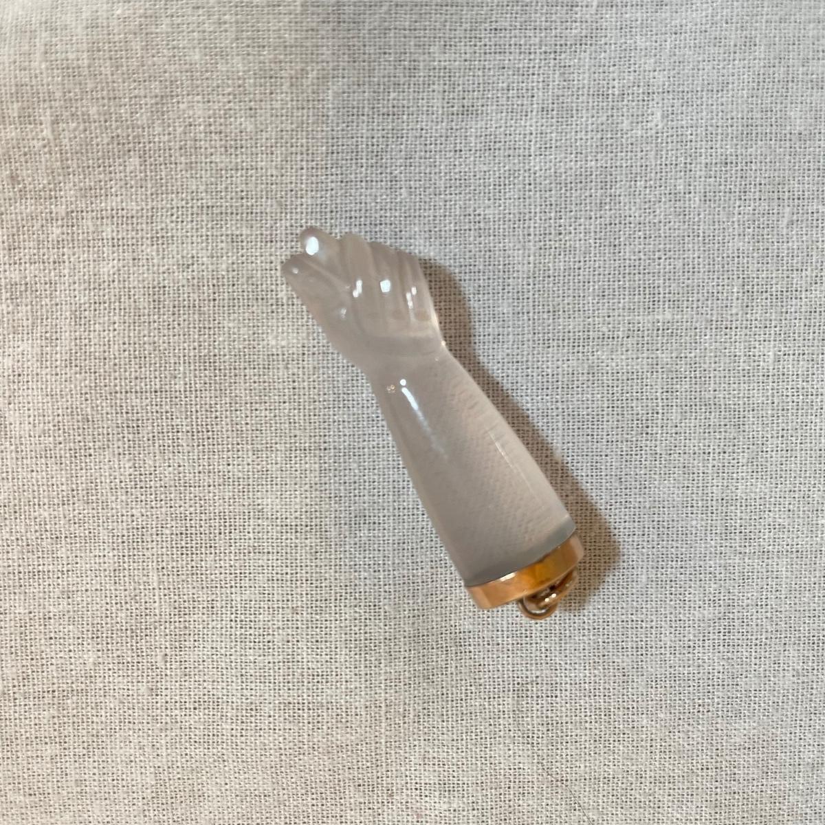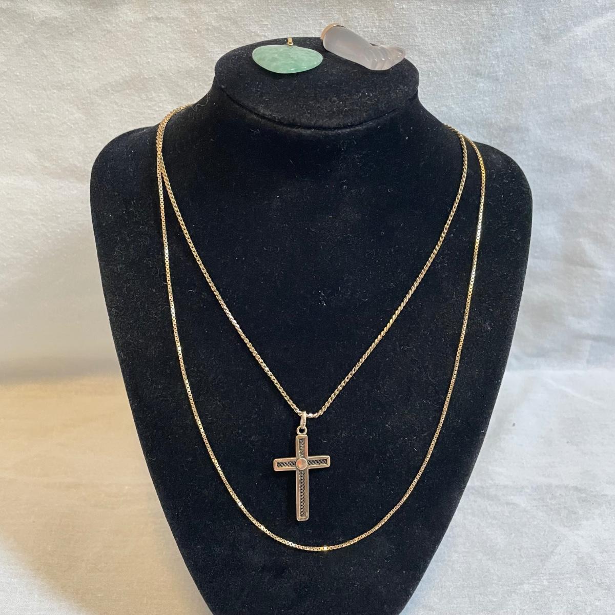 Carved gem in a Mano Figa pose for good luck and protection appears to be a rose quartz - it has a very mild pink hue to it. Lot includes a heart shape jade-like pendant, a cross on a chain marked 1/20 12K GF and a 20” gold chain marked 14K with other illegible markings. See images. Shipping available. All sales are final. No returns or refunds. Please bid accordingly.