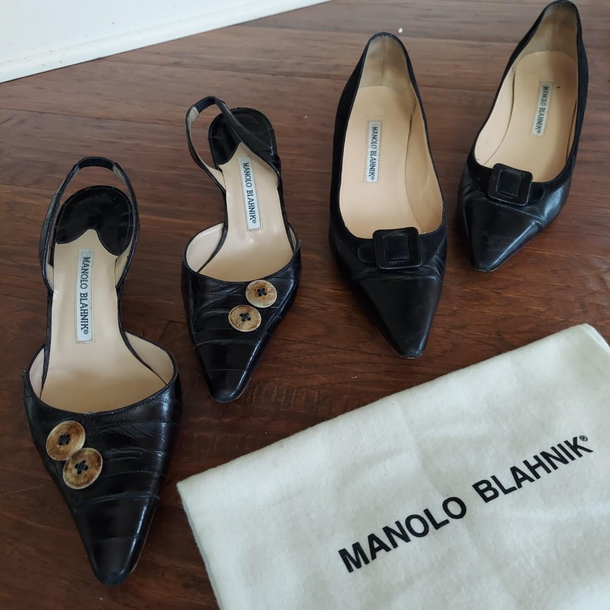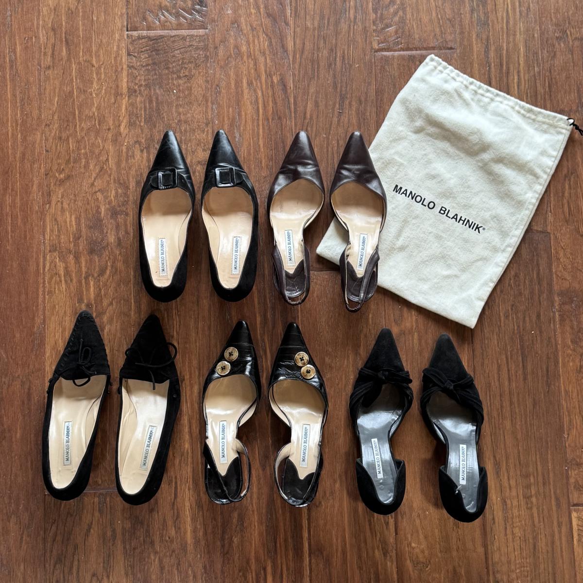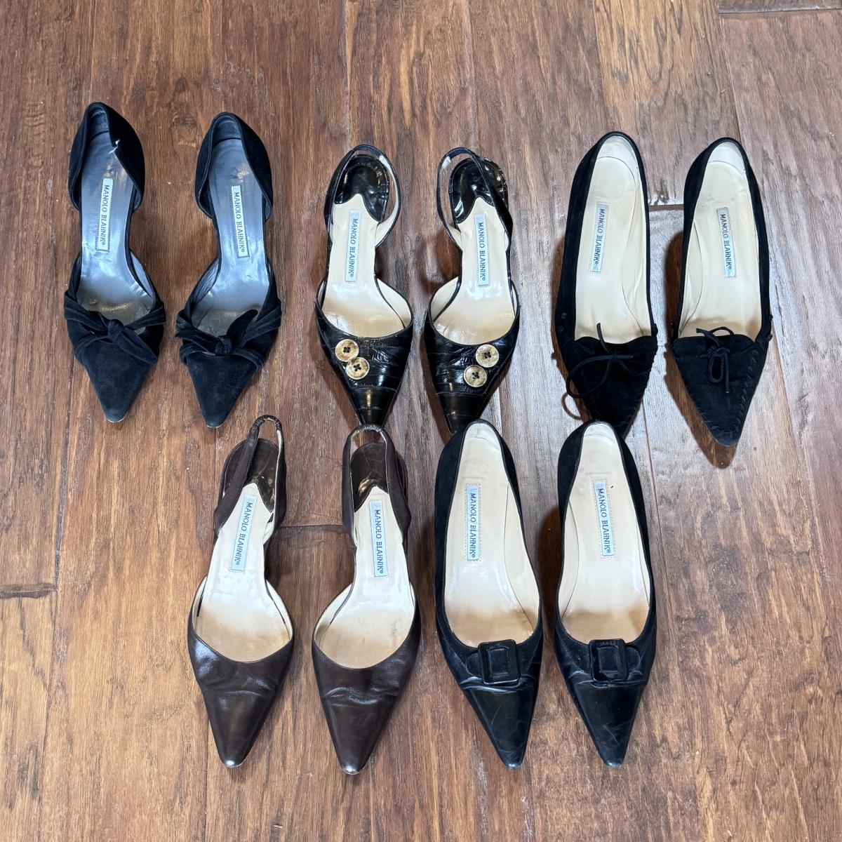 This lot includes five pairs of Manolo Blahnik women’s kitten heels. All sized at 38 1/2. All shoes has decent wear on the leather souls - see pictures included. The shoes come with one Manolo Blahnik dust bag. Shipping available.