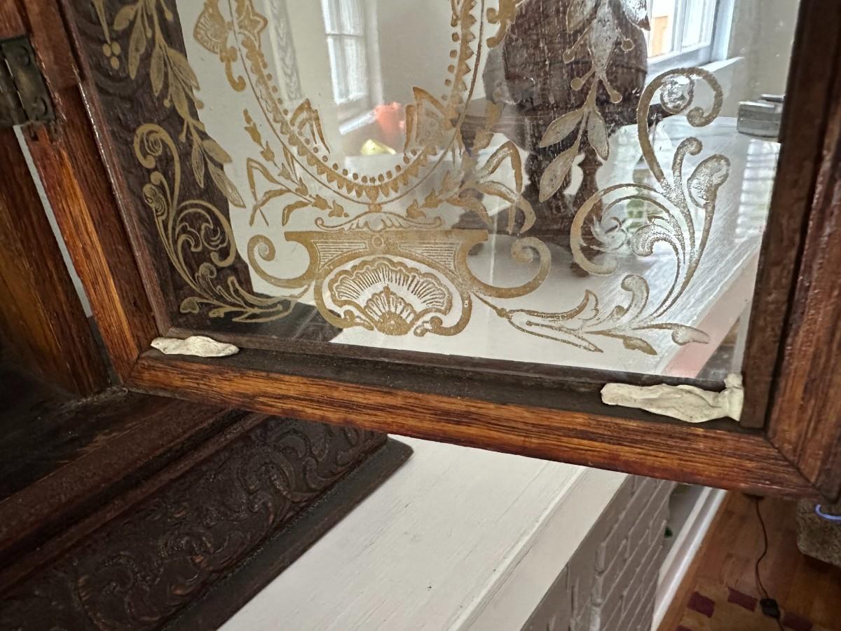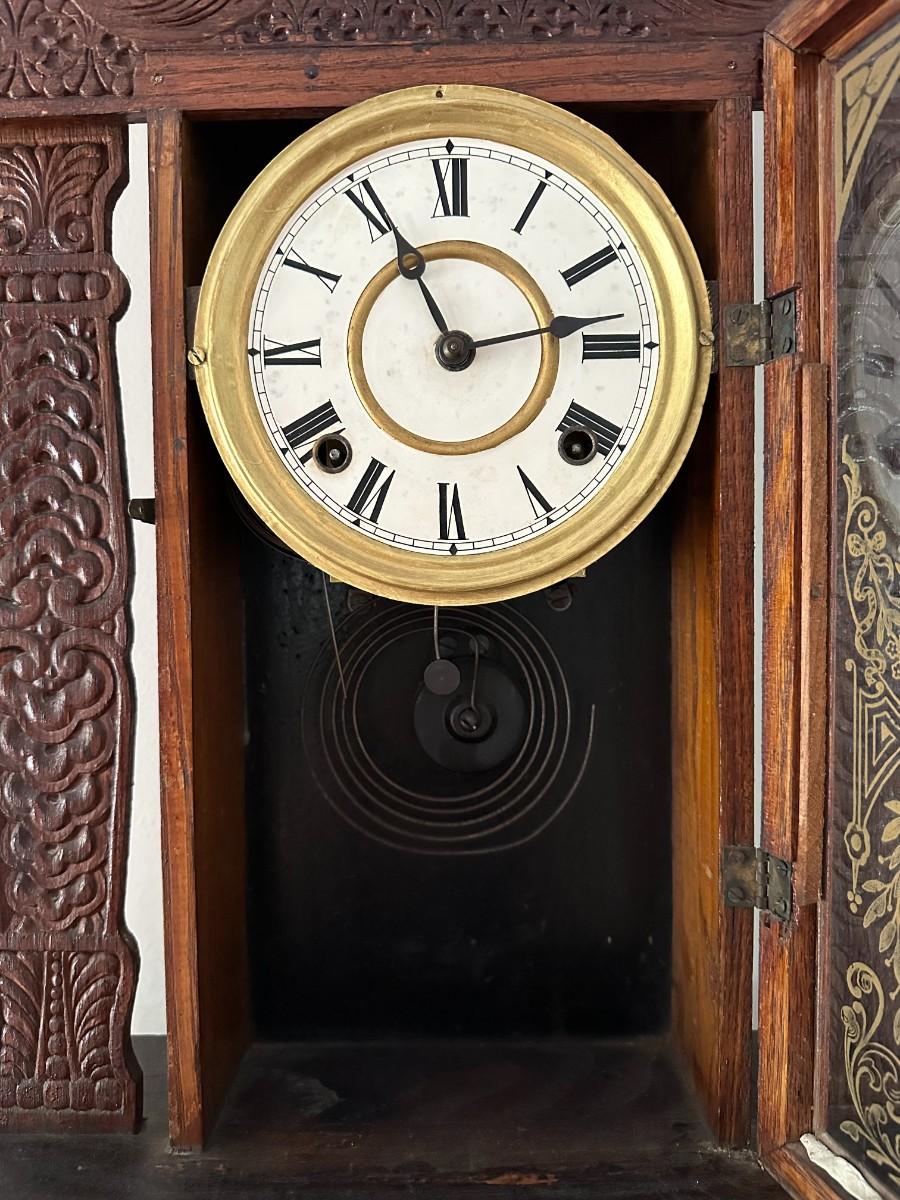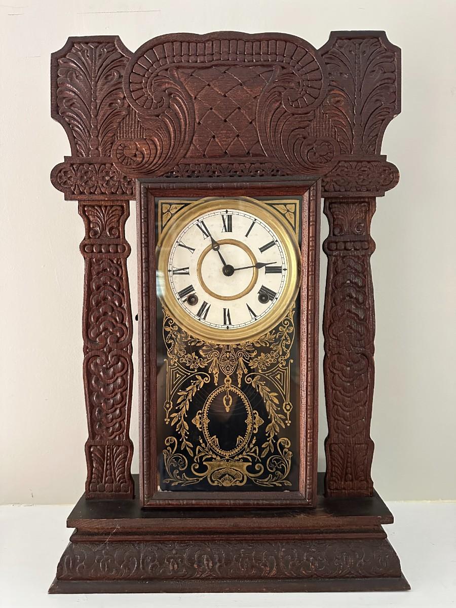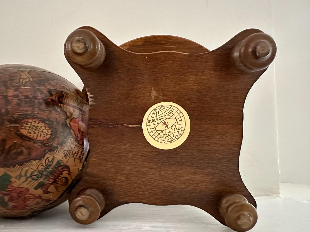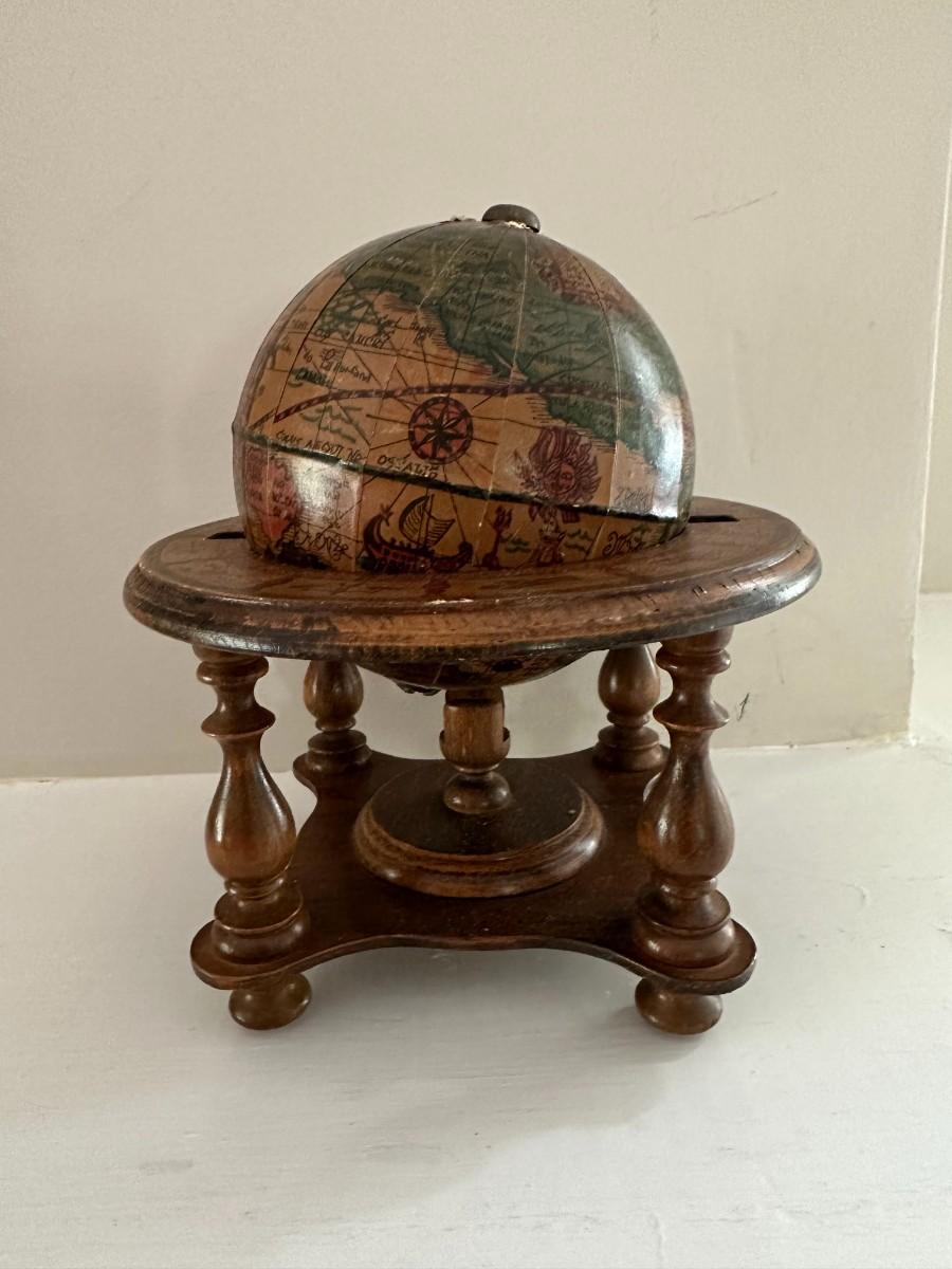 Wood Mantel Clock is 14.24"w x 22.5"h x 5"d and is not in working order. Small globe has stand but is missing ring around globe, 7.5"h x 6.5"w in stand